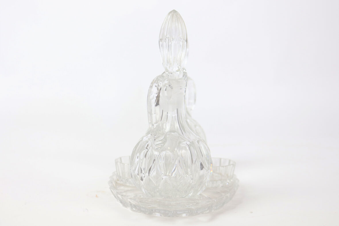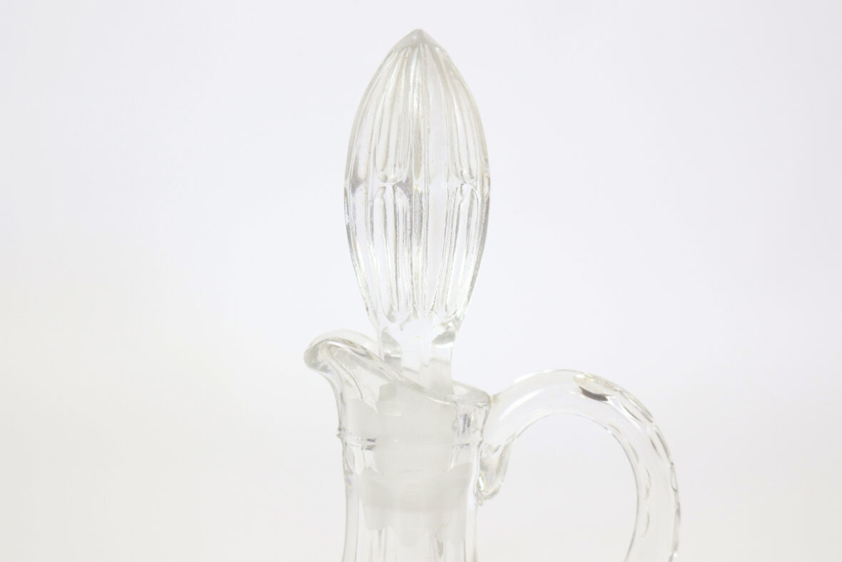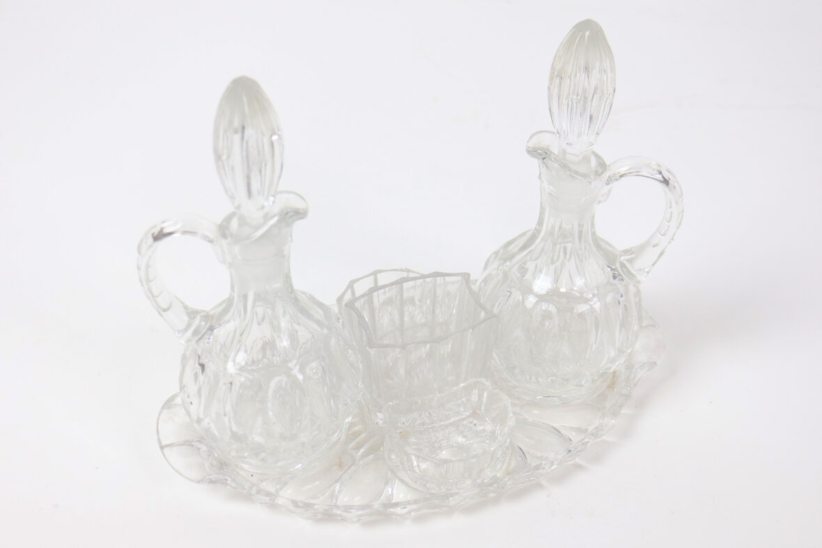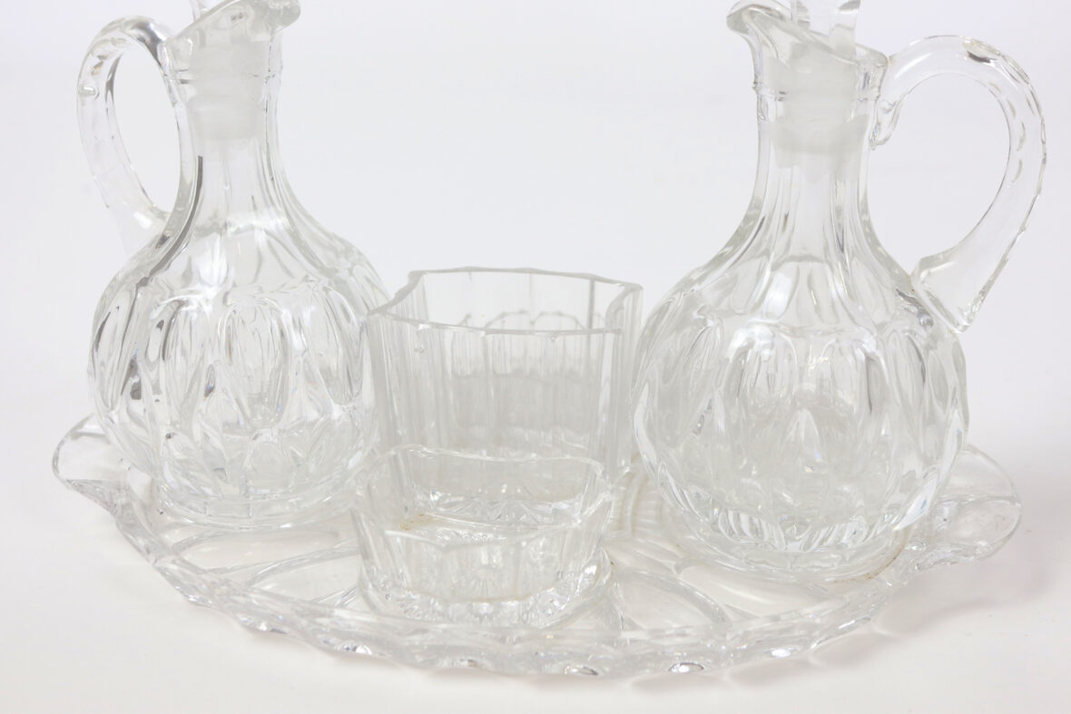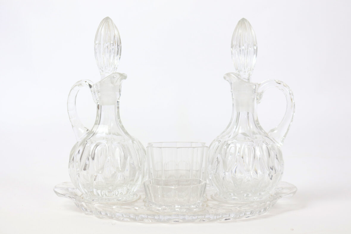 Huilier et vinaigrier en verre taillé et son présentoir. XXe. Haut. : 19 cm
