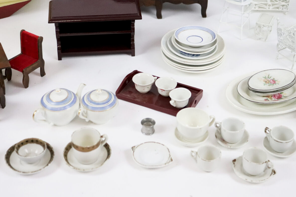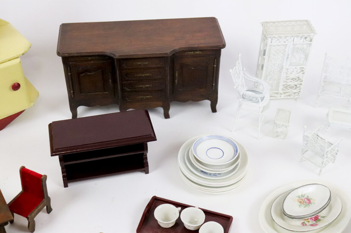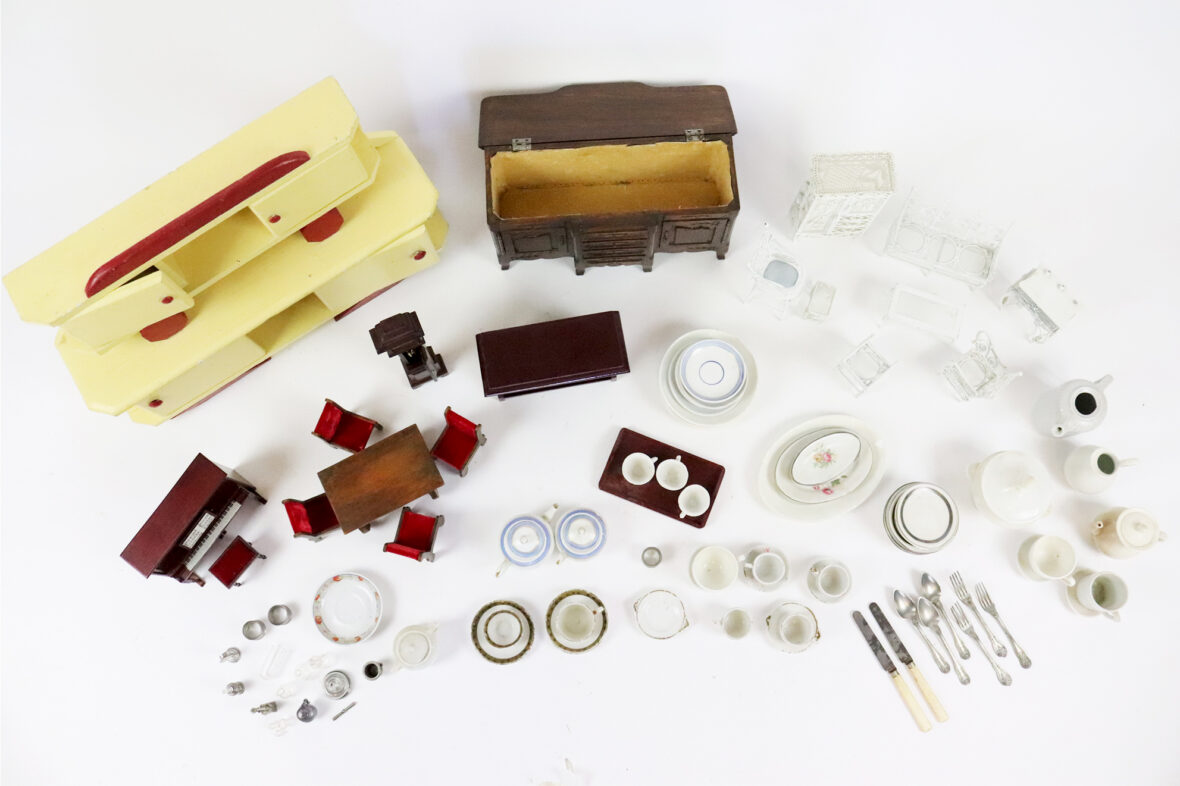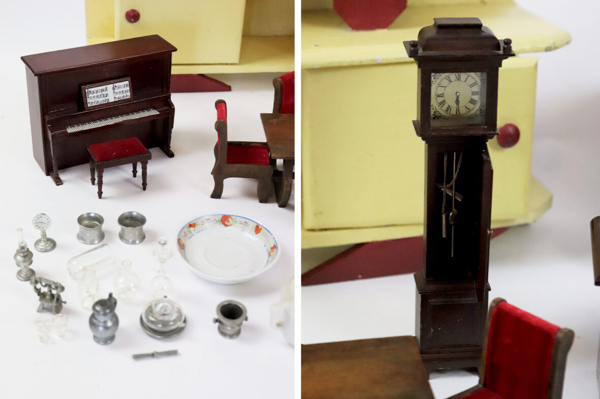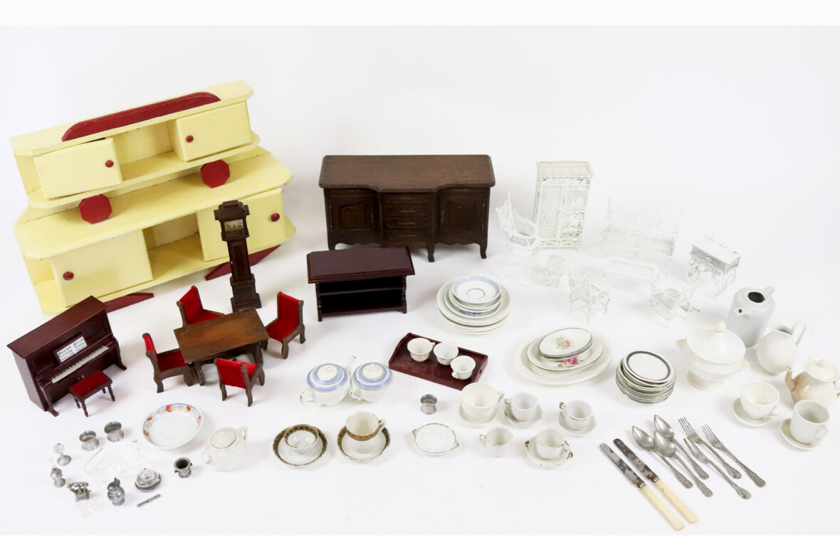 Important ensemble de mobilier et vaisselle de poupée comprenant notamment un petit buffet deux corps jaune, un piano et son banc, une horloge de parquet, une table en bois et ses 4 chaises, une console, un buffet formant coffre, tasses et sous-tasses, assiettes, verseuses, soupière, théière, lampe à pétrole, téléphone, etc.