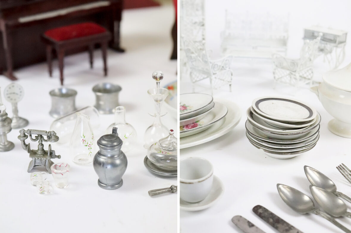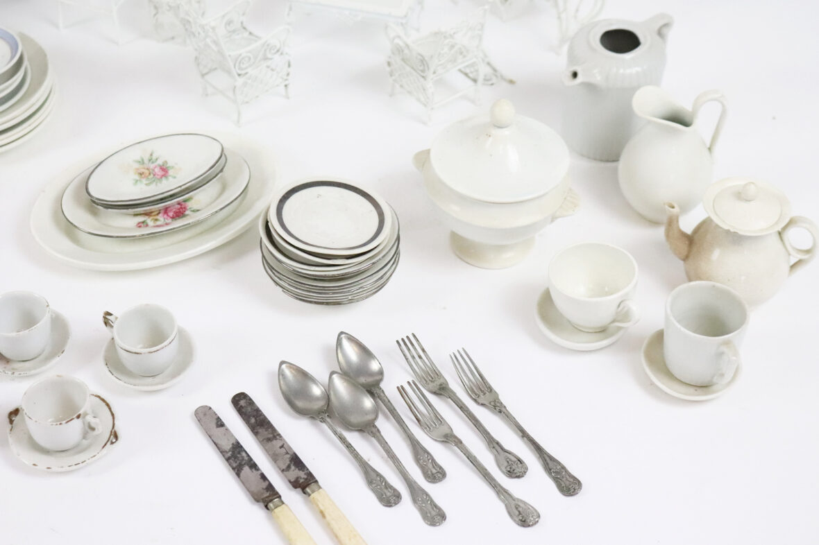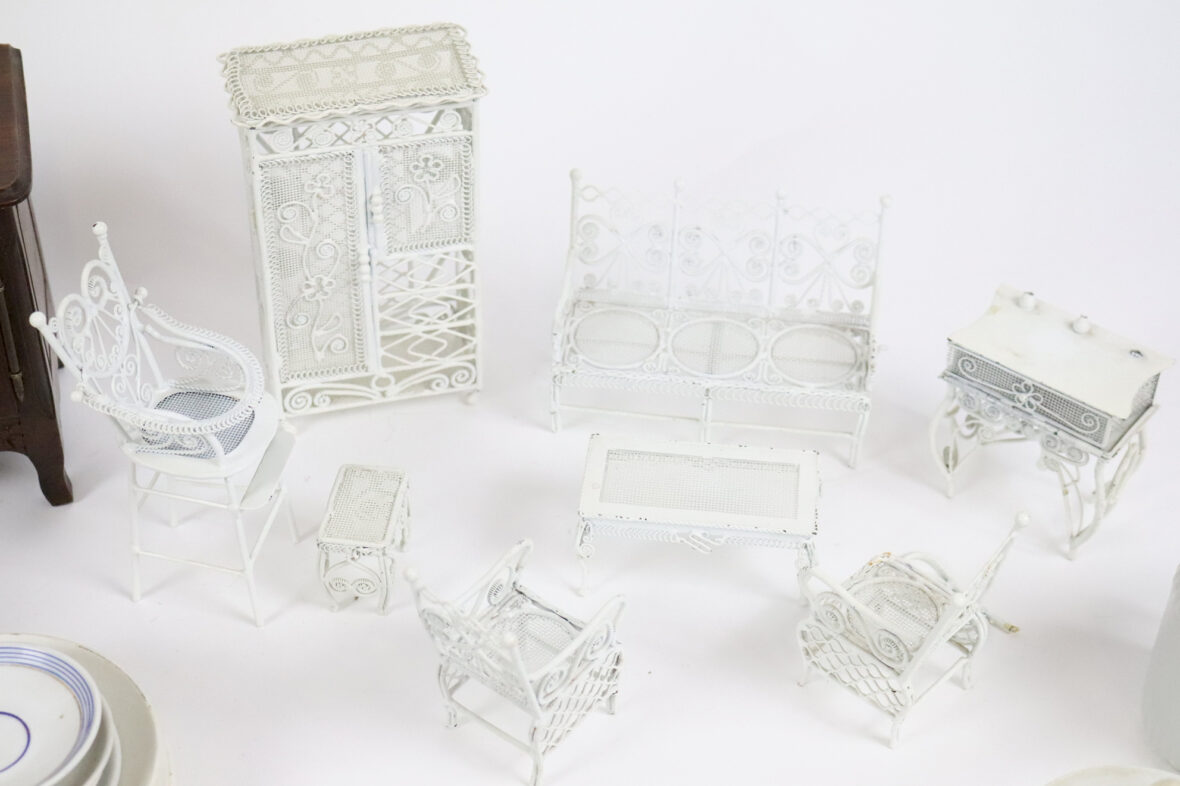 On y joint un ensemble de mobilier ancien pour maison de poupée en métal laqué blanc comprenant une chaise haute, une armoire, une banquette et deux fauteuils, une table basse, un bureau et un repose-pieds.