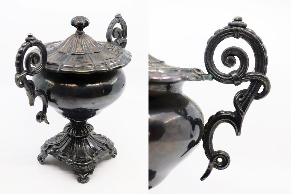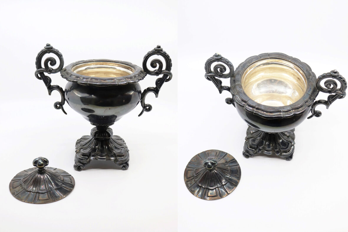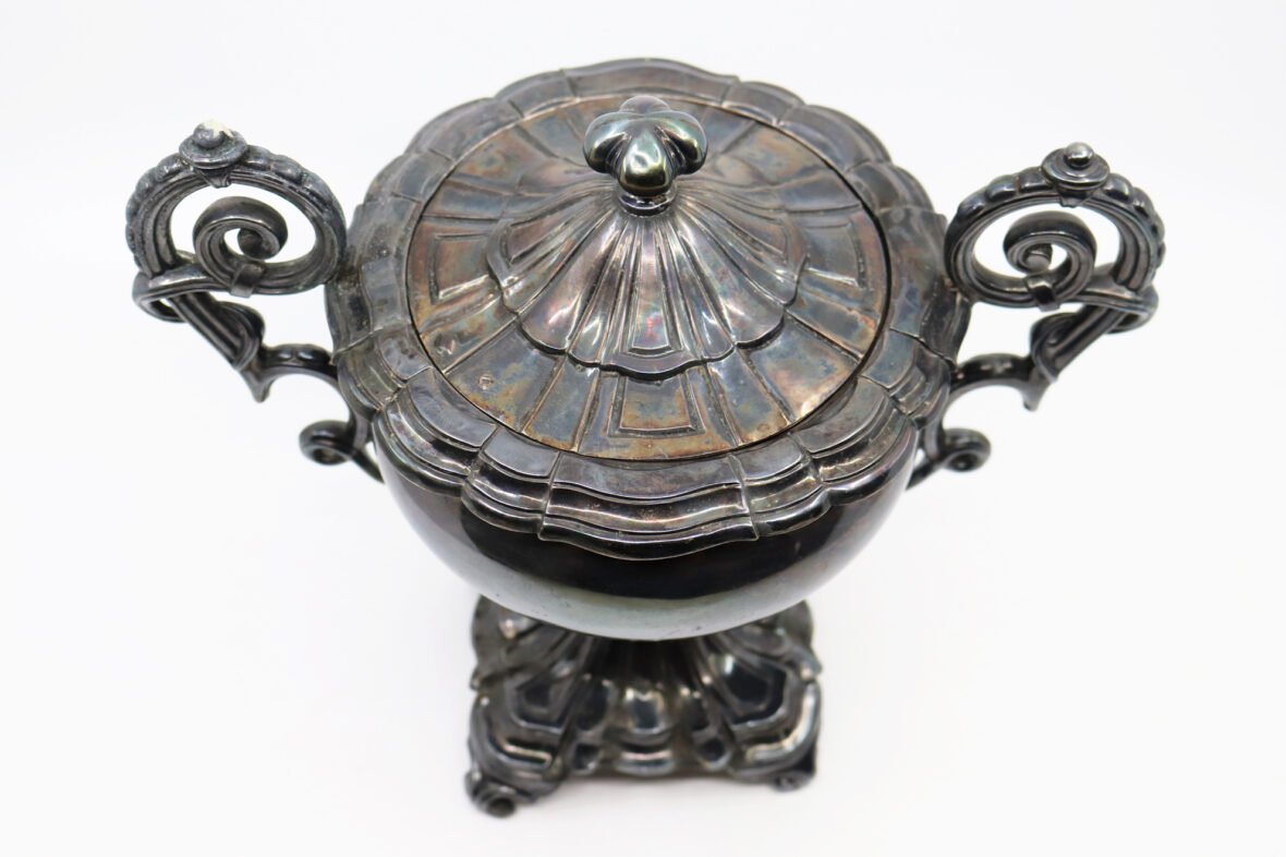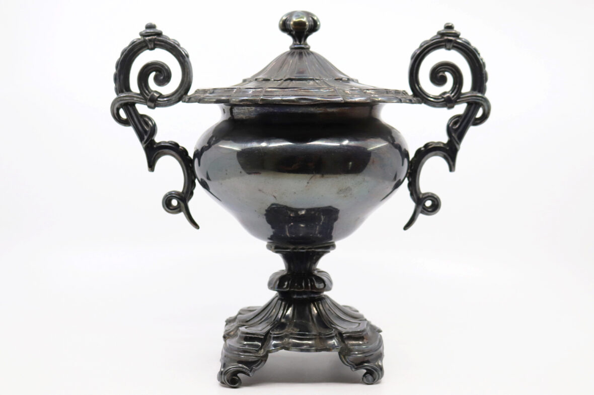 Important sucrier en argent de forme balustre à décor mouvementé, la base reposant sur quatre petits pieds à enroulement.