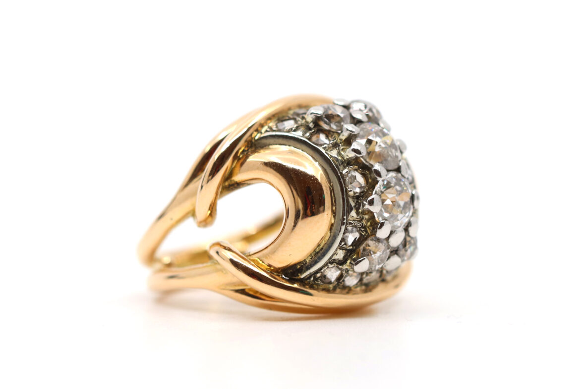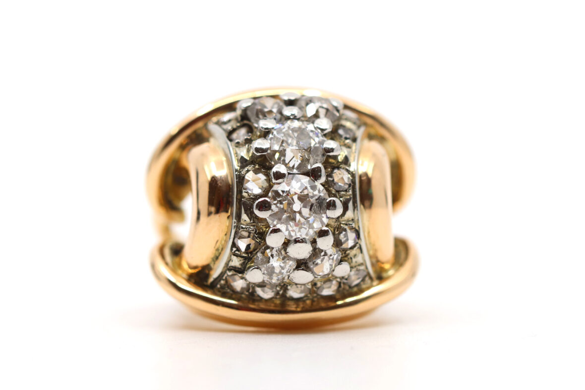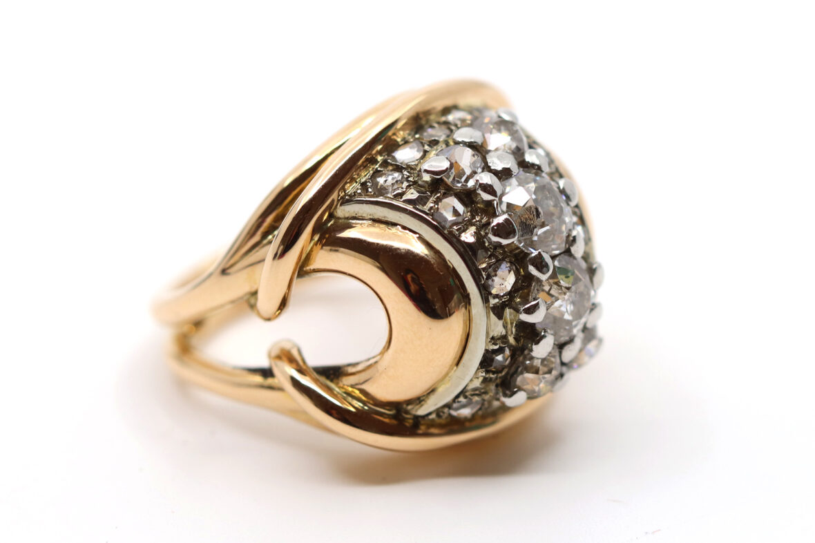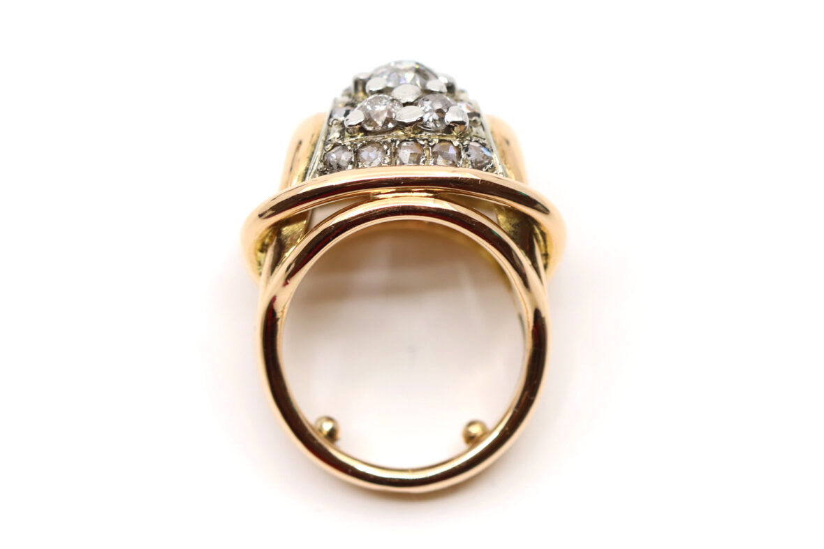 Importante bague dôme en or jaune et gris avec un pavage de diamants dont deux plus importants.