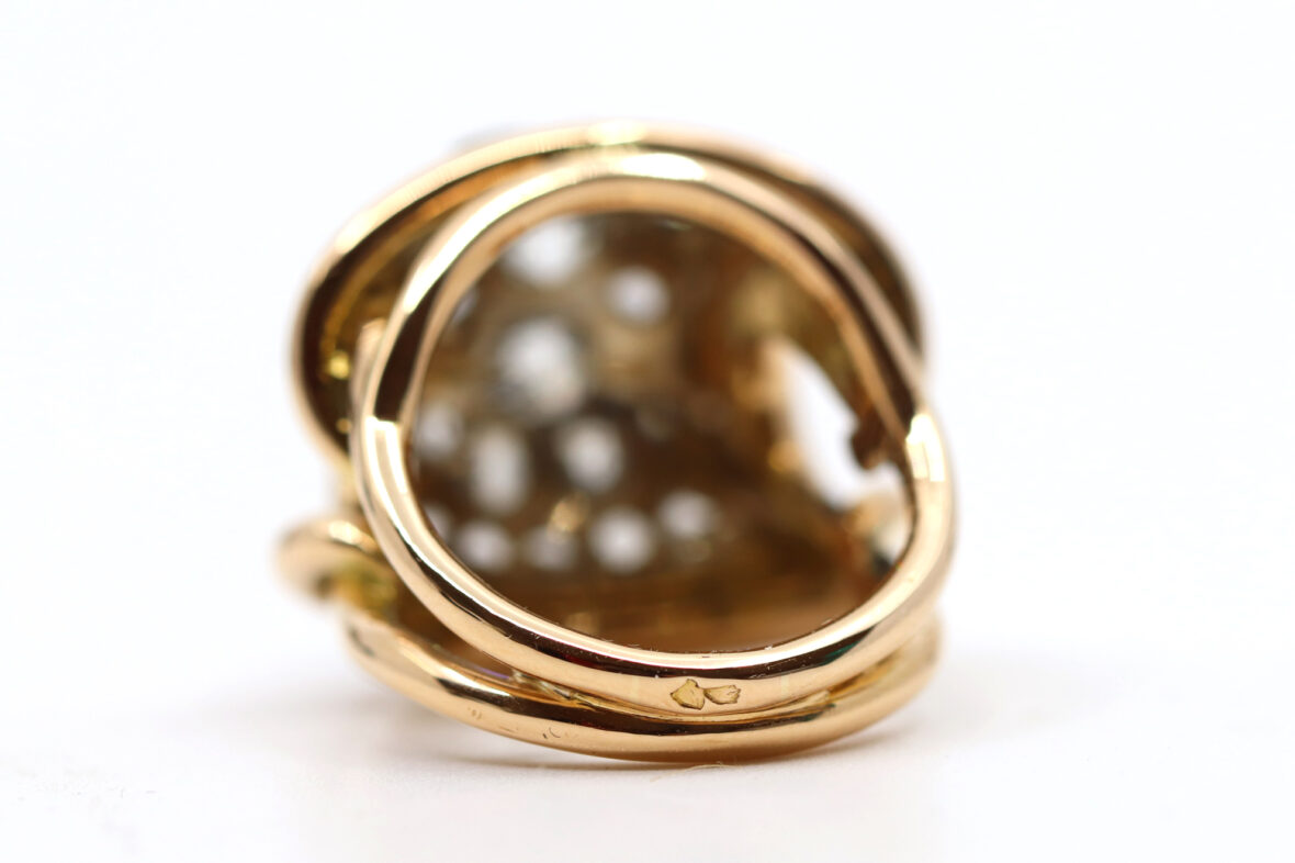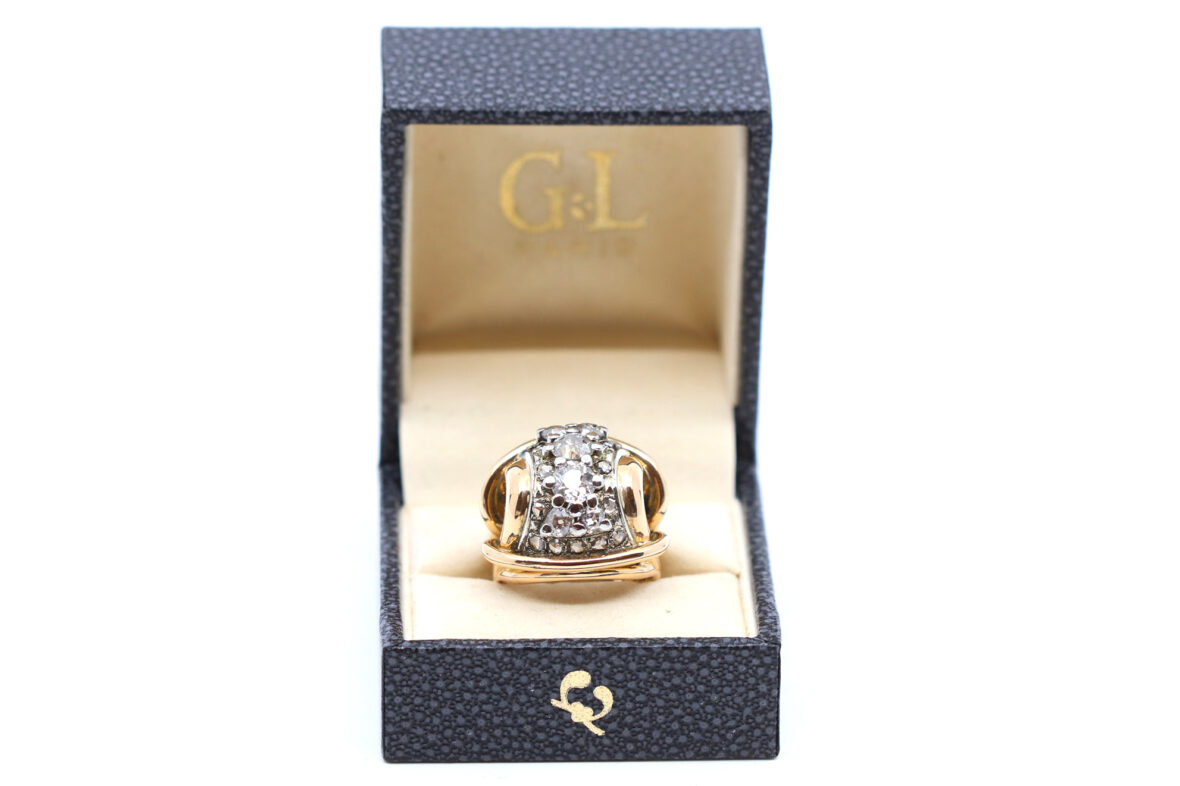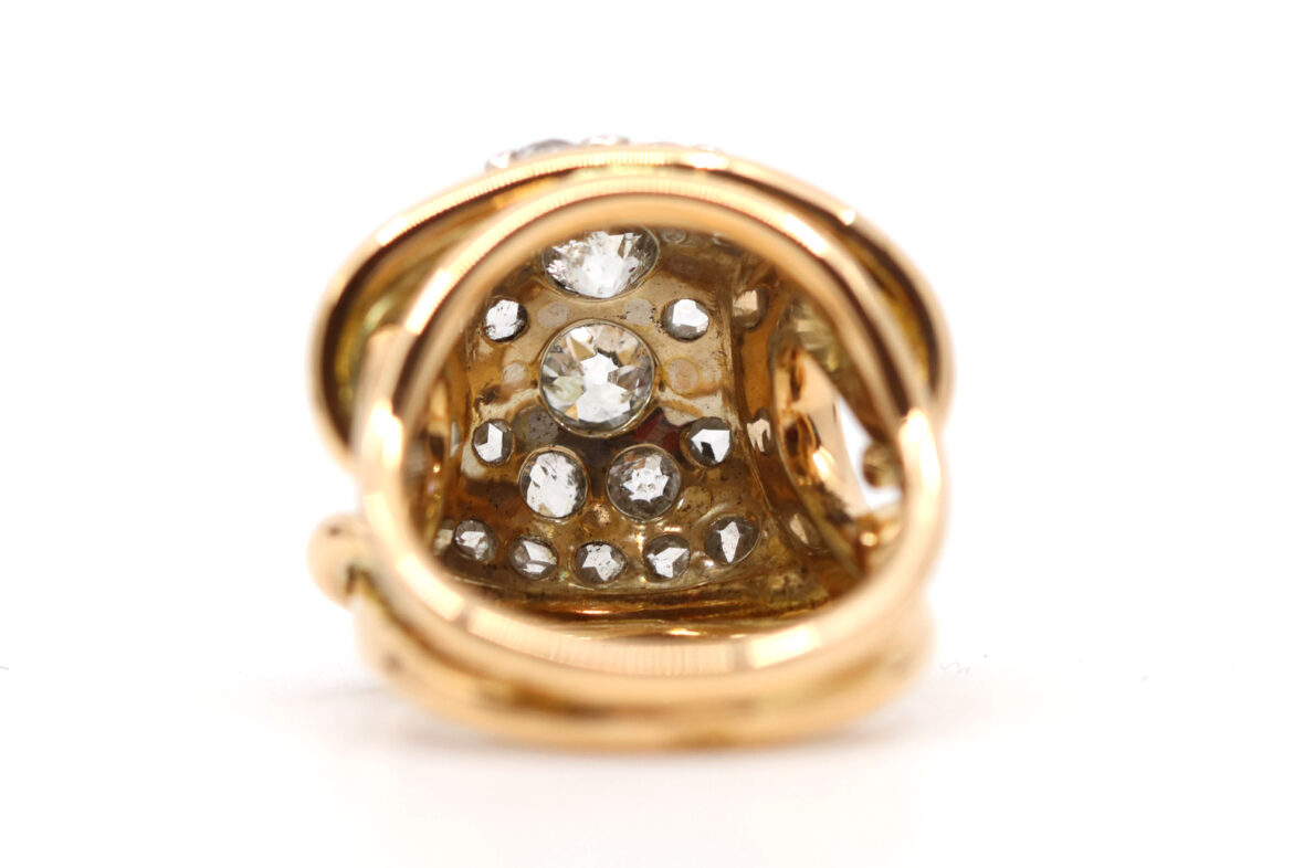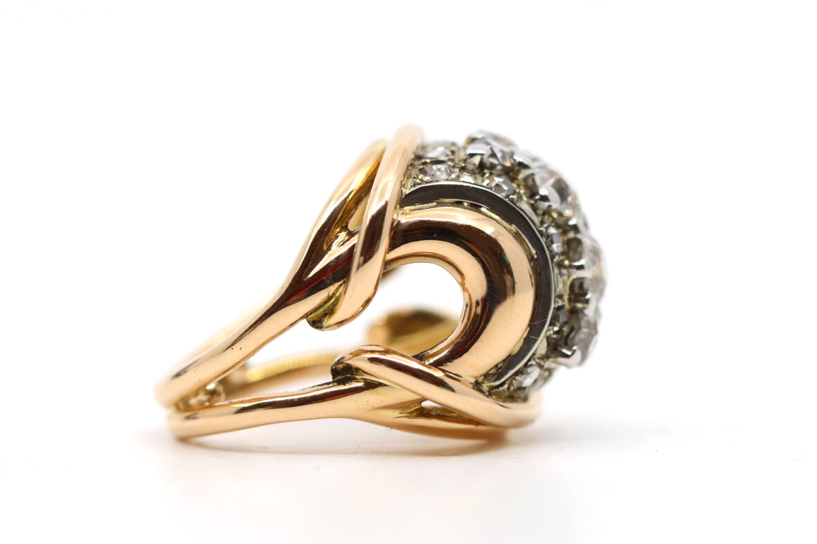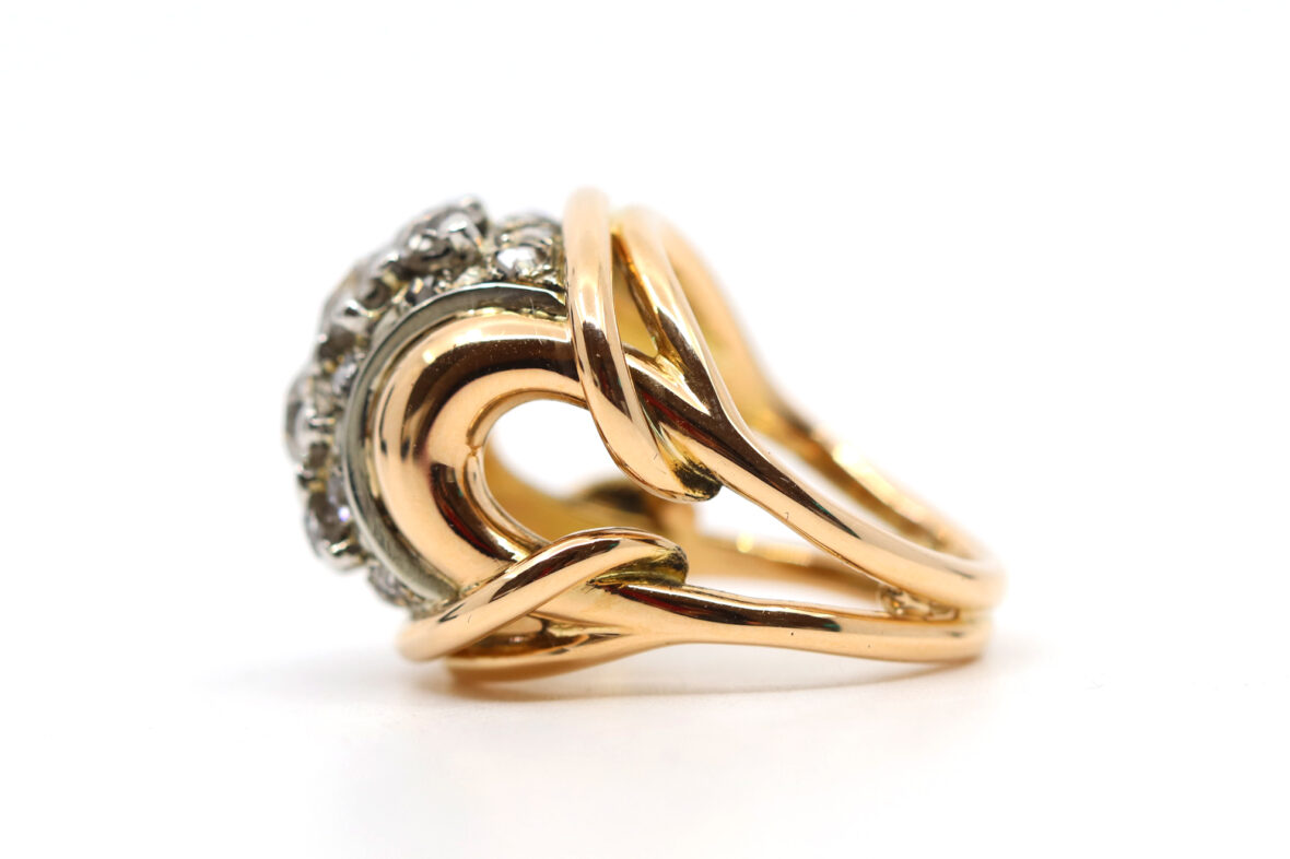 Importante bague dôme en or jaune et gris avec un pavage de diamants dont deux plus importants.