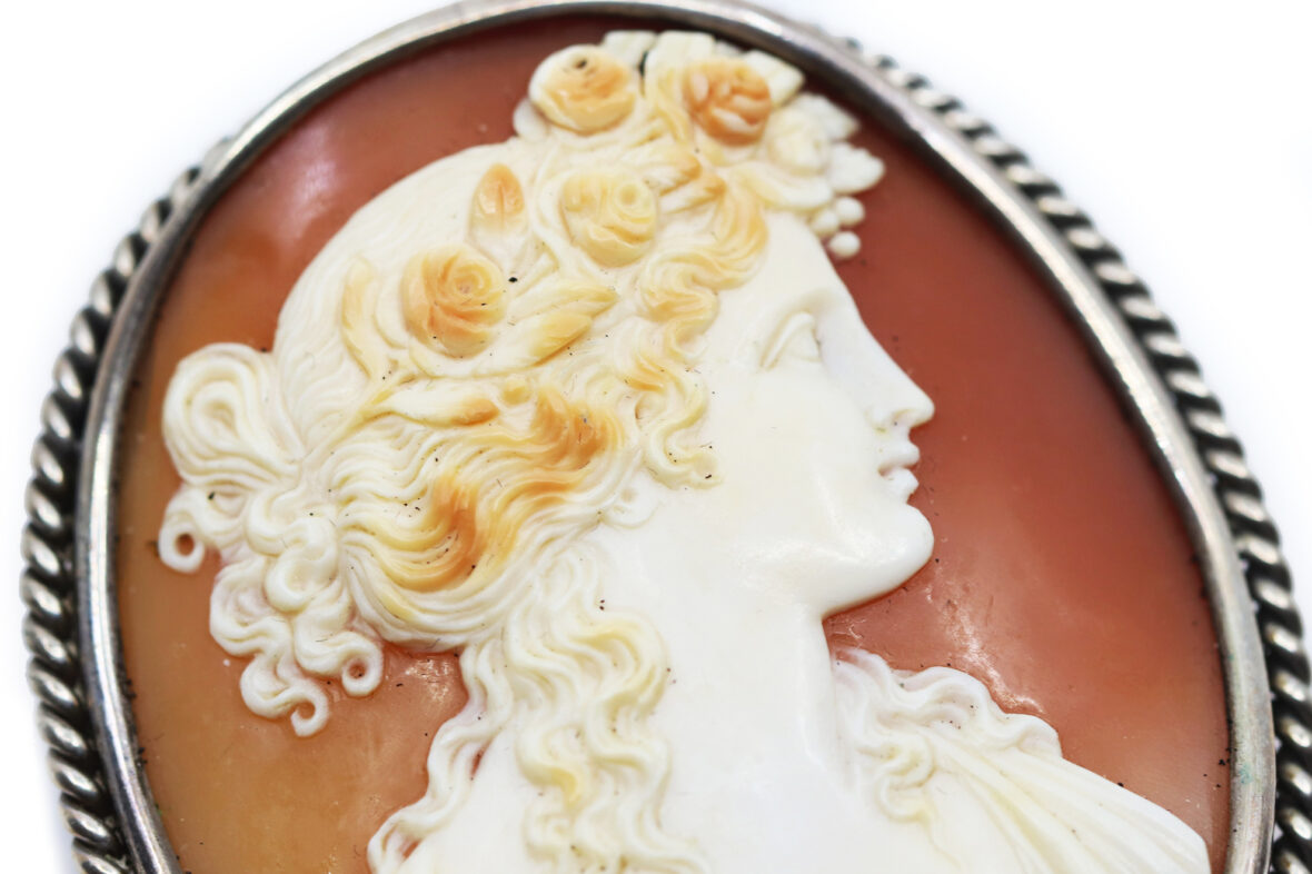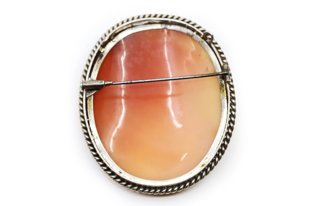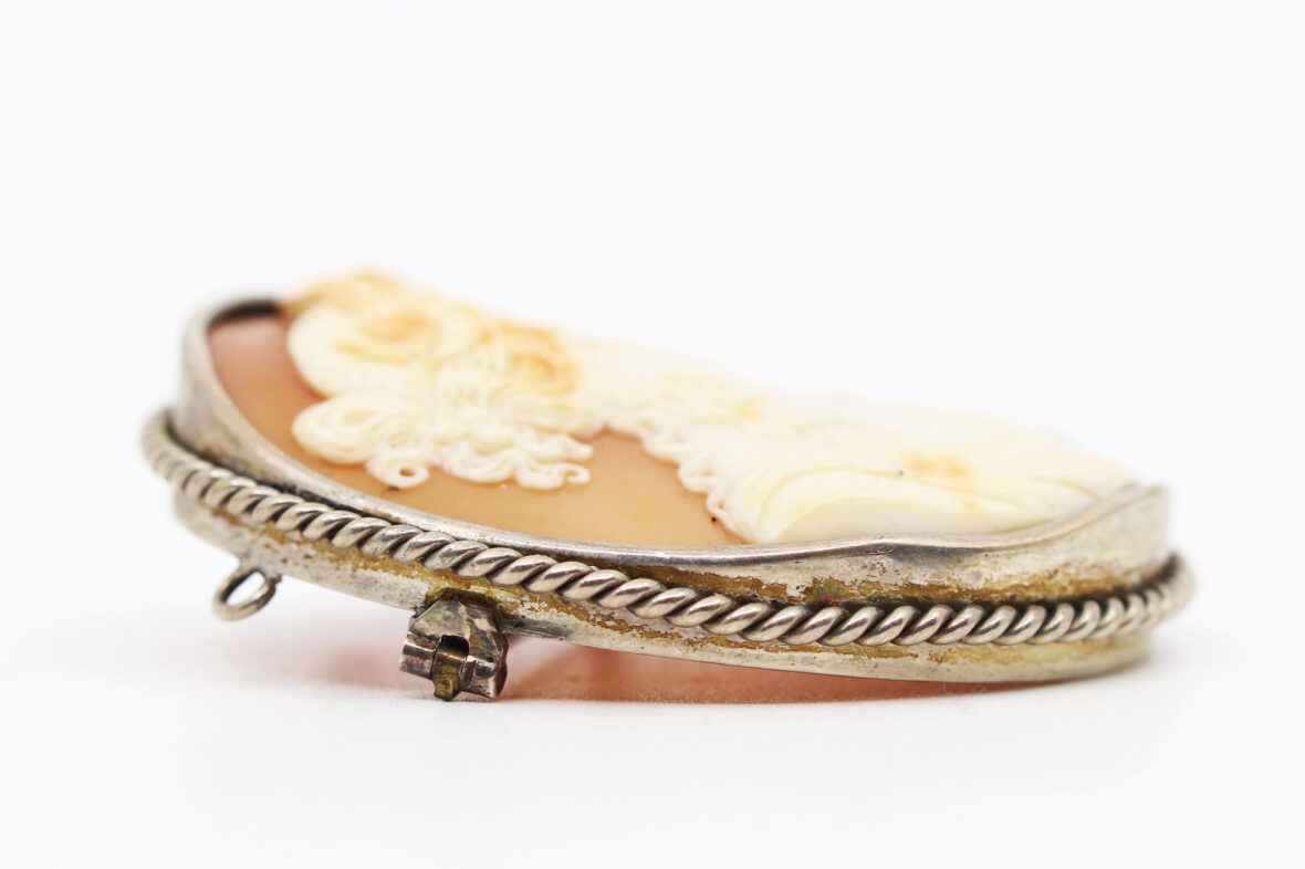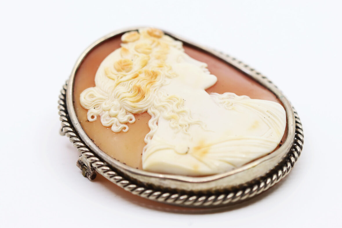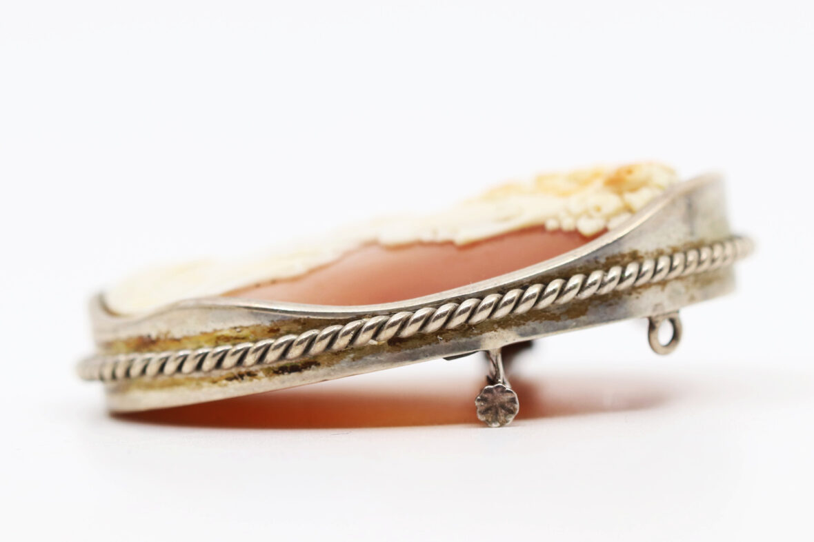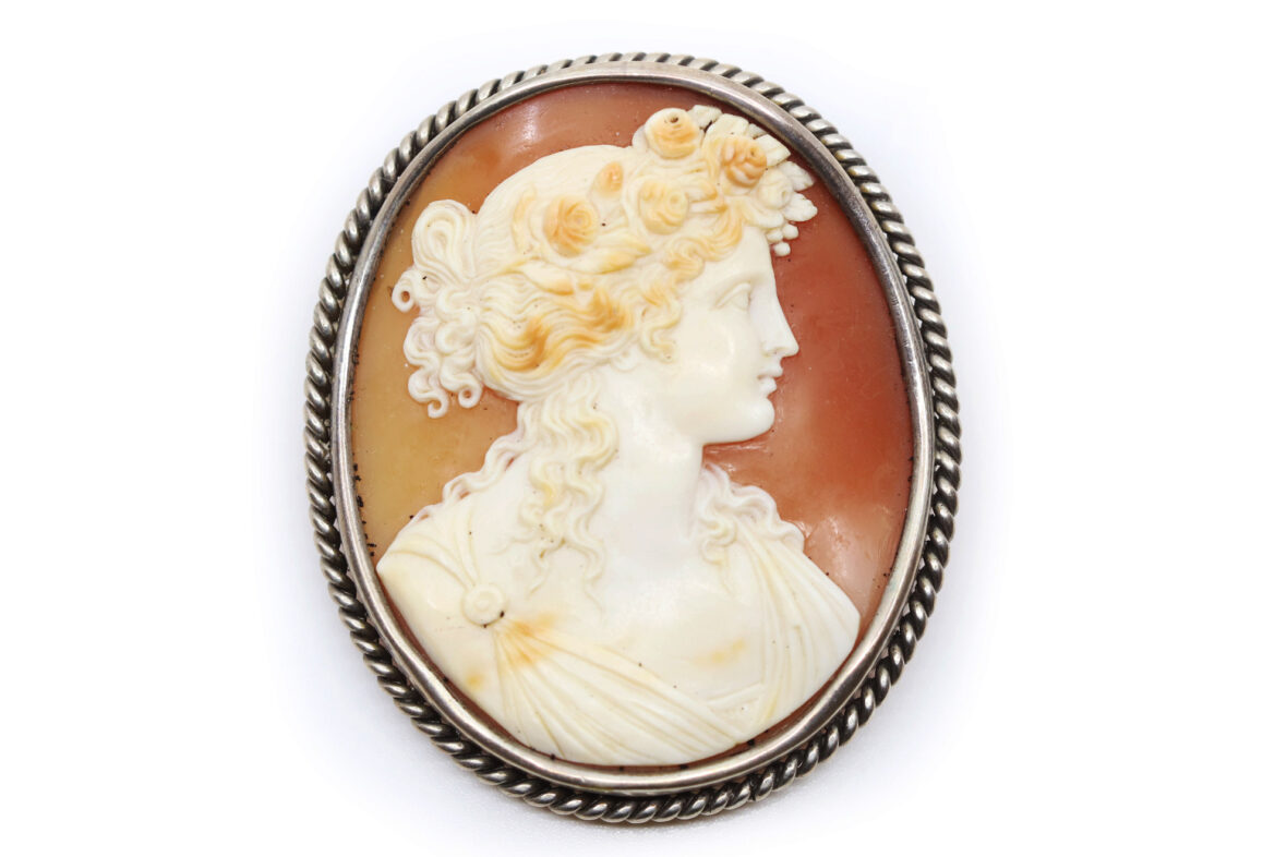 Importante broche en métal ornée d’un camée coquille sur agate représentant un buste de femme.