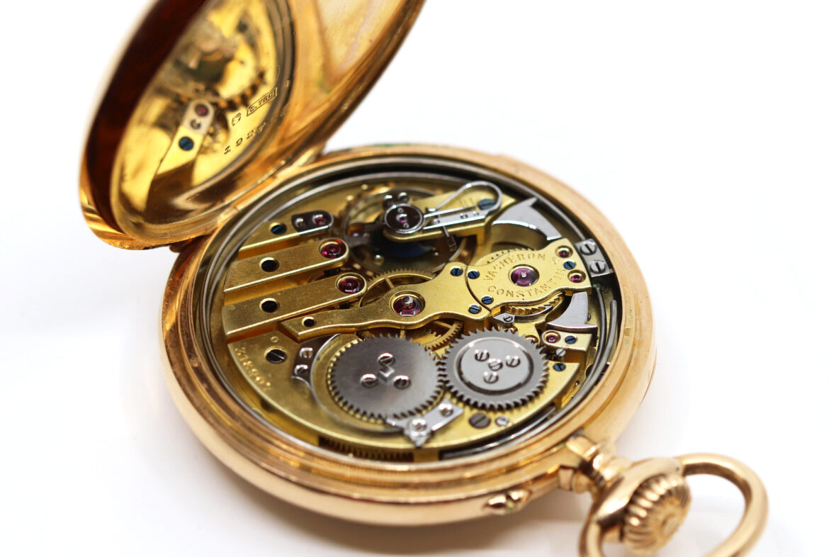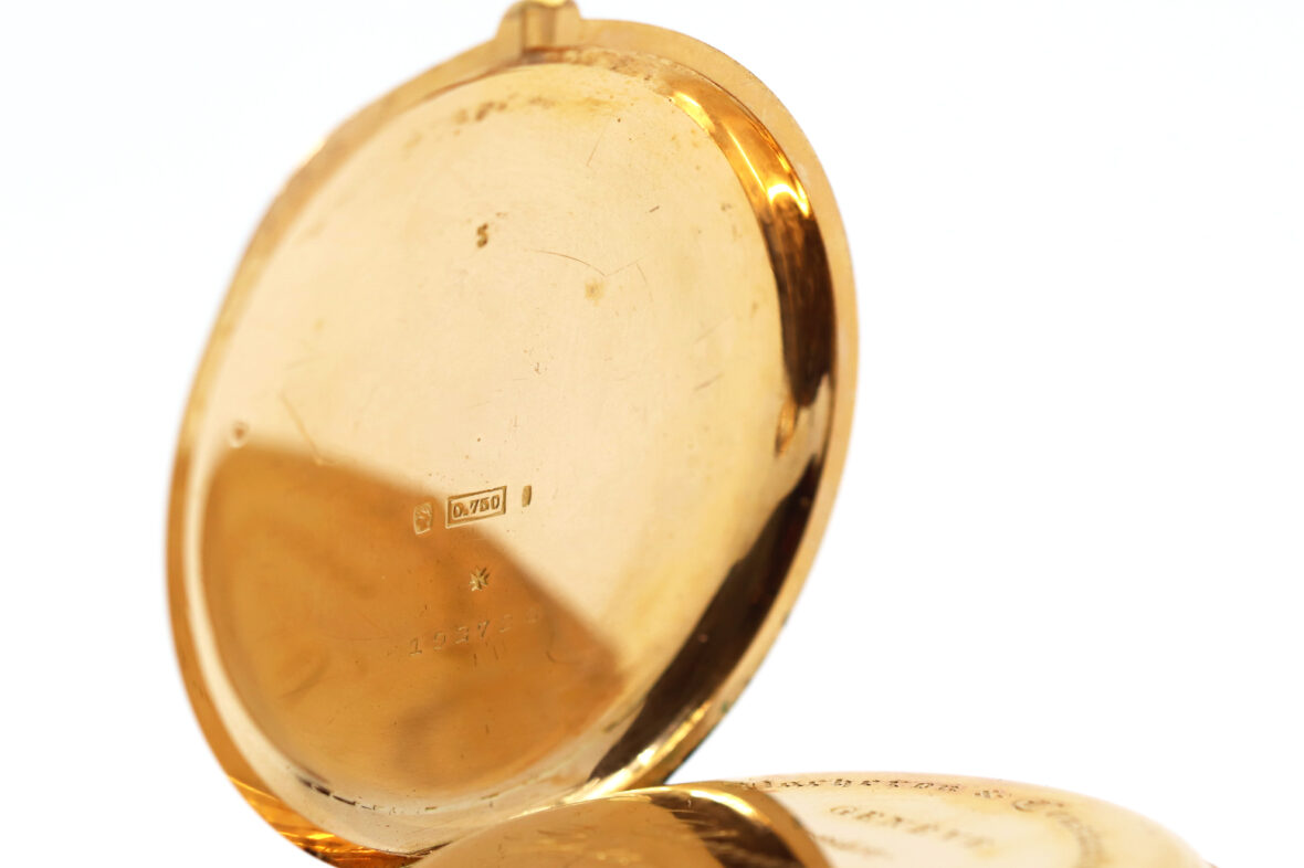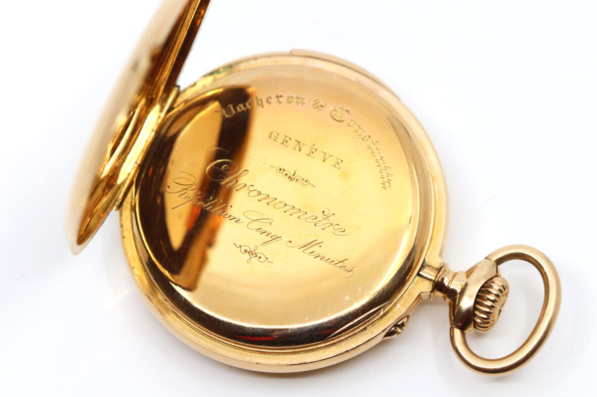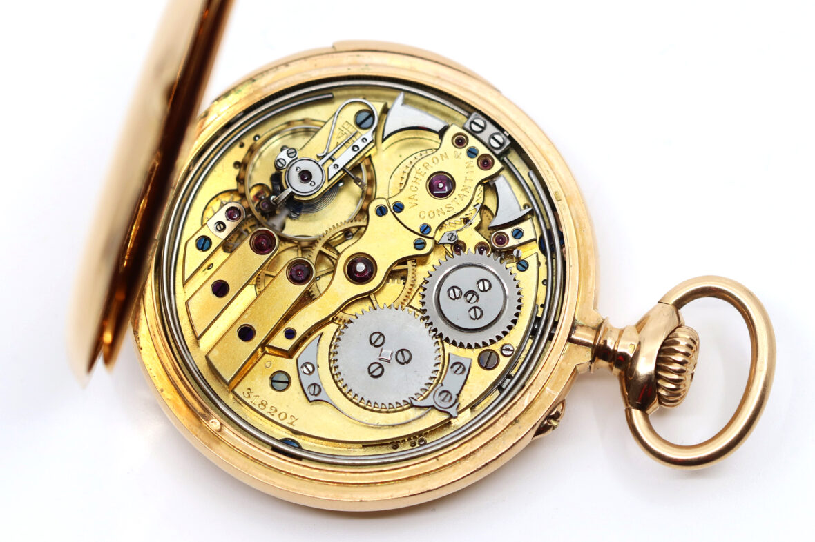 Importante montre à gousset en or jaune chiffrée CL. Cadran émaillé blanc à chiffres arabes signé Vacheron & Constantin à Genève. Cuvette intérieure en or jaune. (Aiguille des heures cassée mais présente).