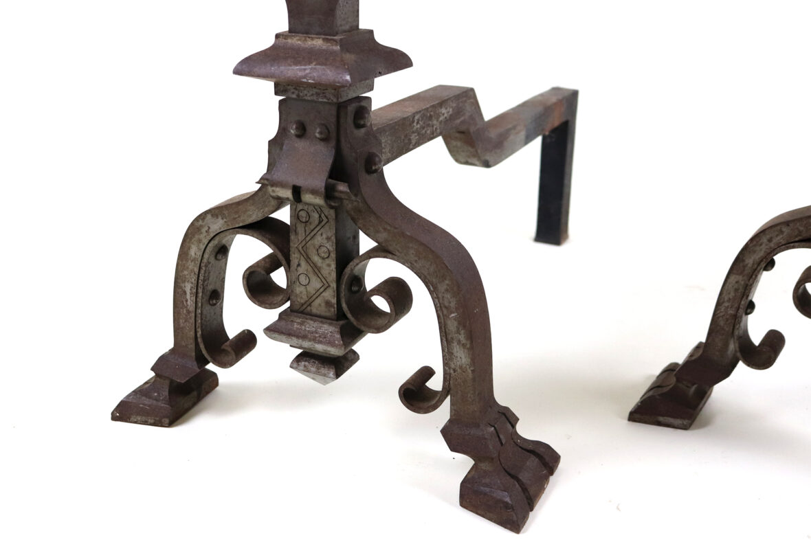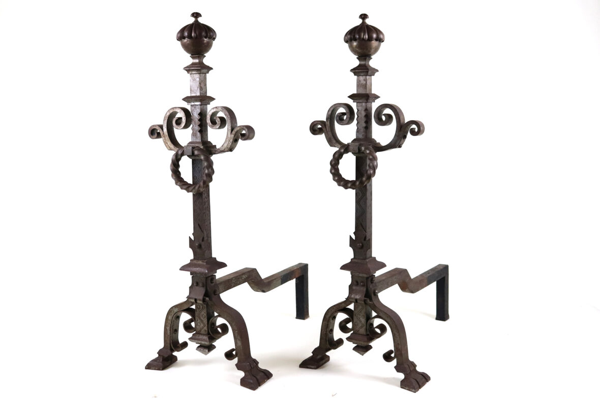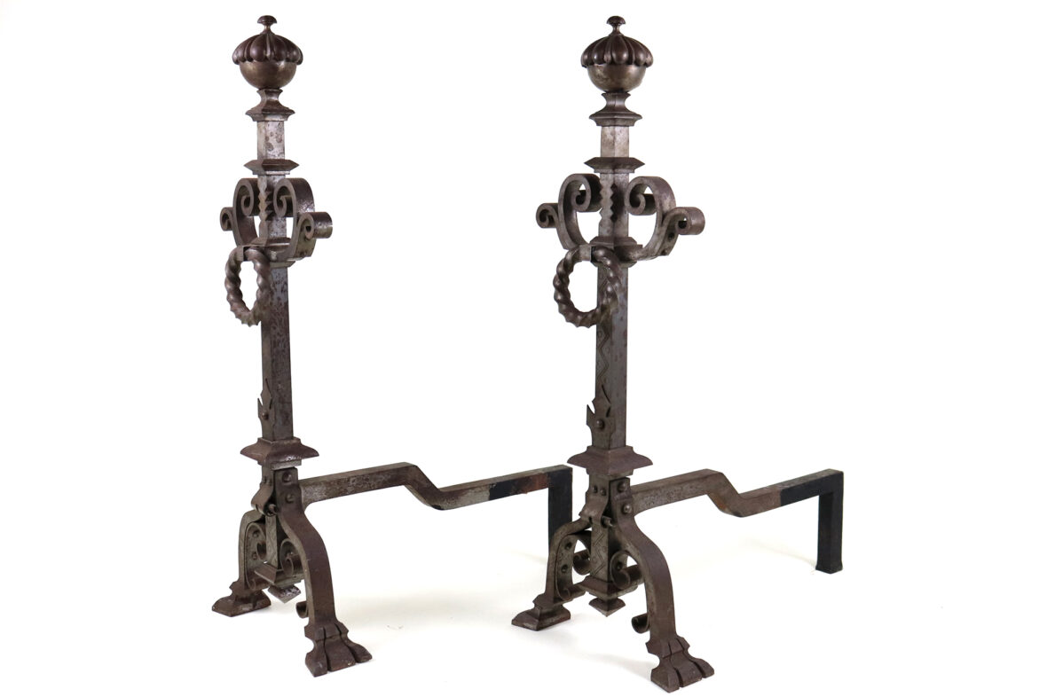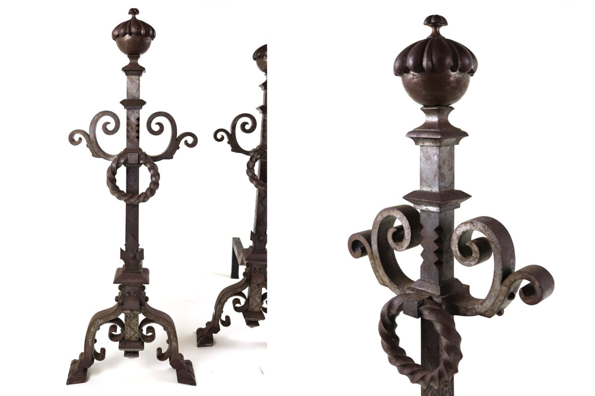 Importante paire de chenêts en fer forgé à décor d’enroulements