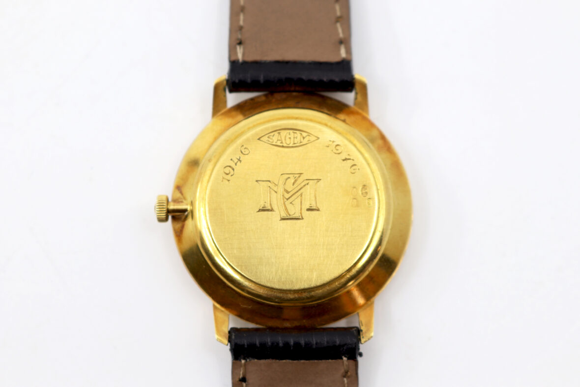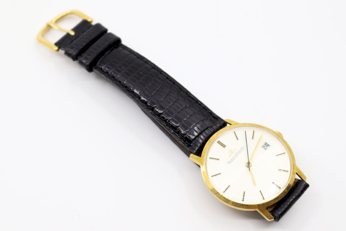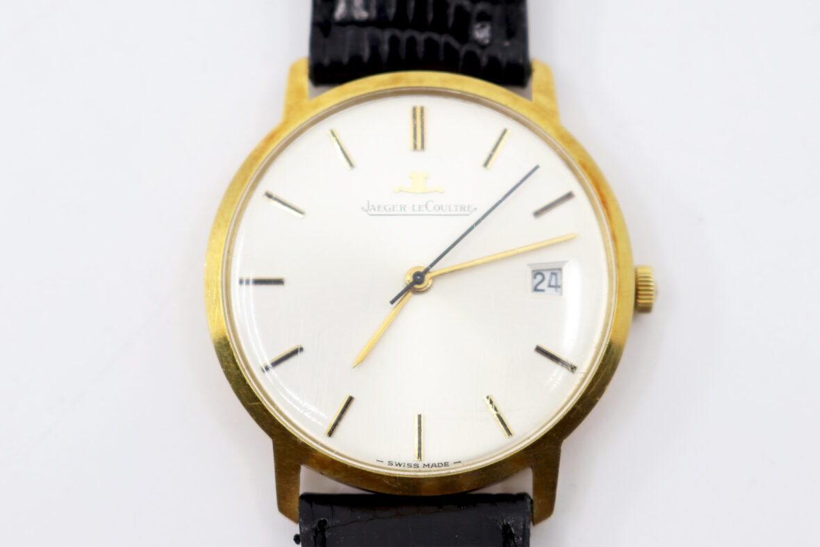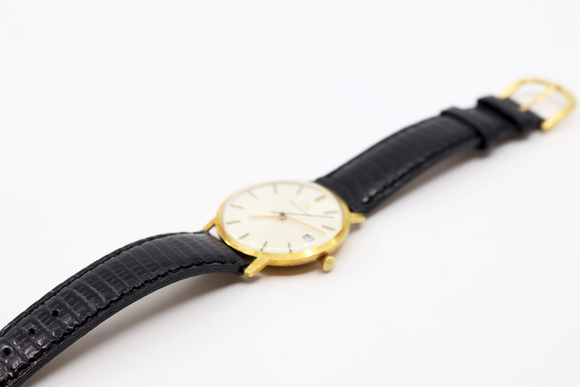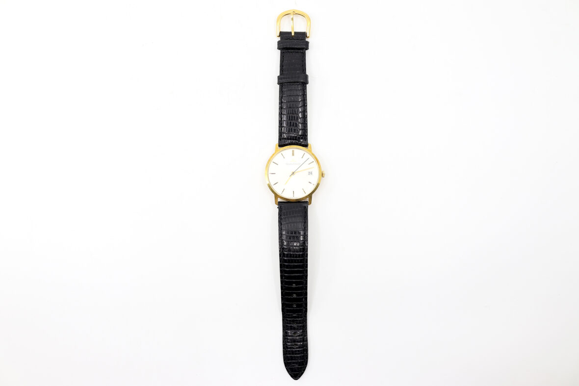 Montre d’homme en or, le cadran à index bâtons, fenêtre date à 3 heures.