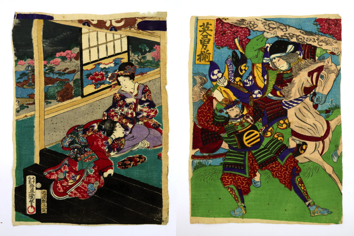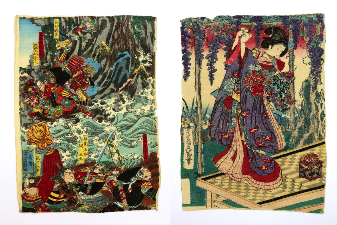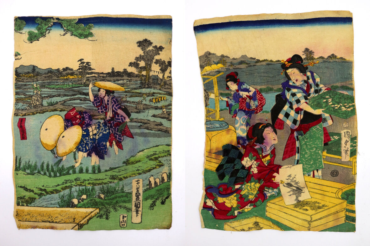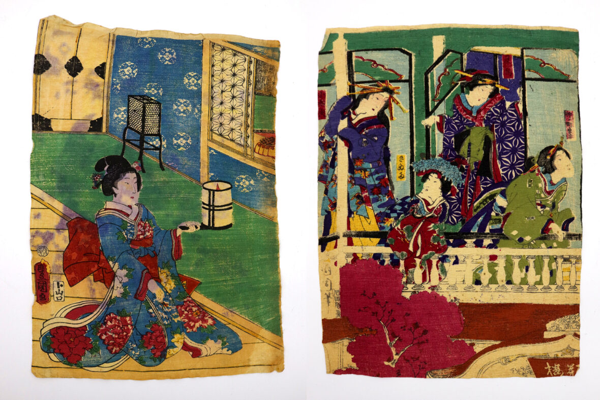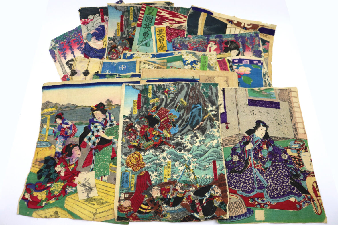 JAPON. Ensemble de 18 estampes en couleurs sur papier crépon. 19 x 27 cm