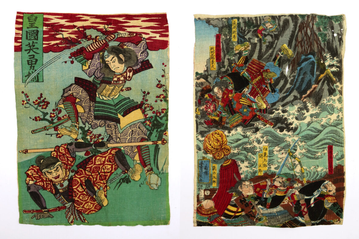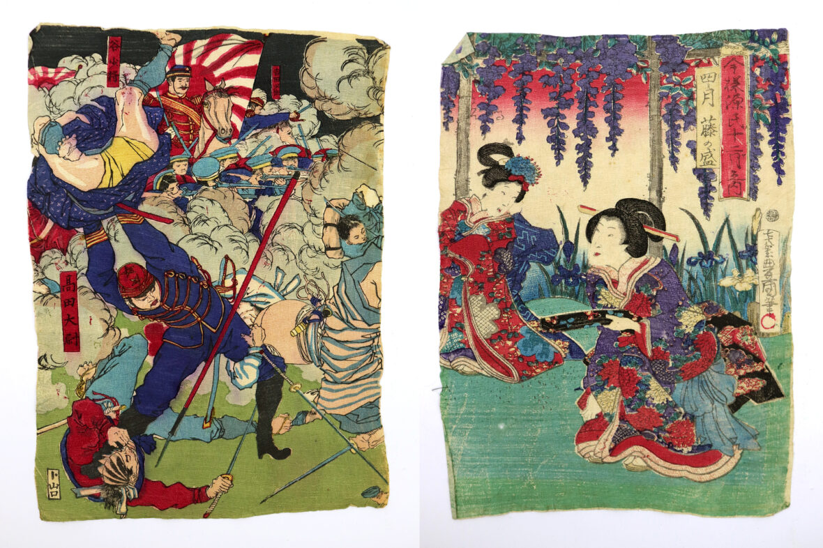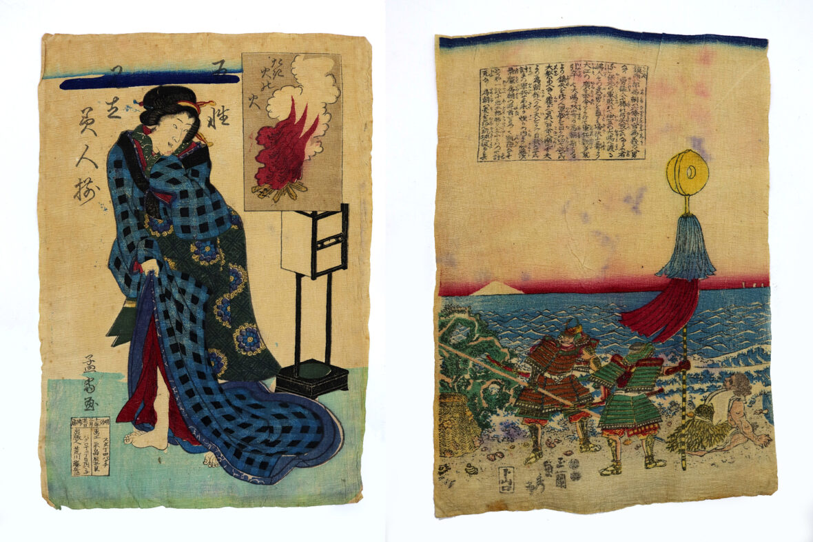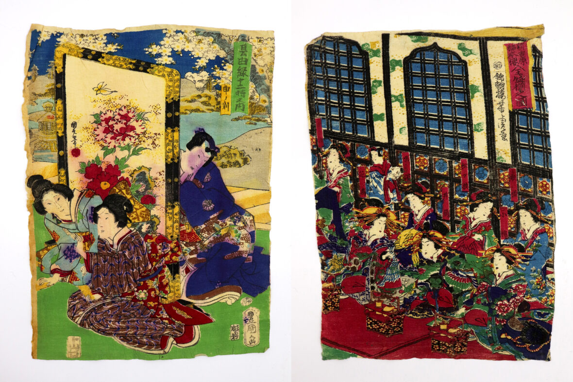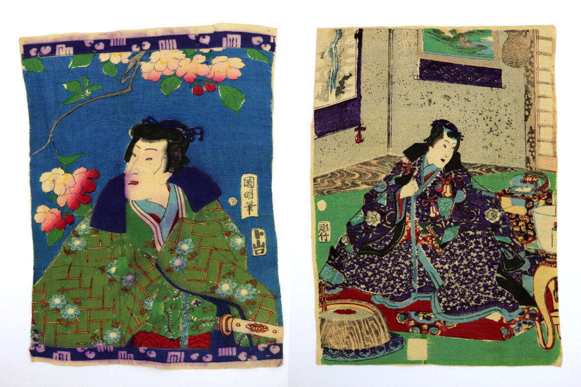 JAPON. Ensemble de 18 estampes en couleurs sur papier crépon. 19 x 27 cm