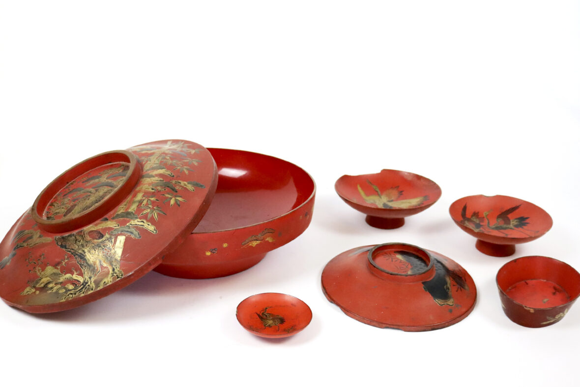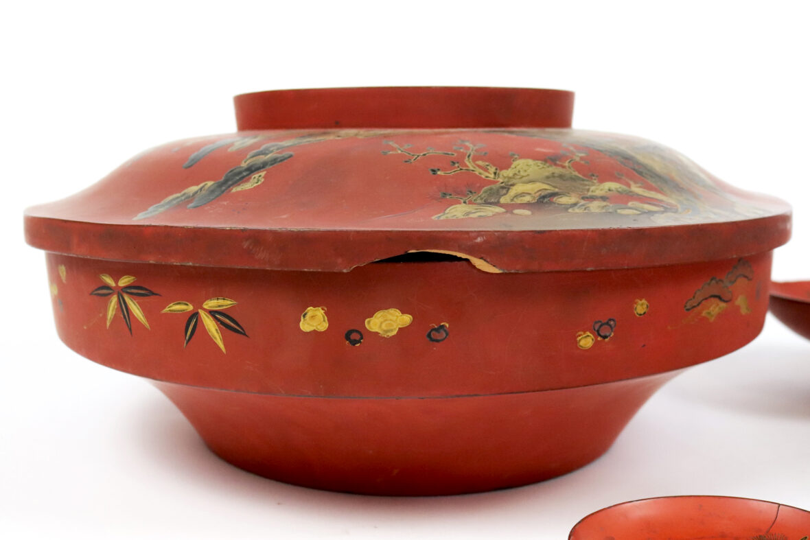 Grande coupe de mariage couverte de forme circulaire, en laque rouge à décor noir et or d’arbre et bambous.