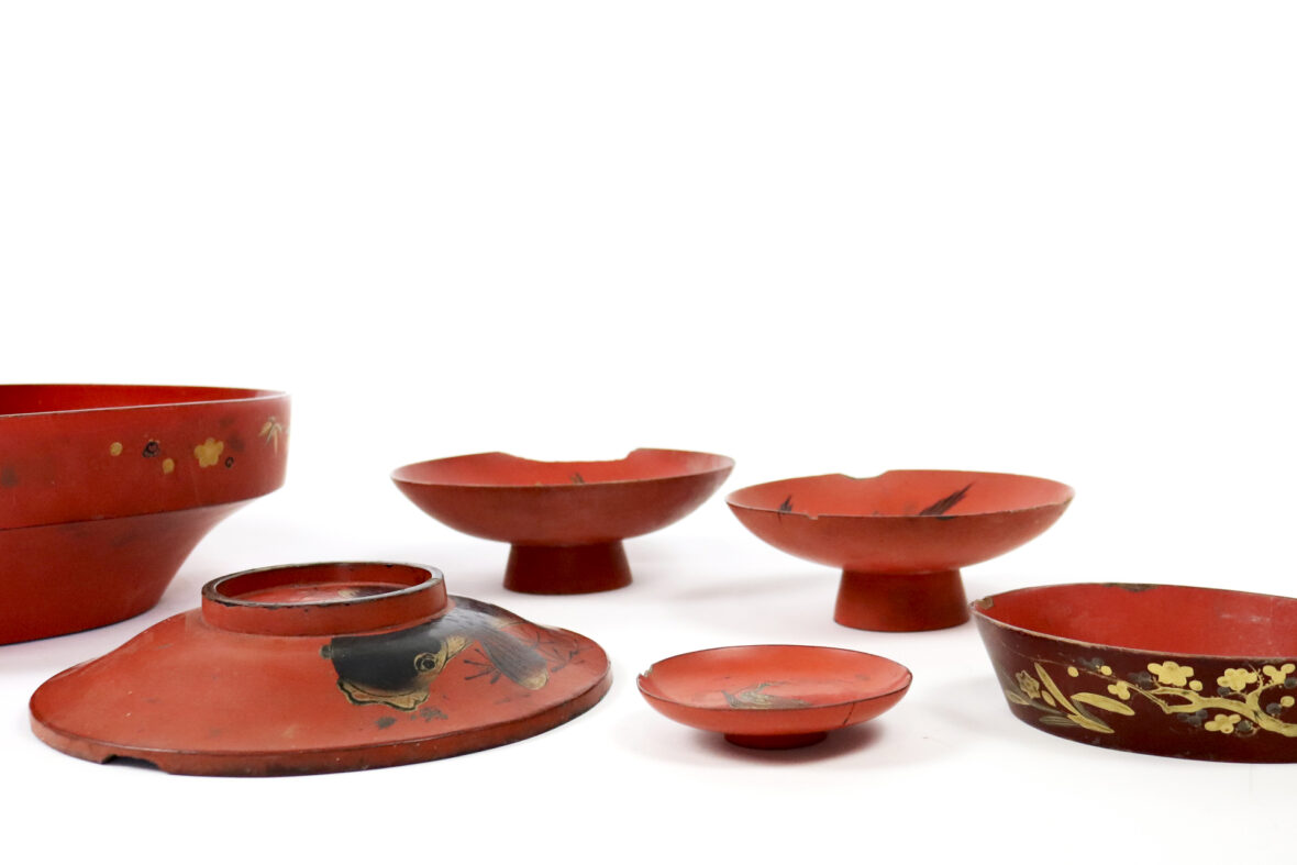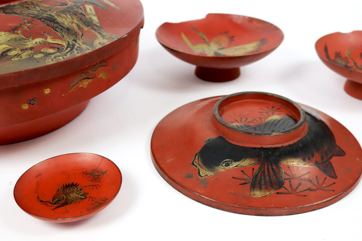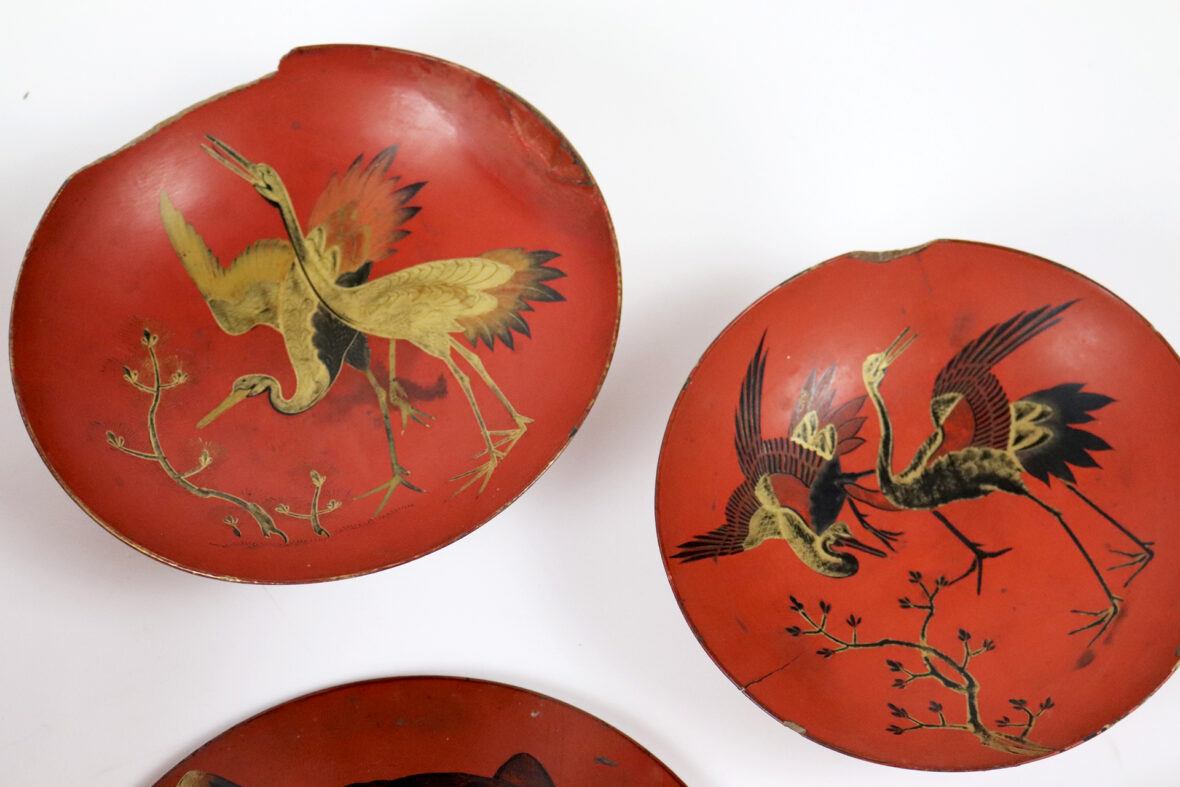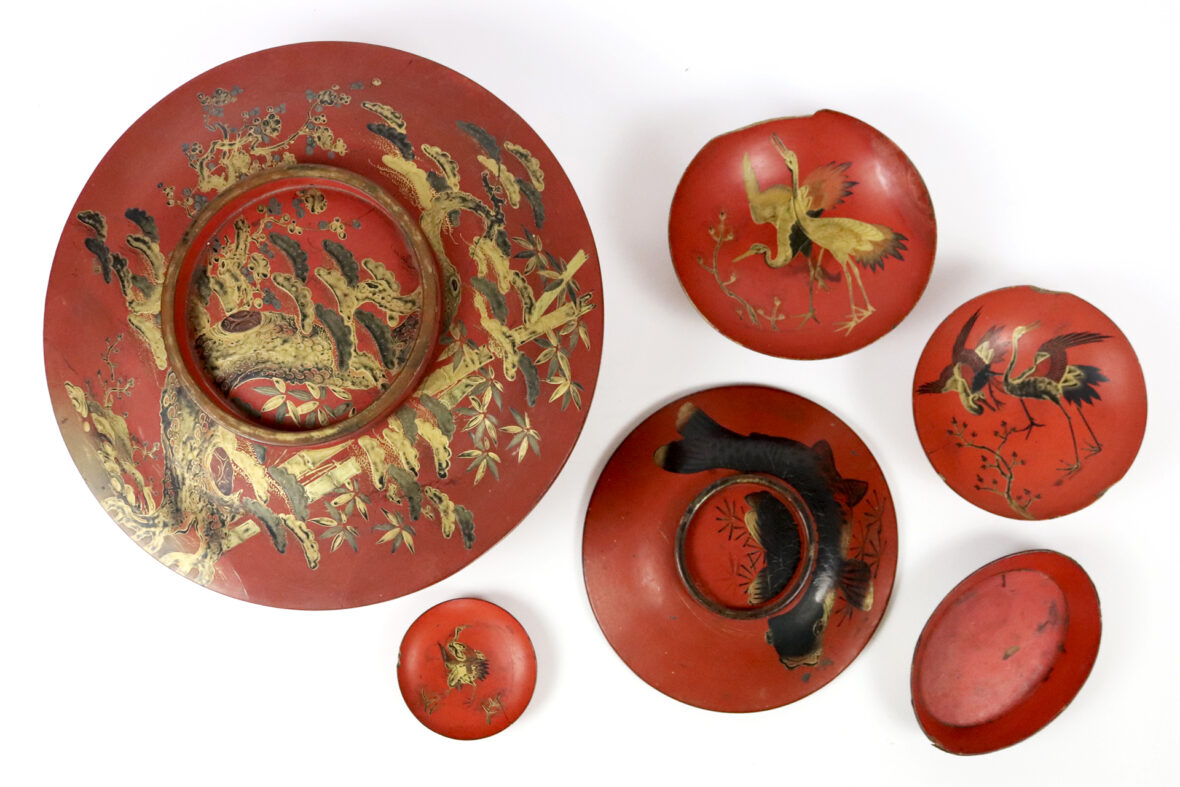 On y joint 5 plats en bois laqué rouge à décor en or et noir de grues et carpes.