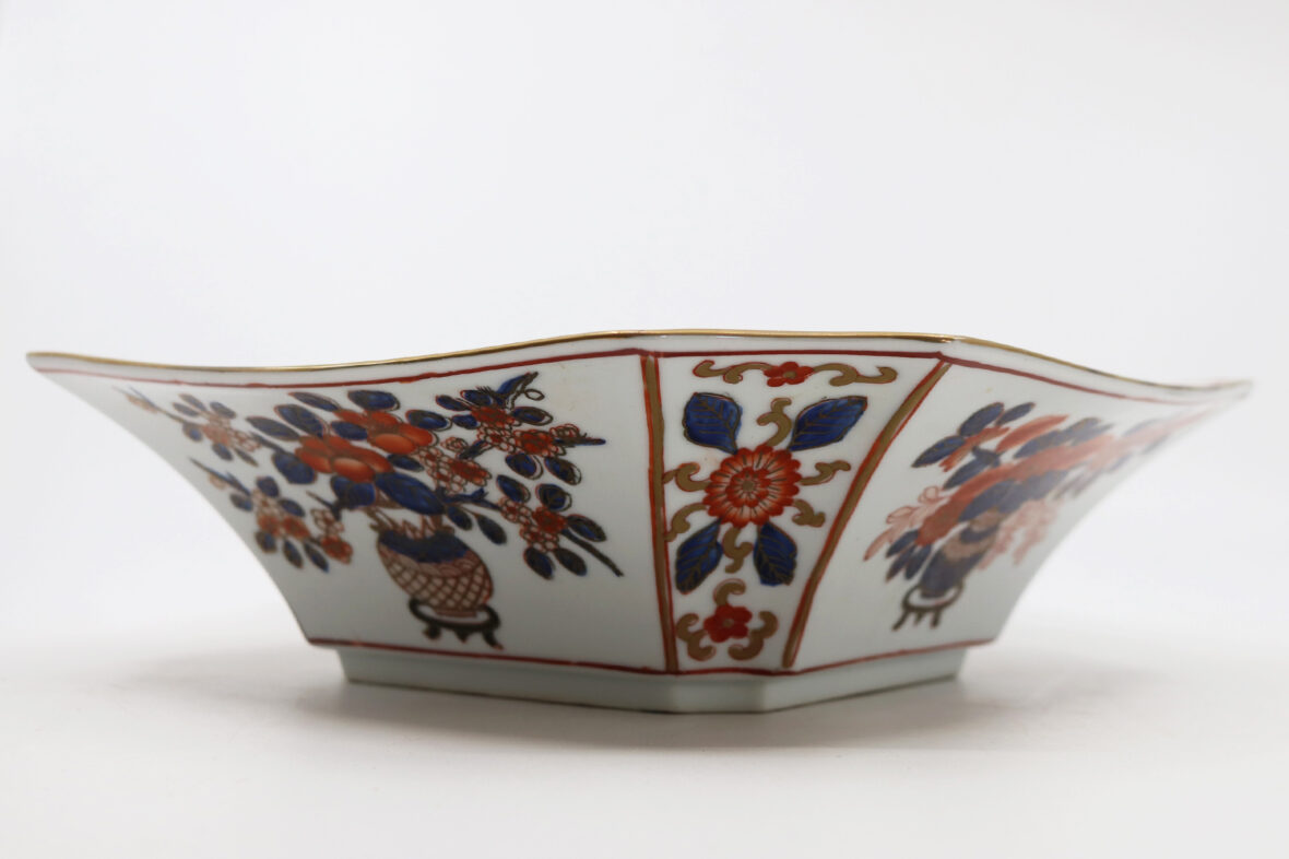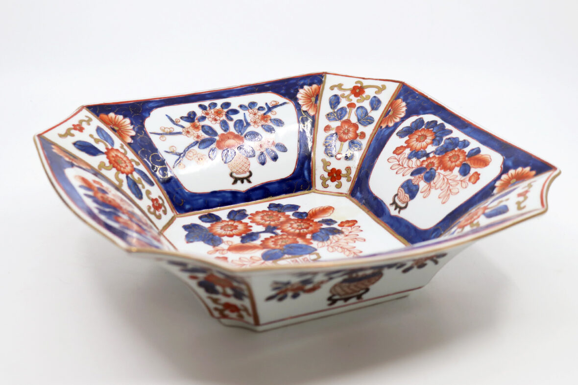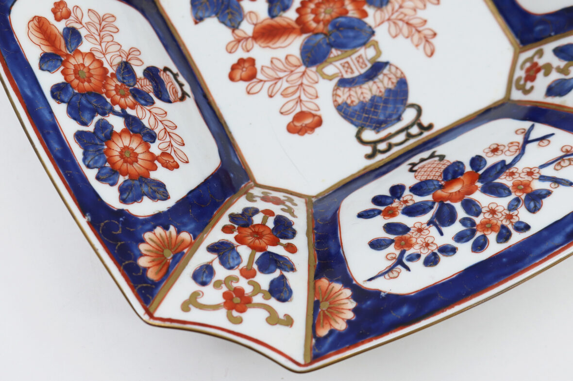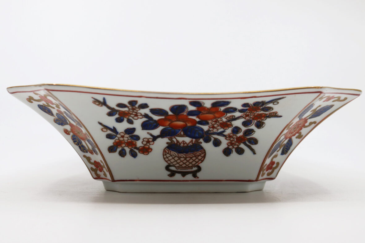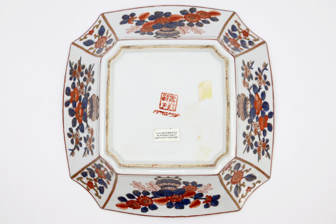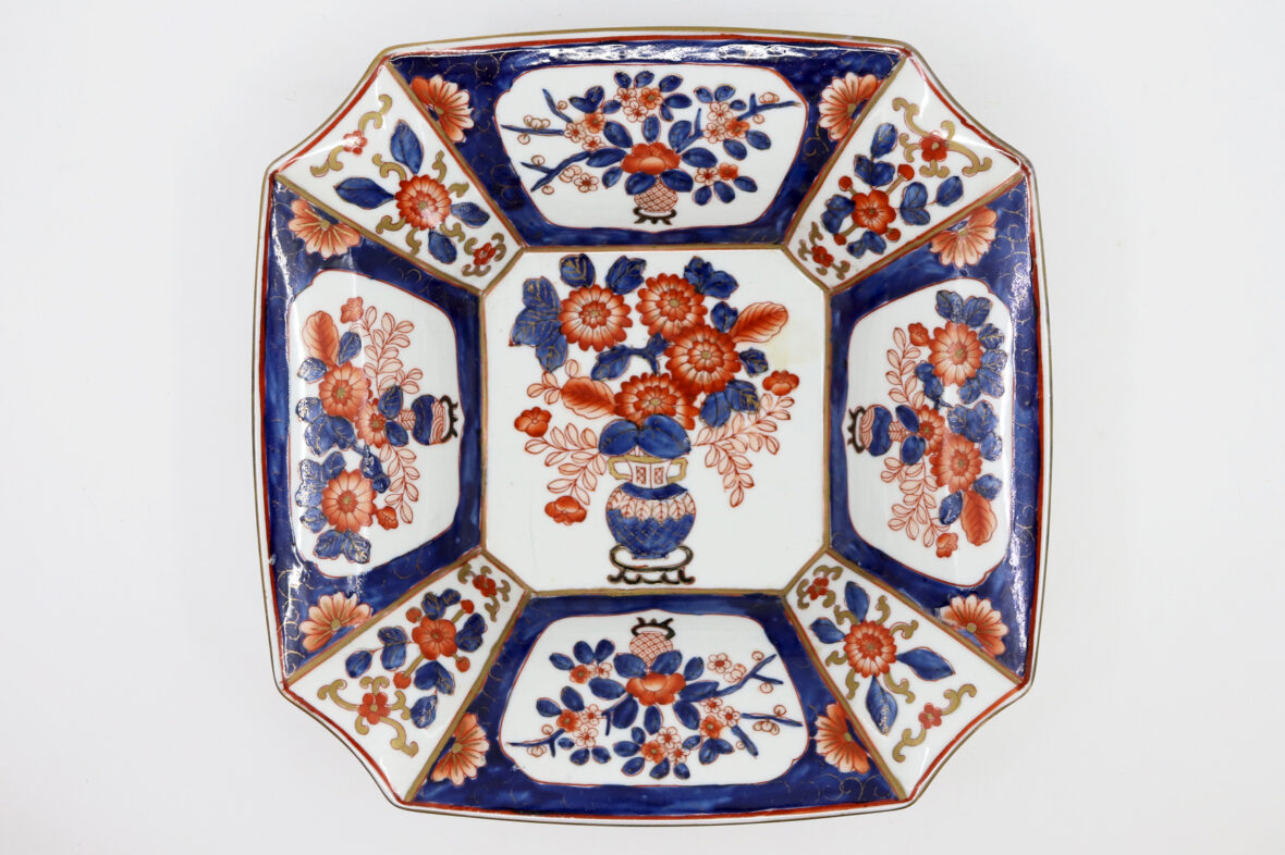 Plat carré à pans coupés en porcelaine Imari à décor de vases fleuris dans des réserves.