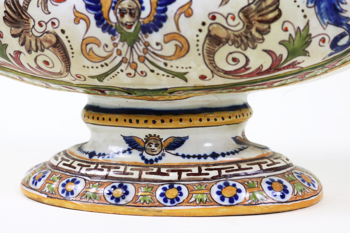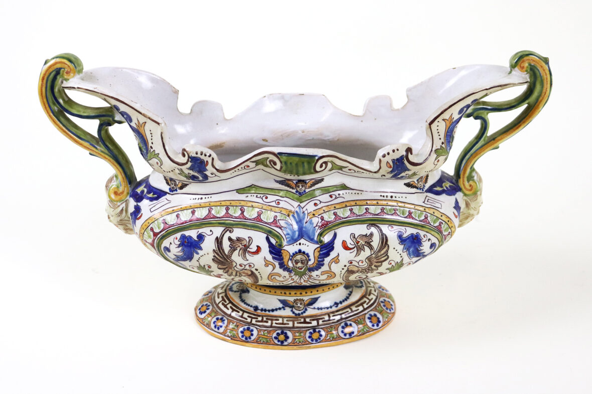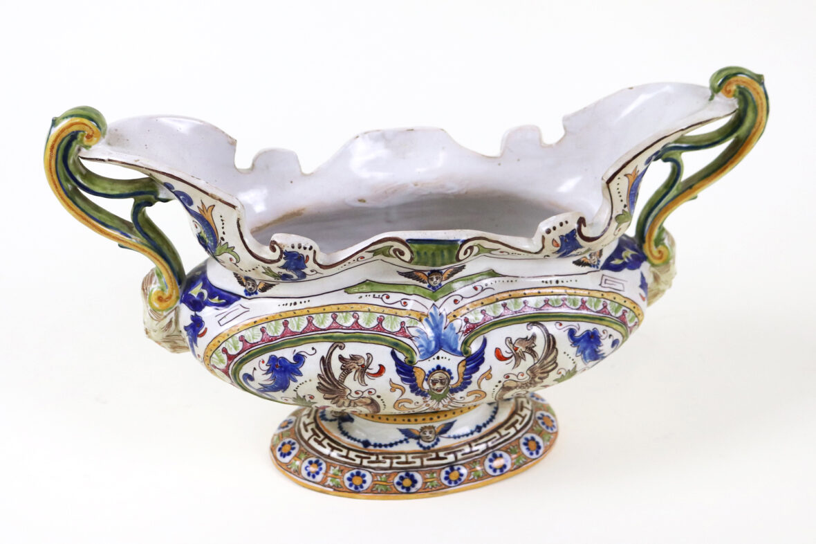 Jardinière à anses sur piédouche en faïence à décor polychrome de mascarons, griffons et frise de fleurettes. Le col à bords contournés.