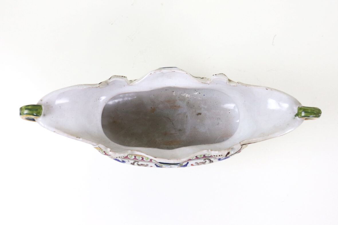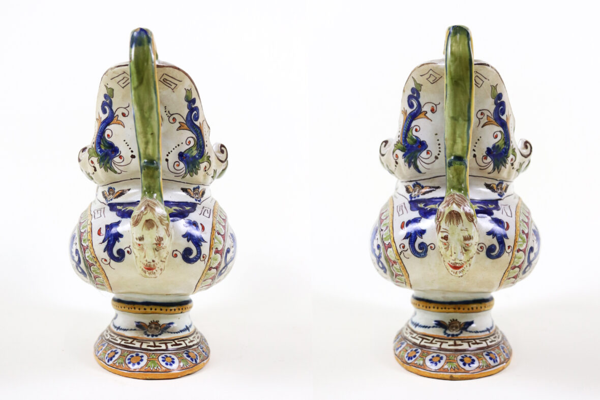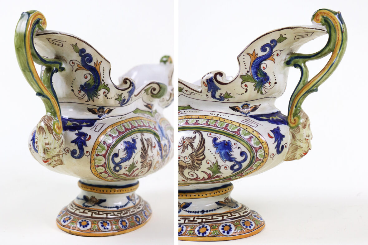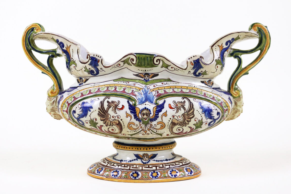 Jardinière à anses sur piédouche en faïence à décor polychrome de mascarons, griffons et frise de fleurettes. Le col à bords contournés.