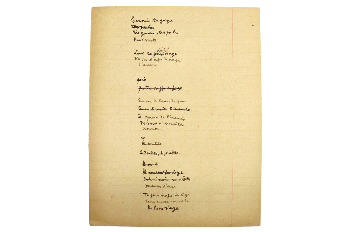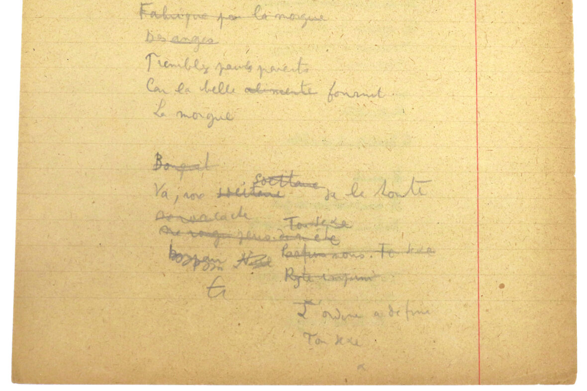 Ébauche en premier jet de son de poème « Les mésaventures d’un rosier » rédigée à l’encre noire sur le recto et au crayon sur le verso. Le manuscrit non exhaustif présente de nombreuses corrections et biffures.