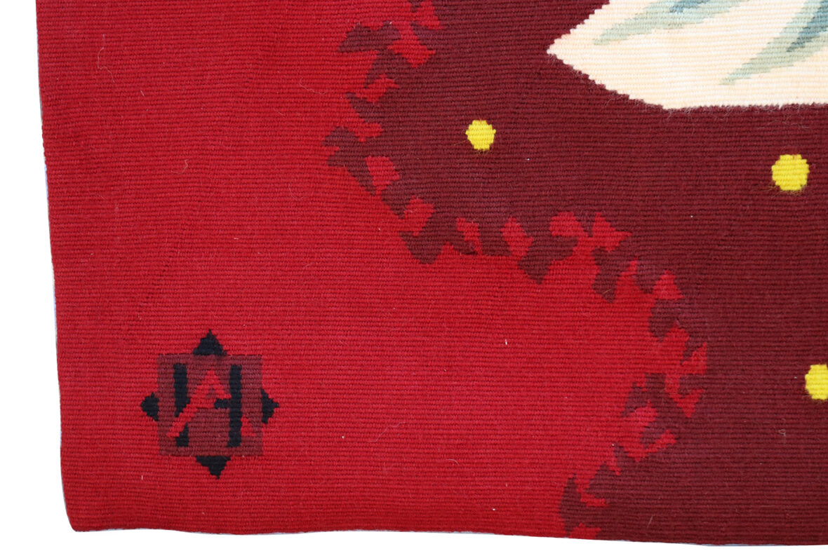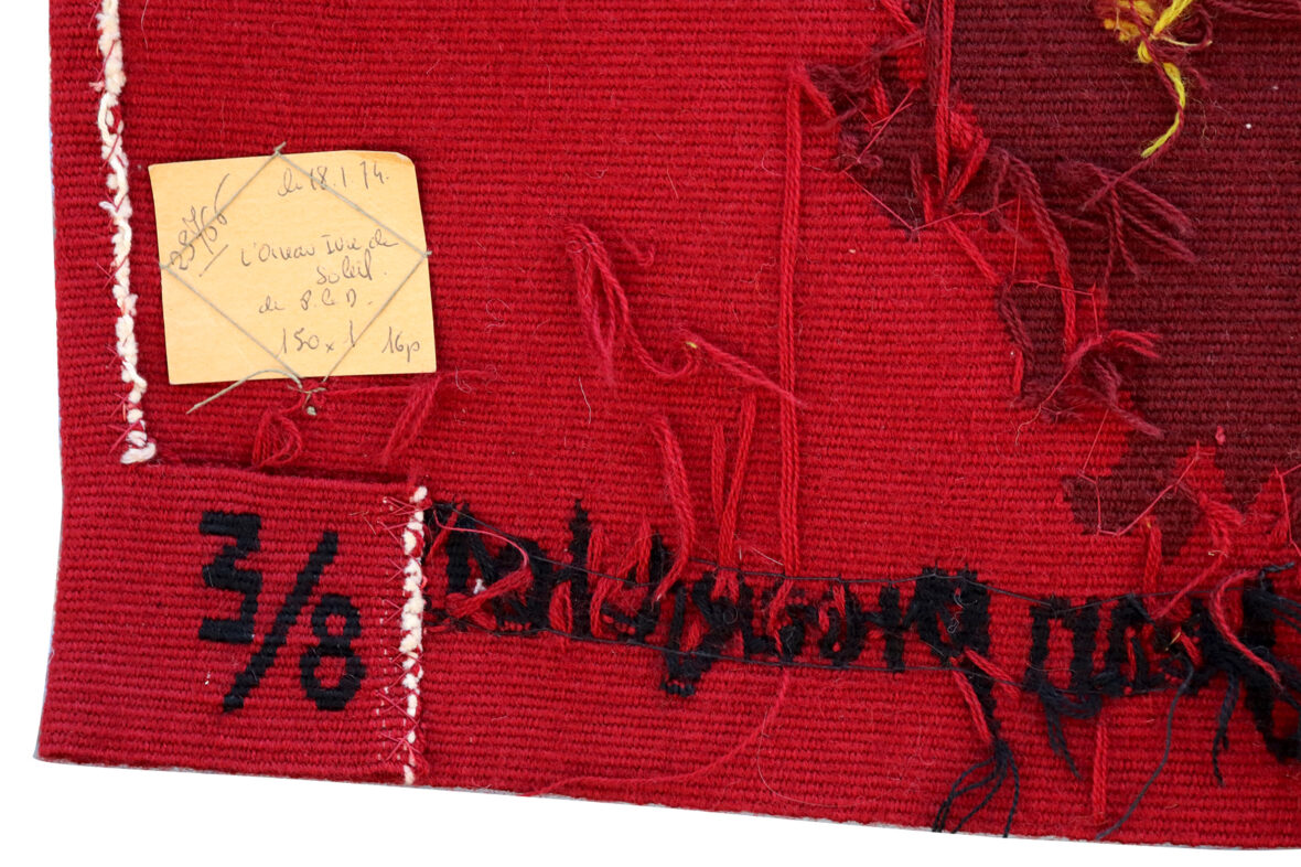 Tapisserie en laine. Signée en bas à droite. Marque de lissier en bas à gauche. Numérotée 3/8 au dos. Bolduc au dos contresigné.