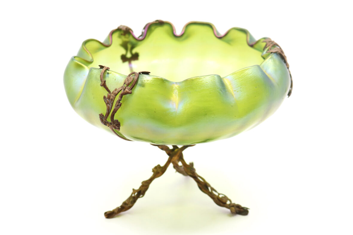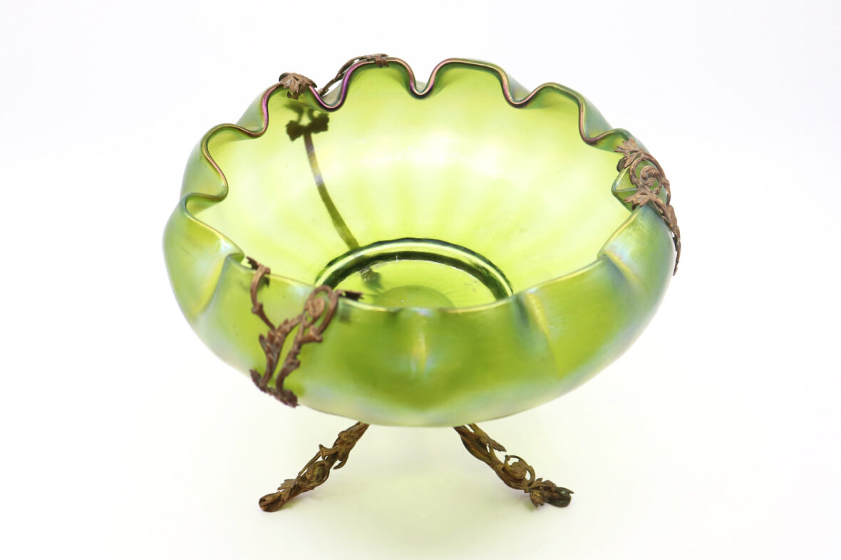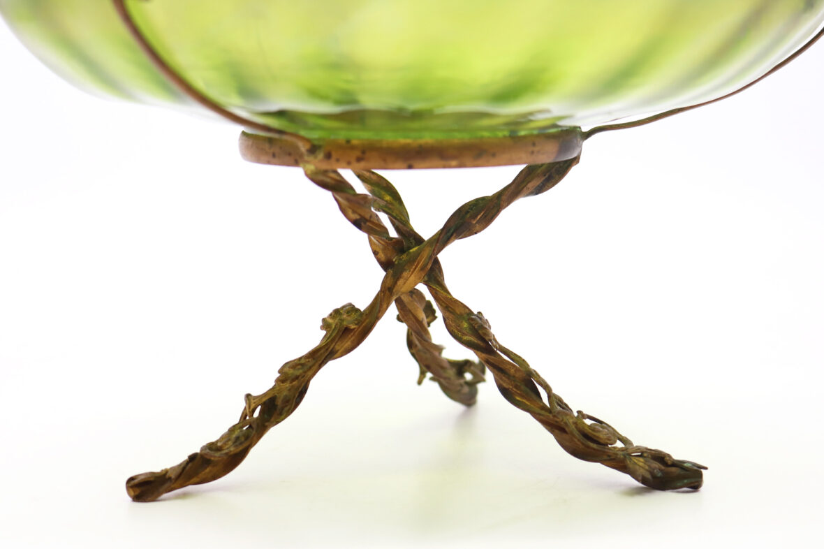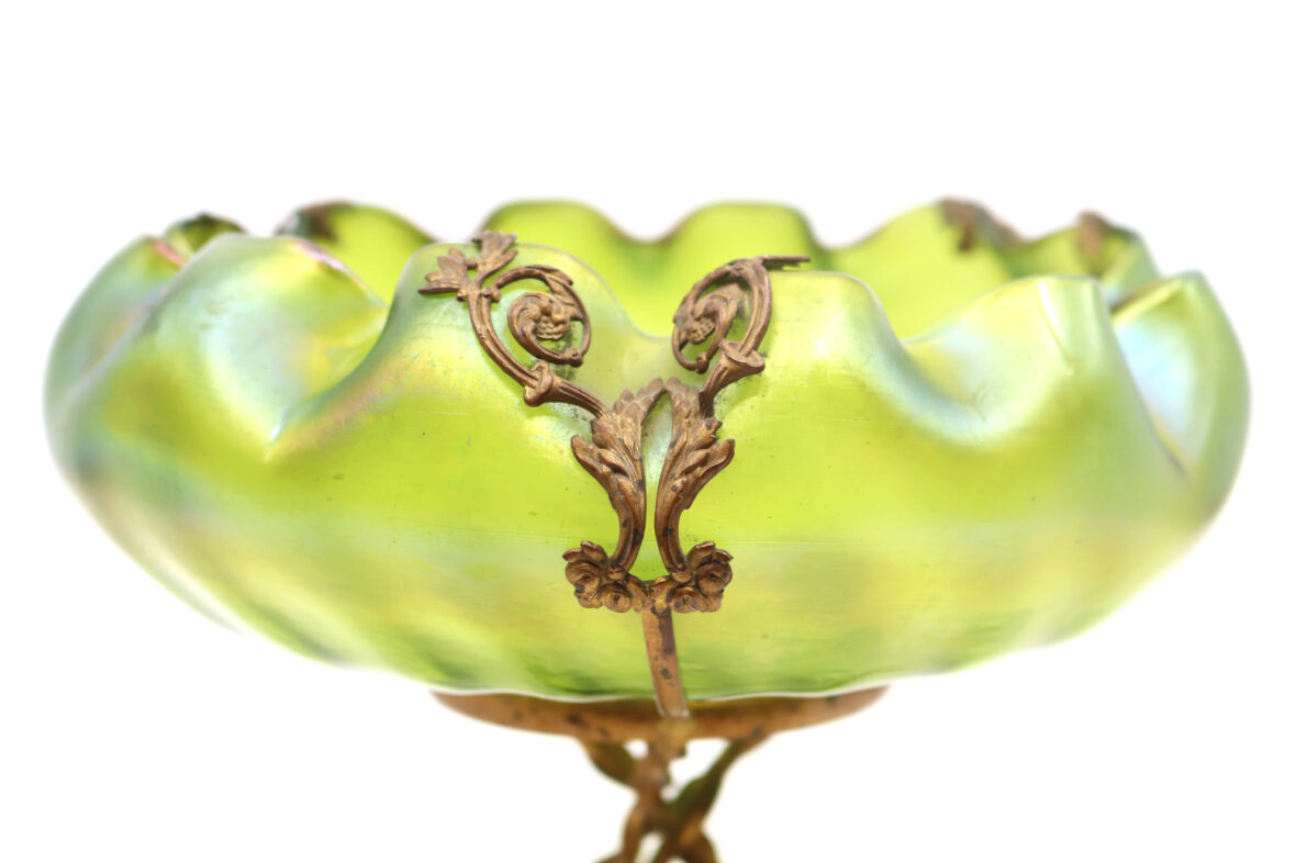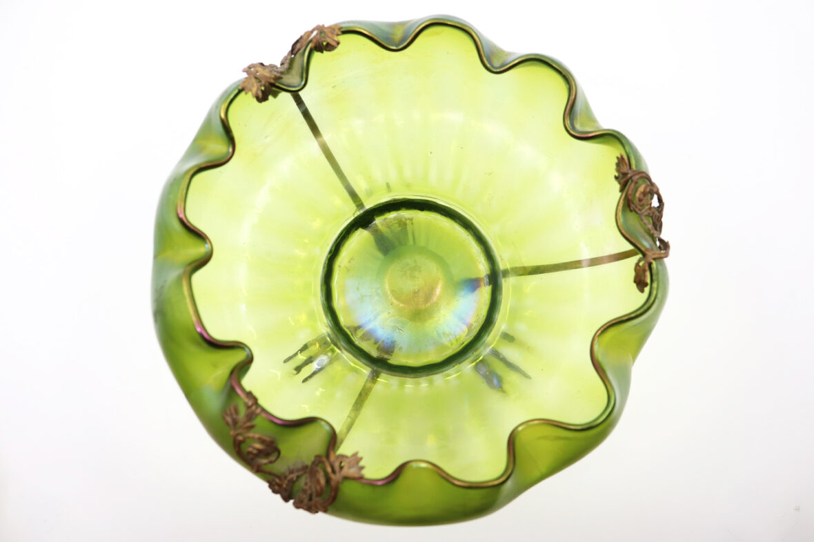 Coupe à bords polylobés en verre irisé vert et monture en bronze doré à décor de rinceaux feuillagés.