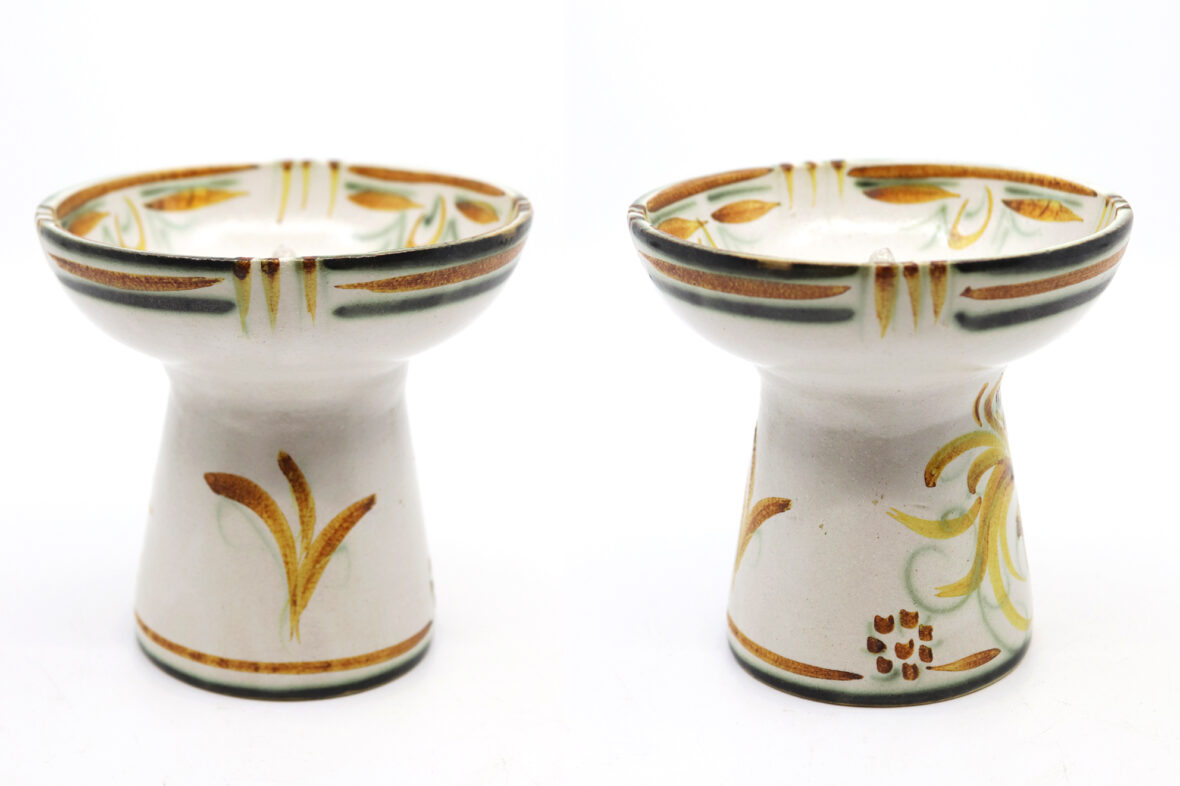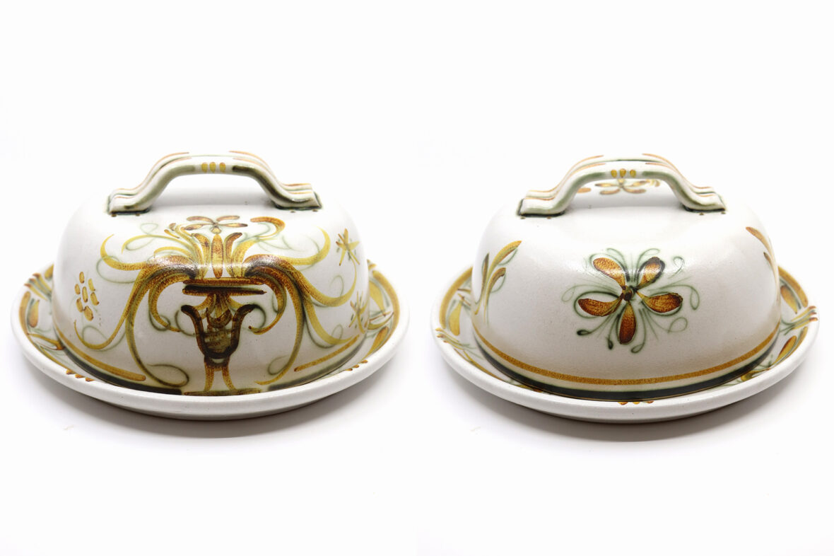 Plateau à fromage et sa cloche en grès émaillé à décor polychrome de fleurs stylisées.