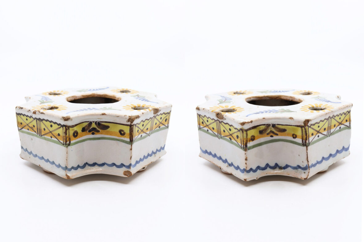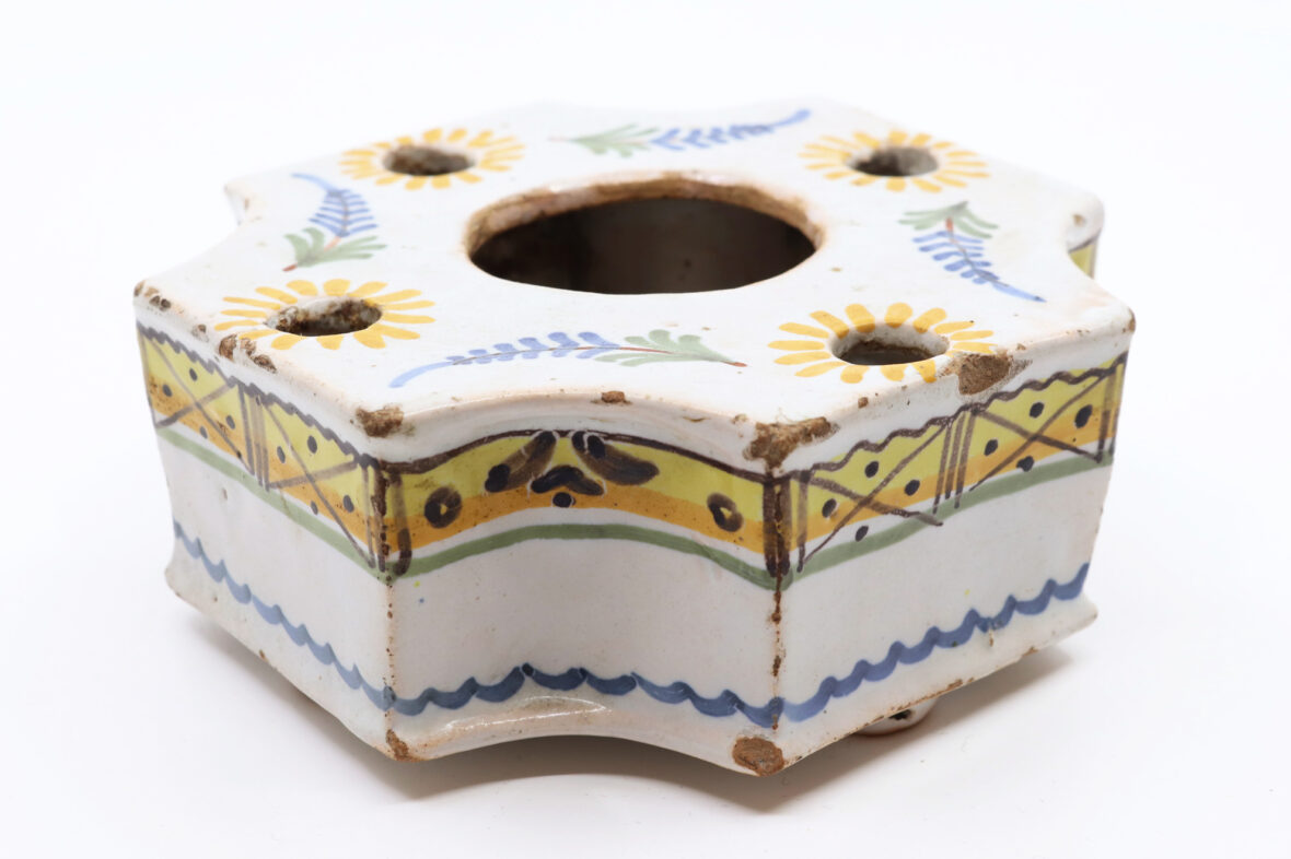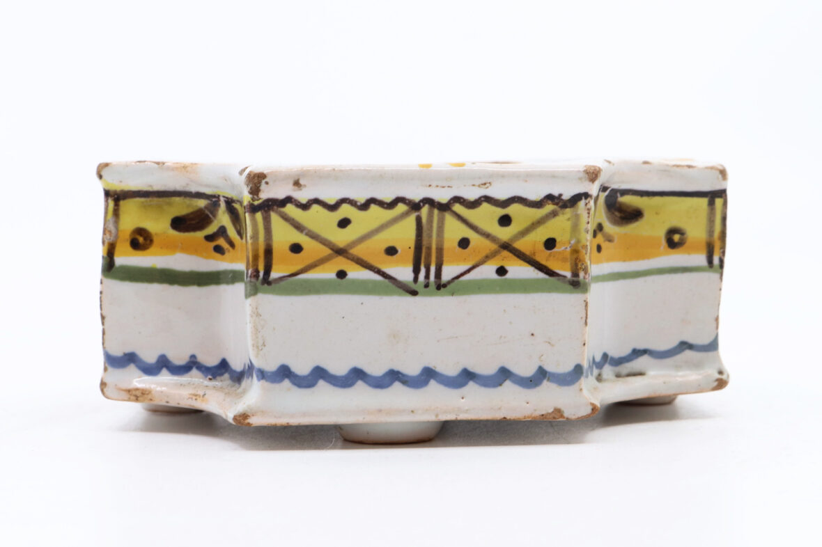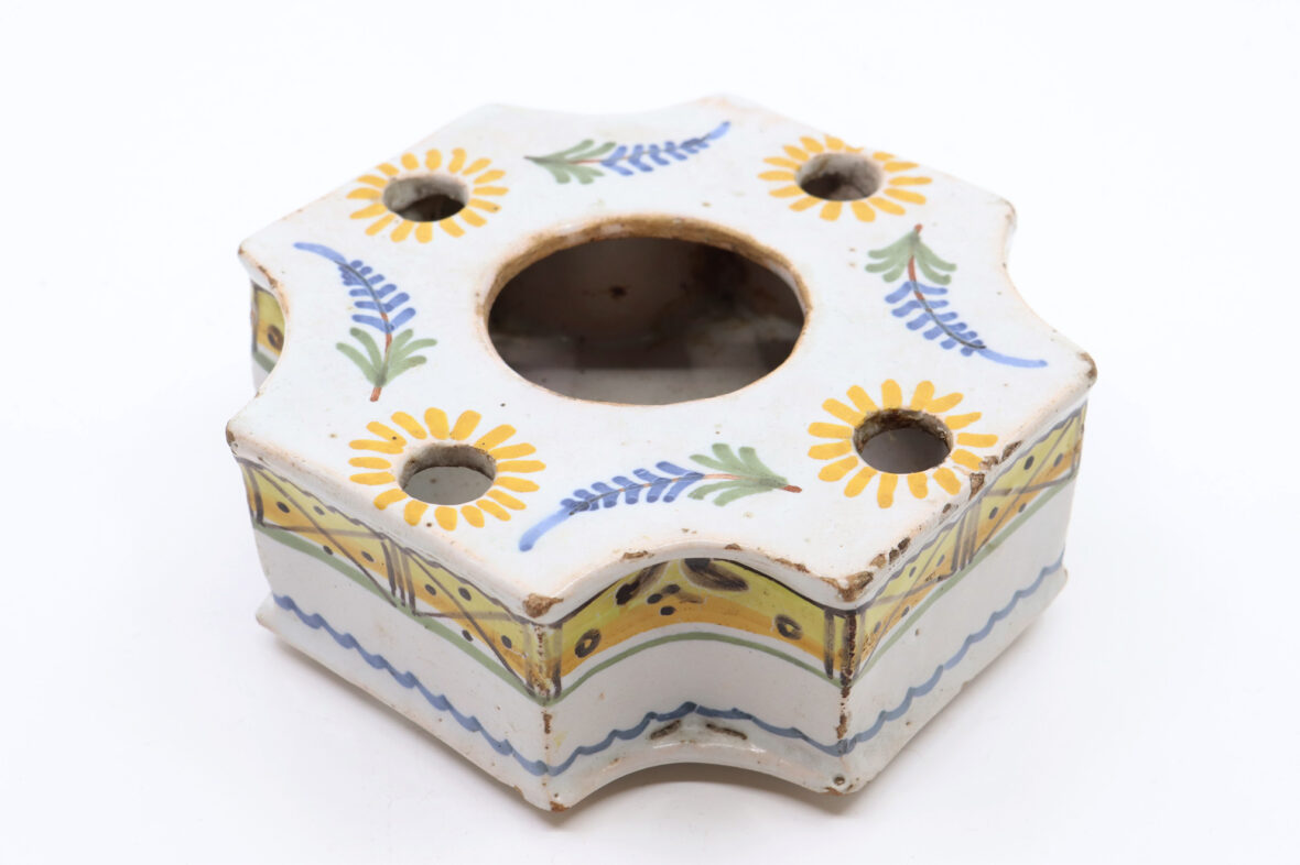 Encrier à angles concaves en faïence à décor émaillé polychrome de tiges fleuries et motifs rayonnants.