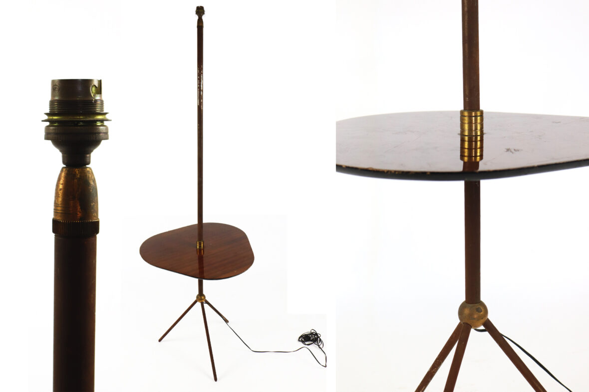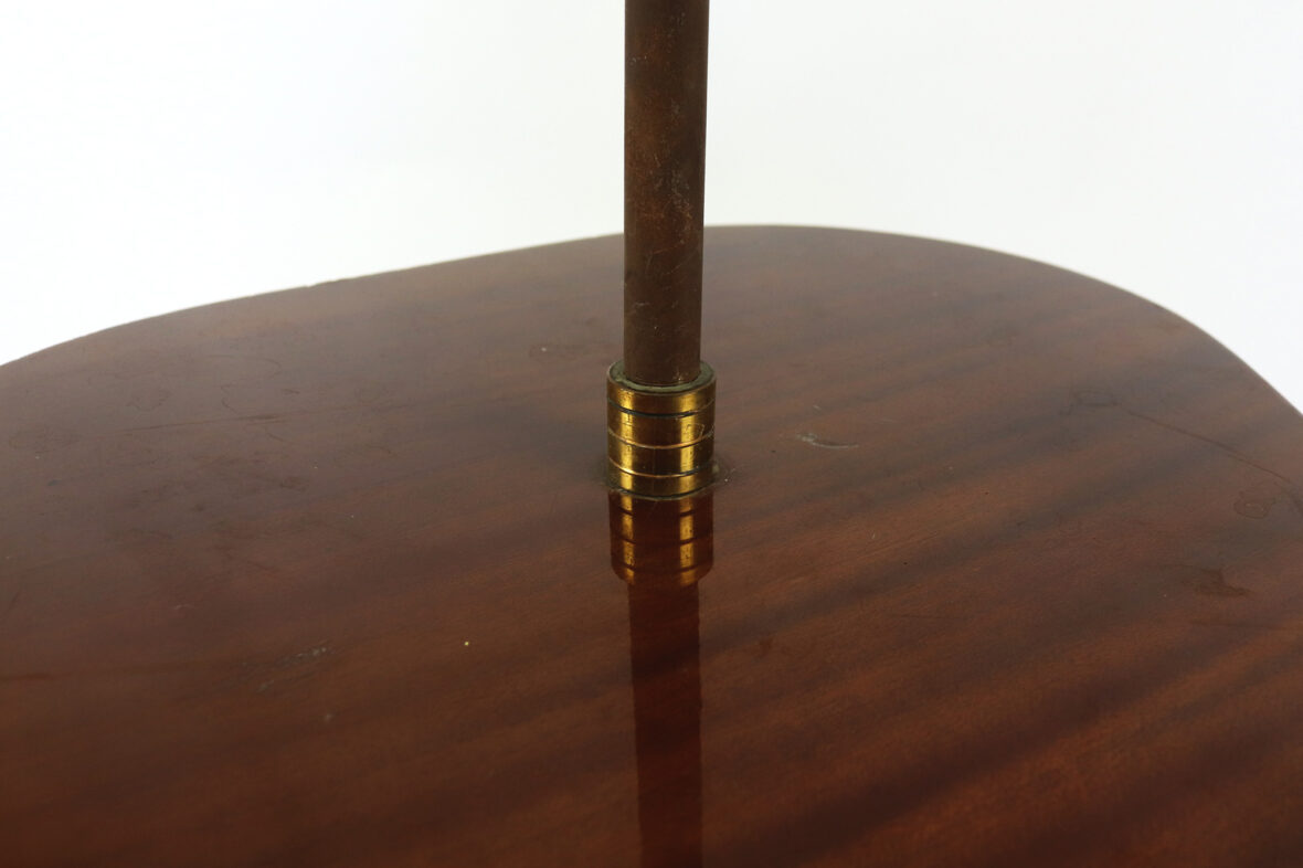 Lampadaire en métal, piètement tripode réuni par une sphère en laiton doré et surmonté d’une tablette formant serviteur en placage d’acajou.