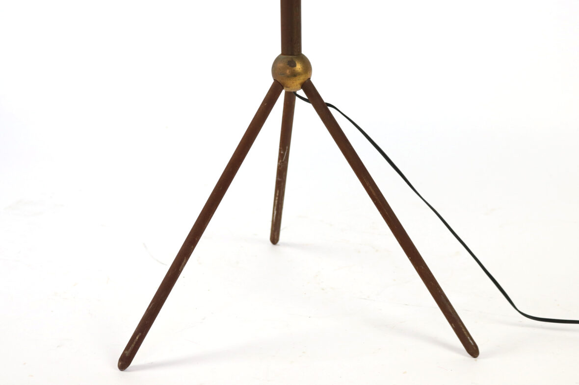 Lampadaire en métal, piètement tripode réuni par une sphère en laiton doré et surmonté d’une tablette formant serviteur en placage d’acajou.