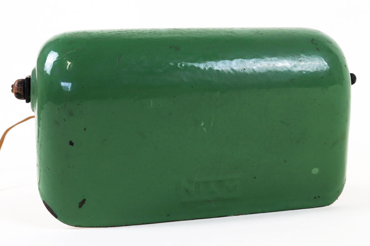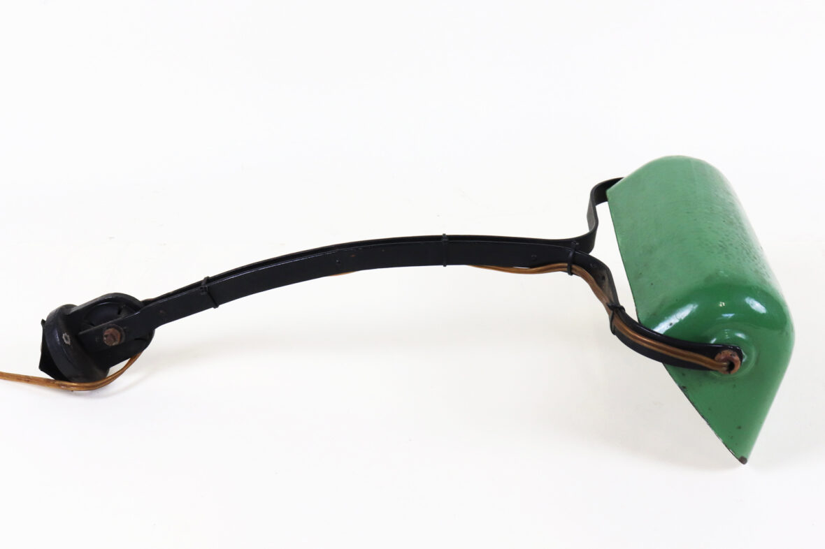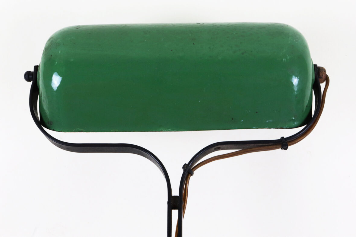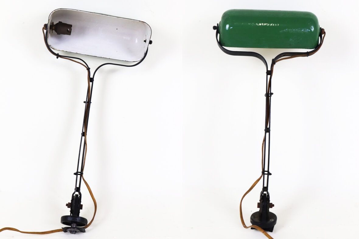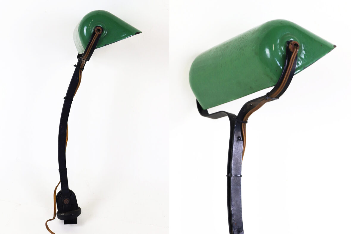 Lampe d’atelier, à fixer sur le plateau, en métal laqué noir et l’abat-jour laqué vert marqué « NIAM ».