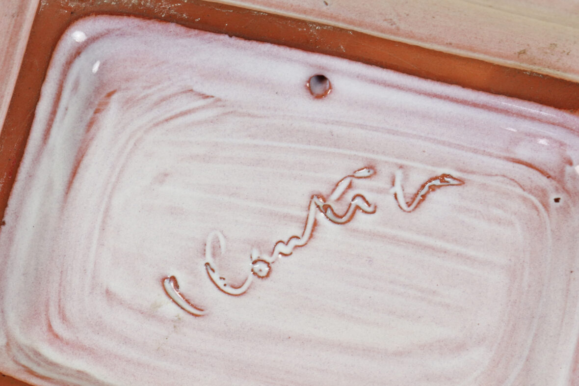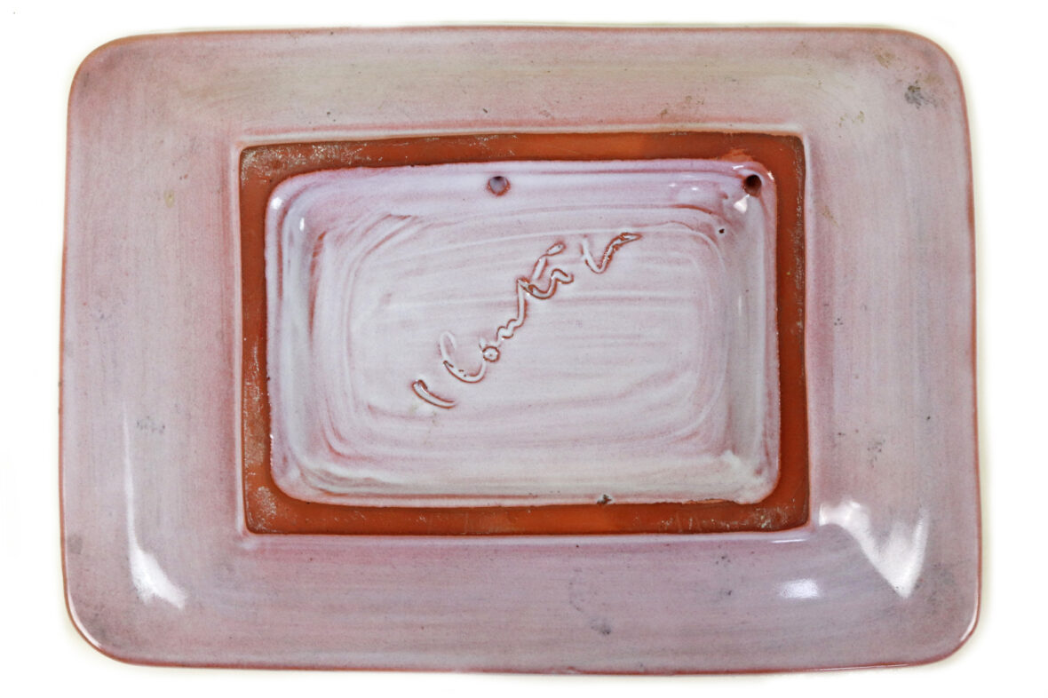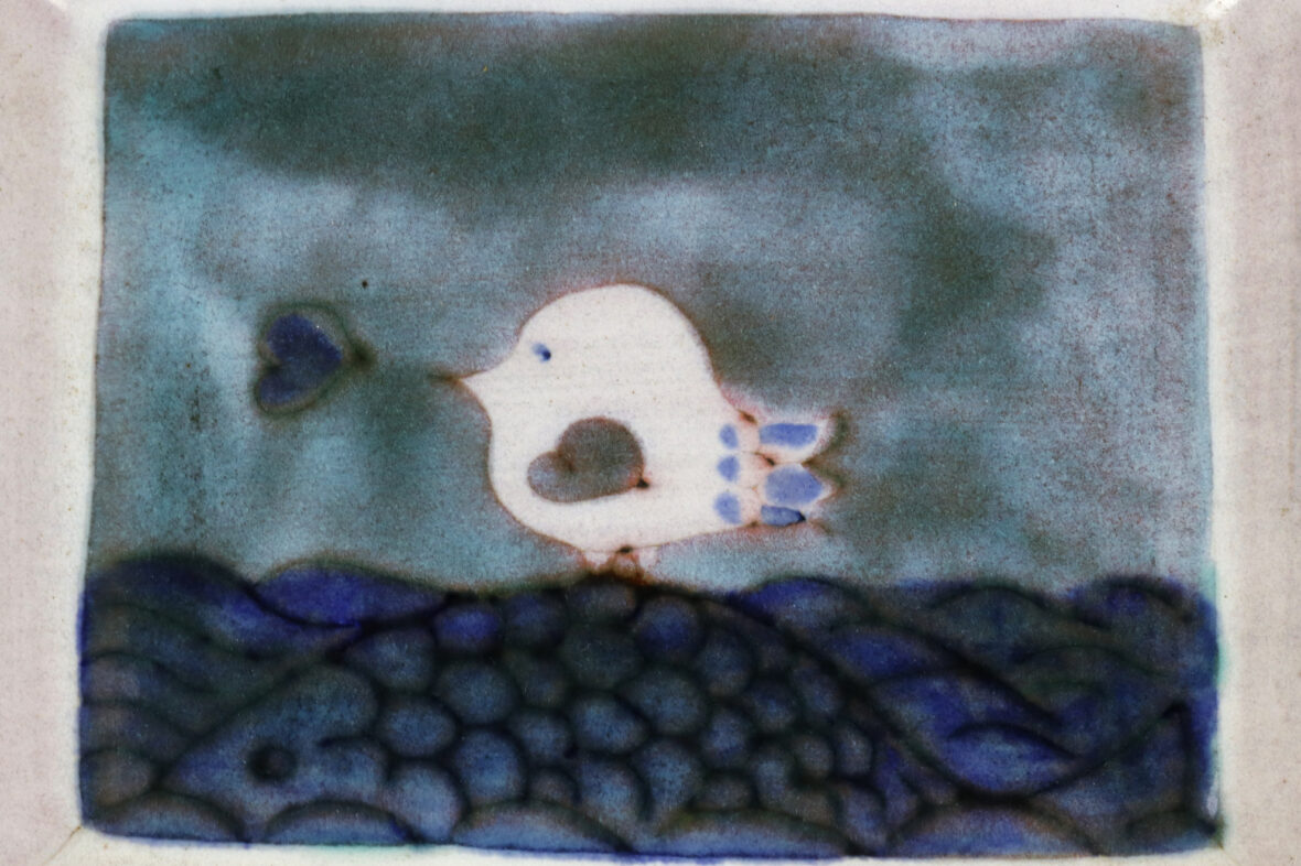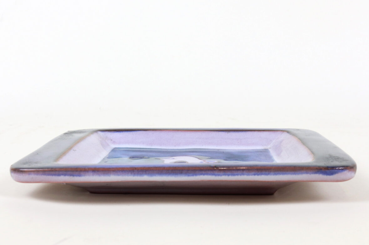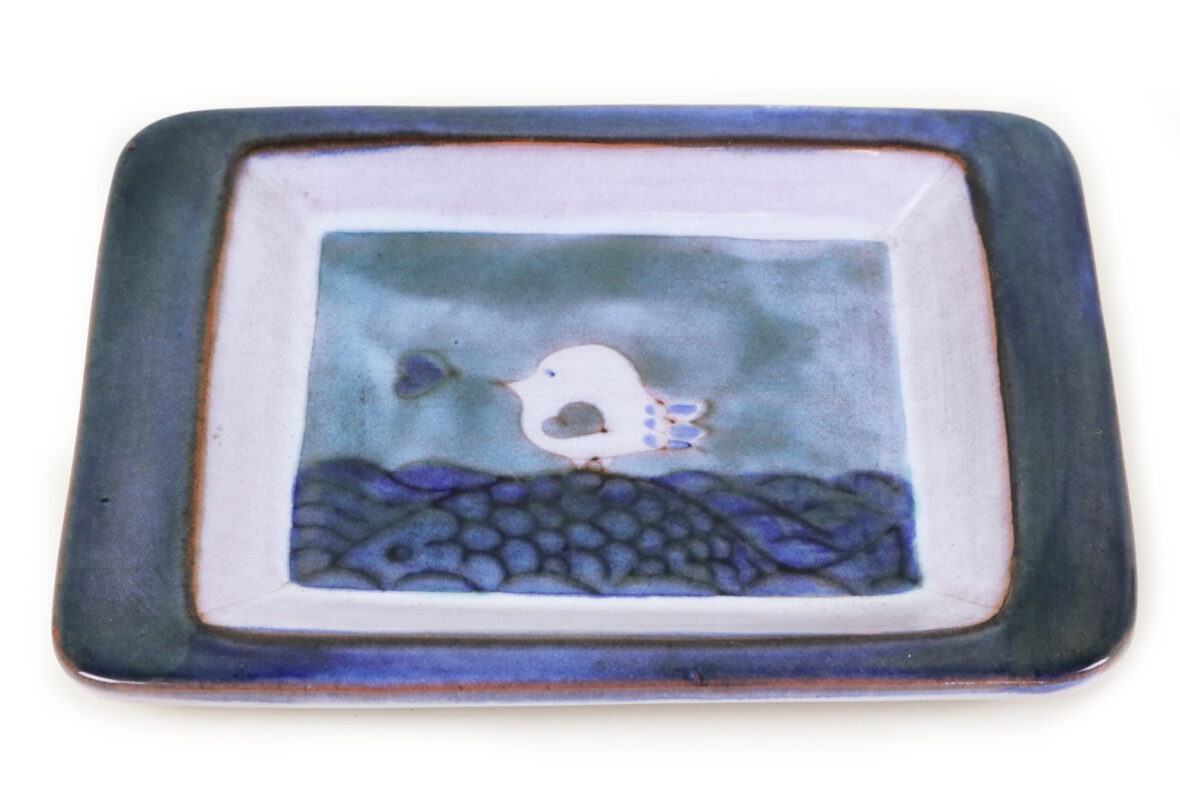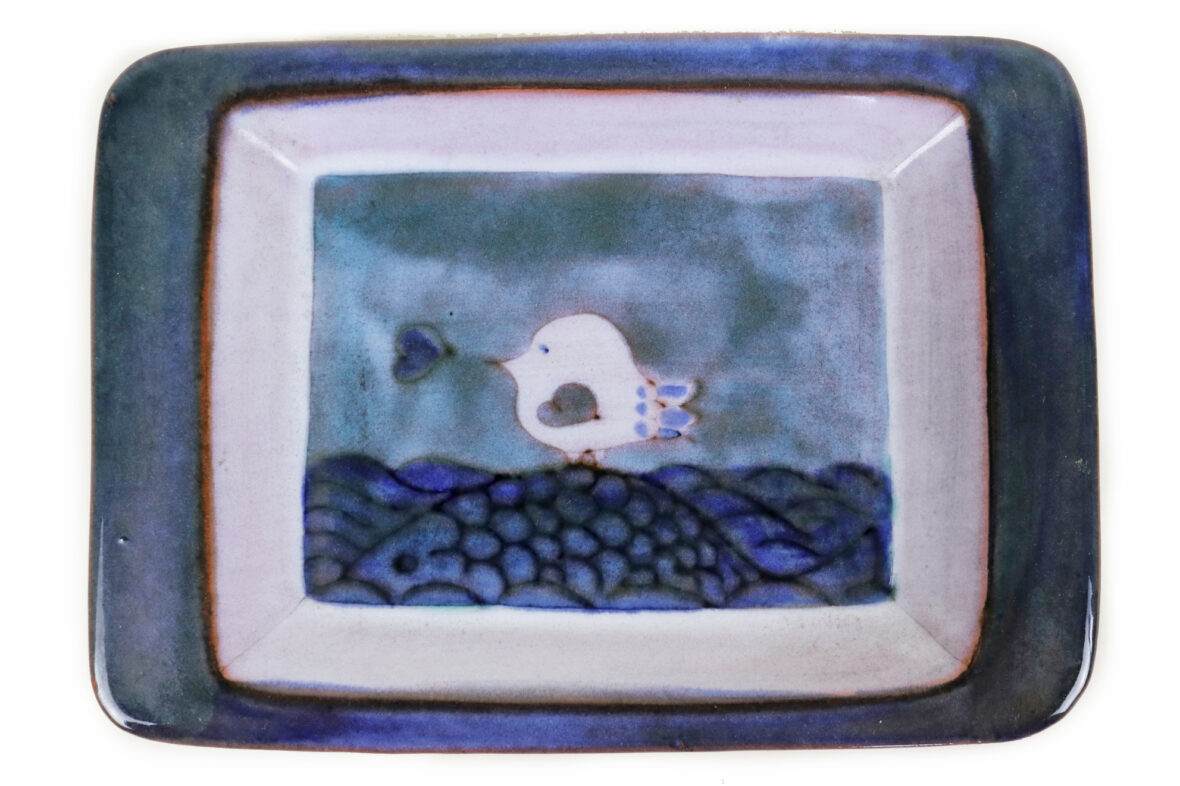 Vide poche en terre cuite émaillé à décor d’un oiseau reposant sur un poisson dans la mer.