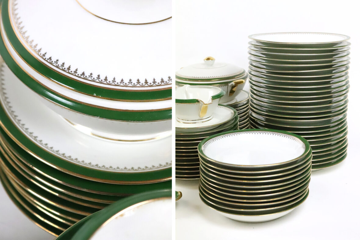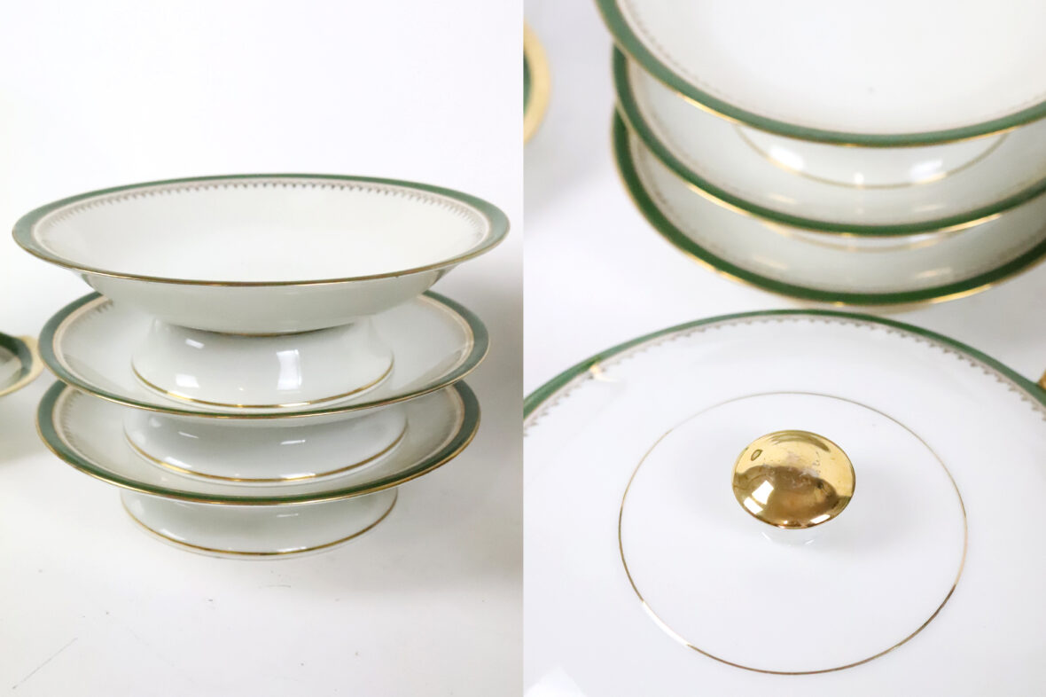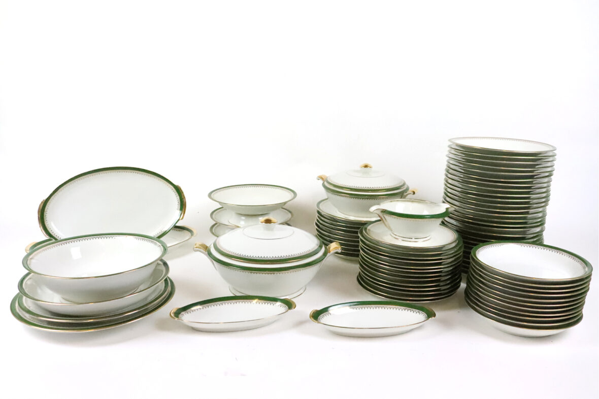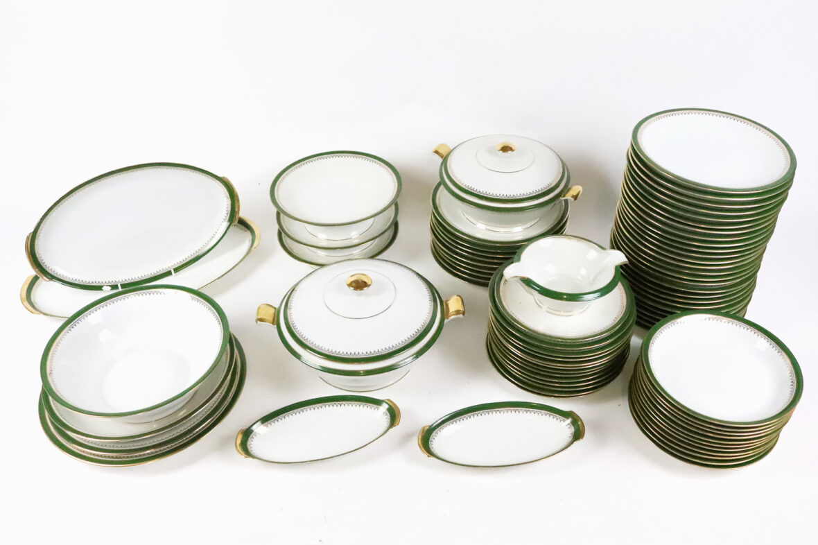 Important service de table en porcelaine à décor de liserets verts et dorés soulignés d’une frise d’agrafes comprenant 35 grandes assiettes, 11 assiettes creuses, 12 assiettes à dessert, 2 soupières couvertes, un saladier (fêle), un plat rond et creux, 2 plats ronds, 2 plats oblongs (un éclat sur l’un), 2 petits raviers, une saucière (éclat sur le bord), 2 présentoirs à mignardises et une coupe.
