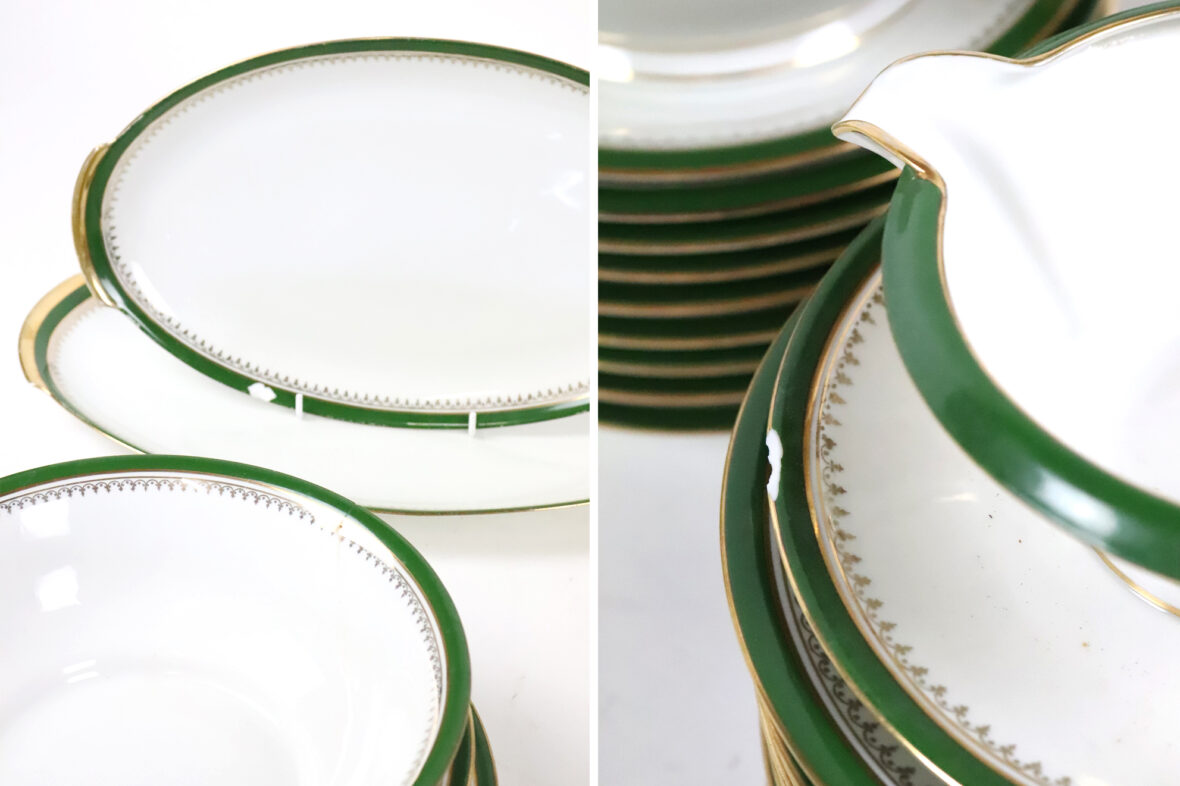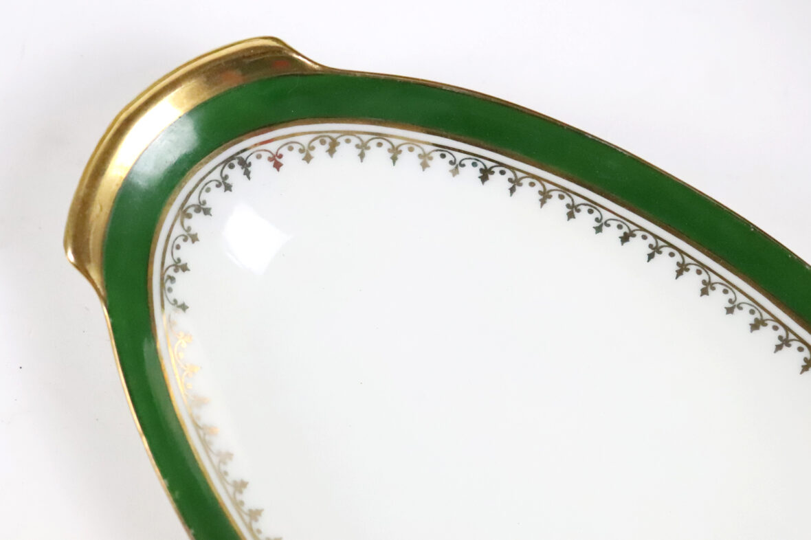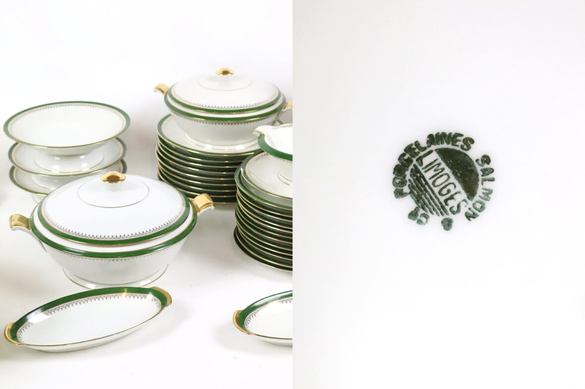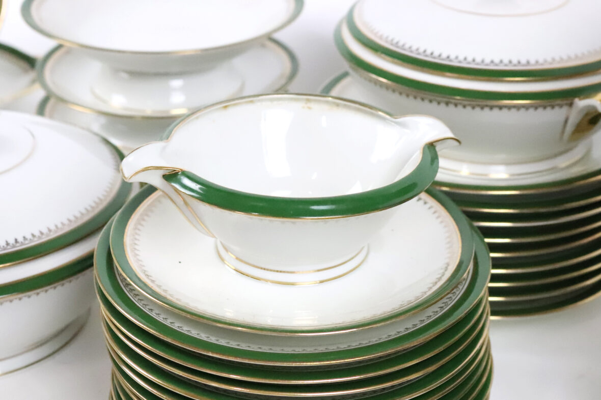 Important service de table en porcelaine à décor de liserets verts et dorés soulignés d’une frise d’agrafes comprenant 35 grandes assiettes, 11 assiettes creuses, 12 assiettes à dessert, 2 soupières couvertes, un saladier (fêle), un plat rond et creux, 2 plats ronds, 2 plats oblongs (un éclat sur l’un), 2 petits raviers, une saucière (éclat sur le bord), 2 présentoirs à mignardises et une coupe.