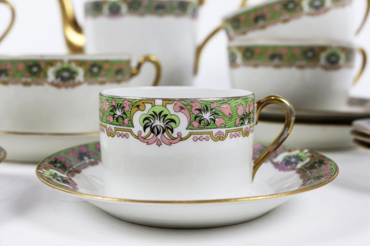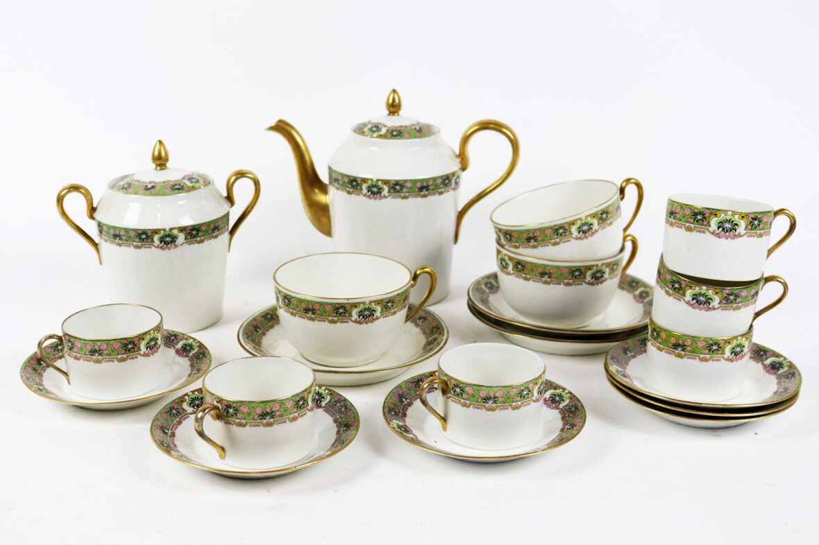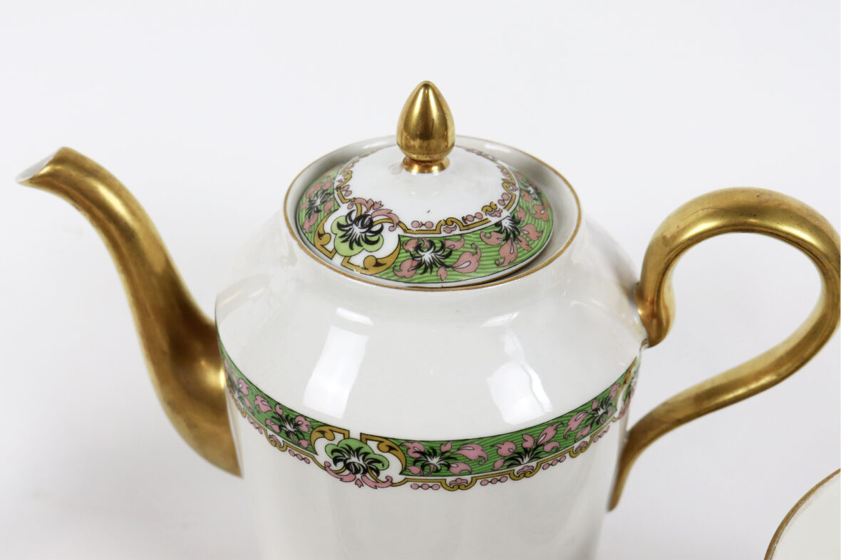 Service à thé et à café en porcelaine à décor d’une frise végétal sur fond vert, rehaut de dorure comprenant une théière, un sucrier, 3 tasses à thé et leurs soucoupes, 6 tasses à café et leurs soucoupes. (Accident sur la théière).