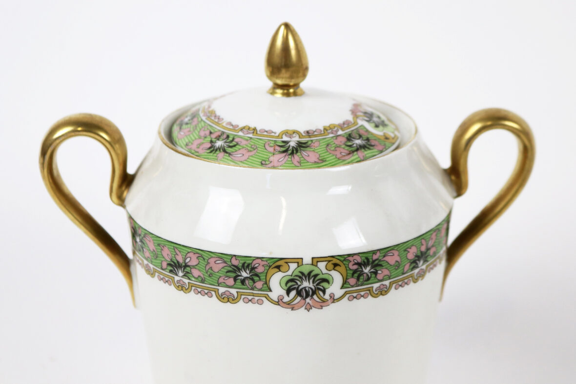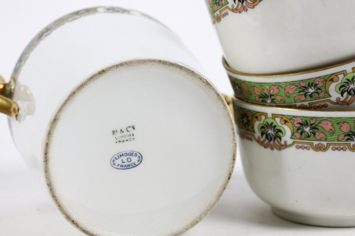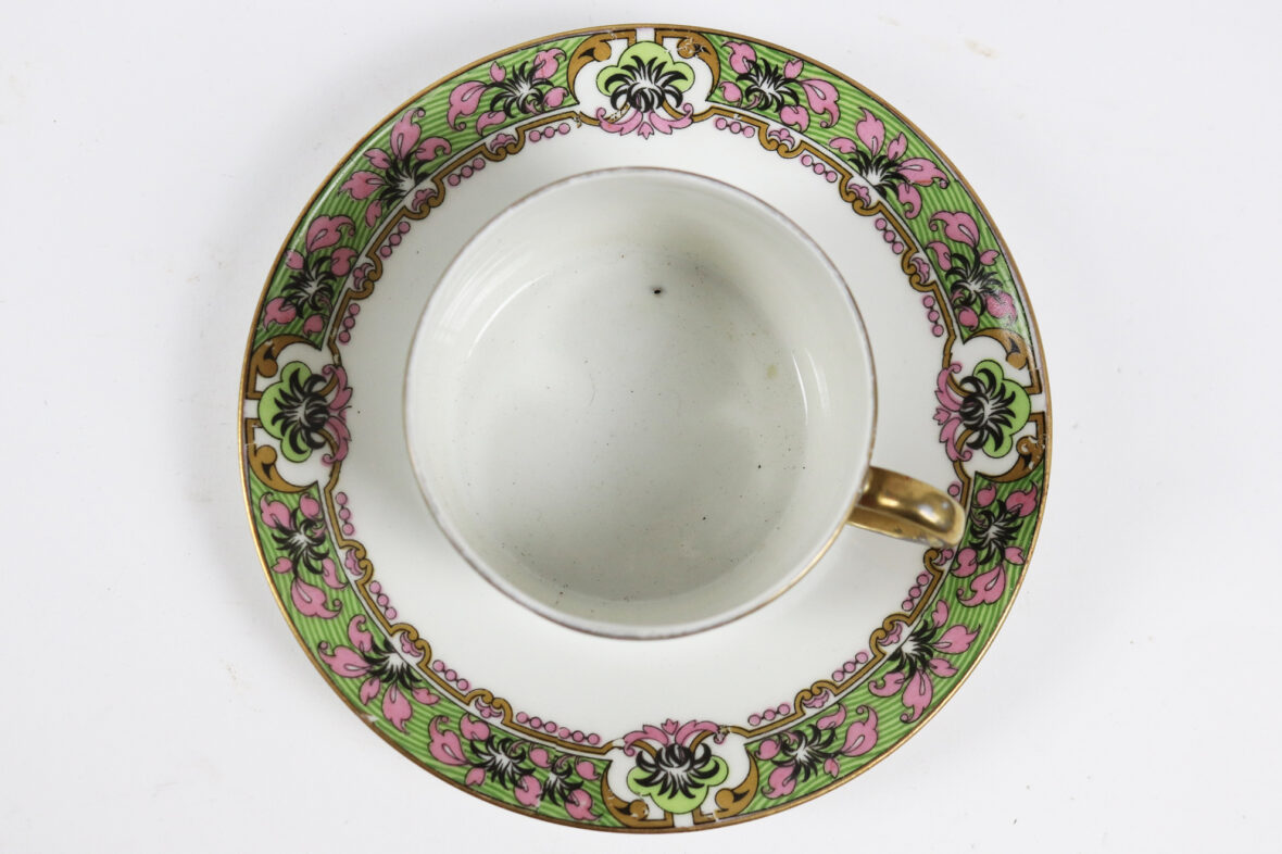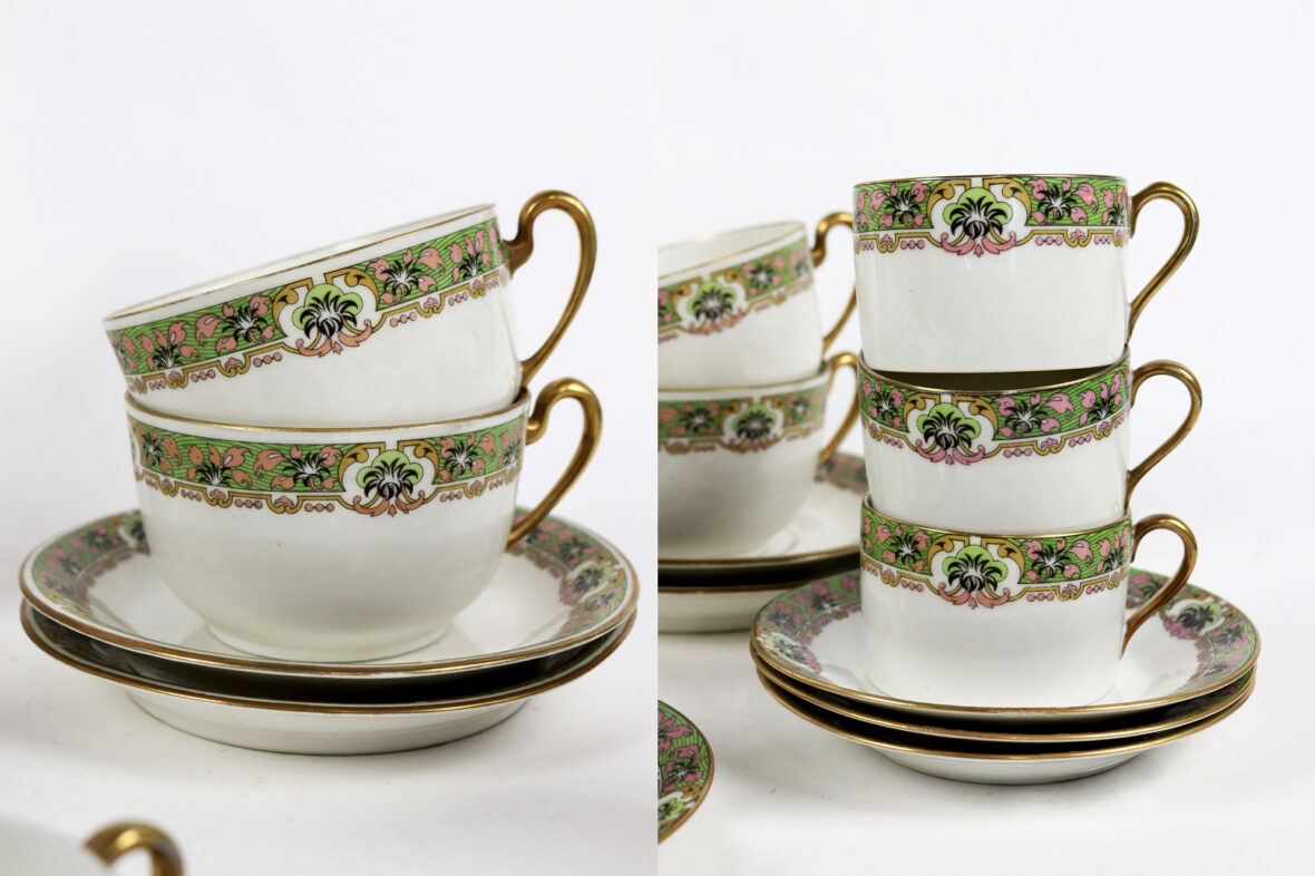 Service à thé et à café en porcelaine à décor d’une frise végétal sur fond vert, rehaut de dorure comprenant une théière, un sucrier, 3 tasses à thé et leurs soucoupes, 6 tasses à café et leurs soucoupes. (Accident sur la théière).