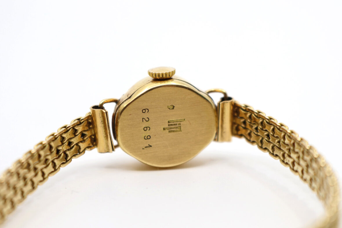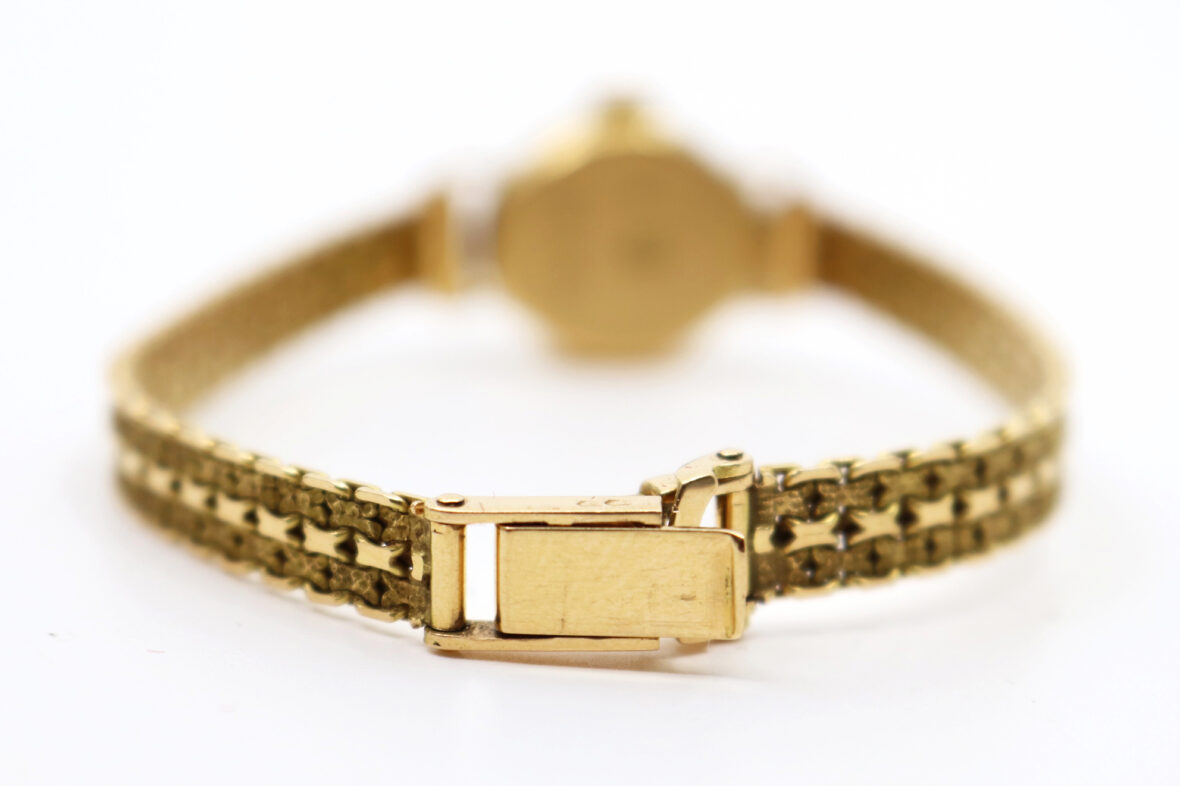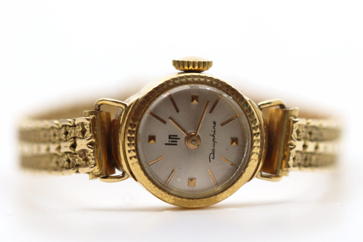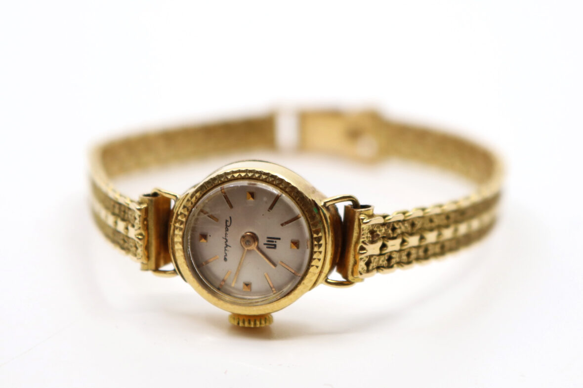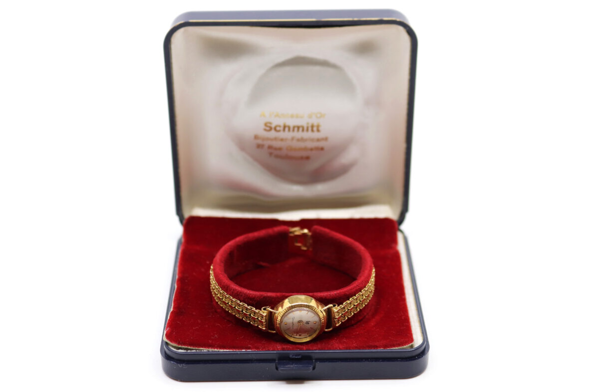 Montre de dame en or jaune modèle Dauphine, le bracelet à mailles tressées. Cadran à index bâtons.