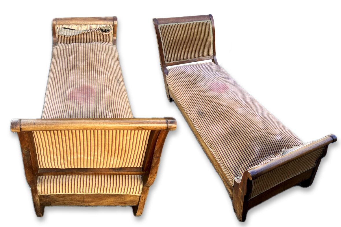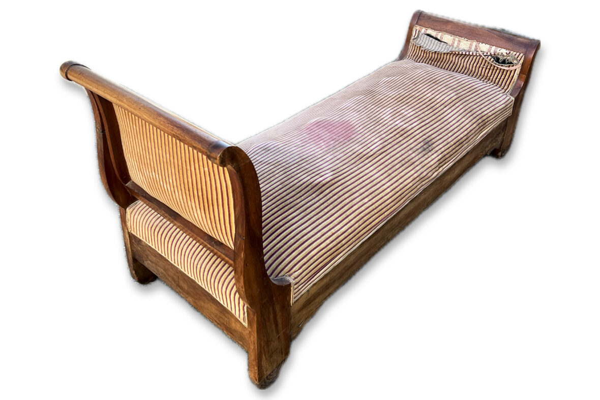Lit de repos en bois à dossier renversé. Garniture de tissu rayé. XIXe.