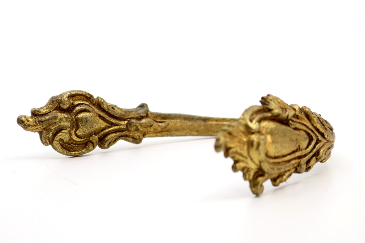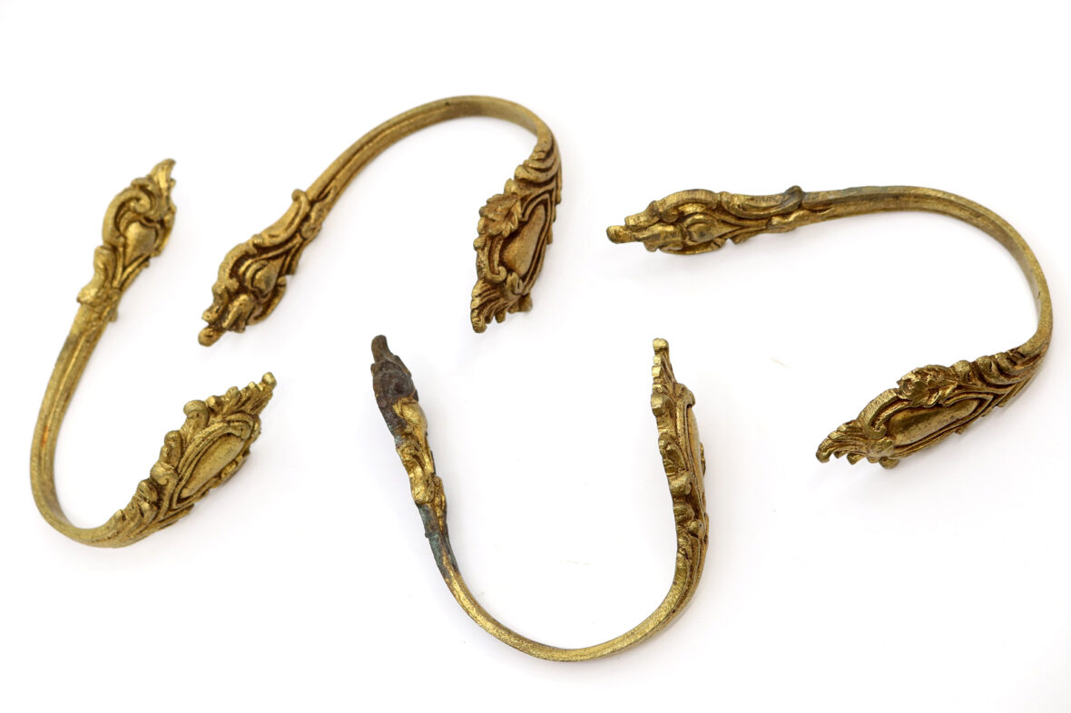 – 3 embrases de rideau en bronze doré et ciselé à décor de coquille stylisée.