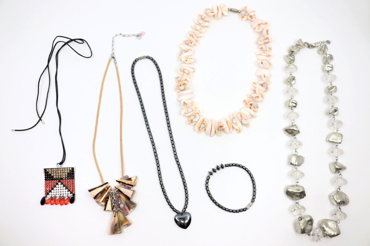 Lot de bijoux fantaisie comprenant divers colliers et bracelets.