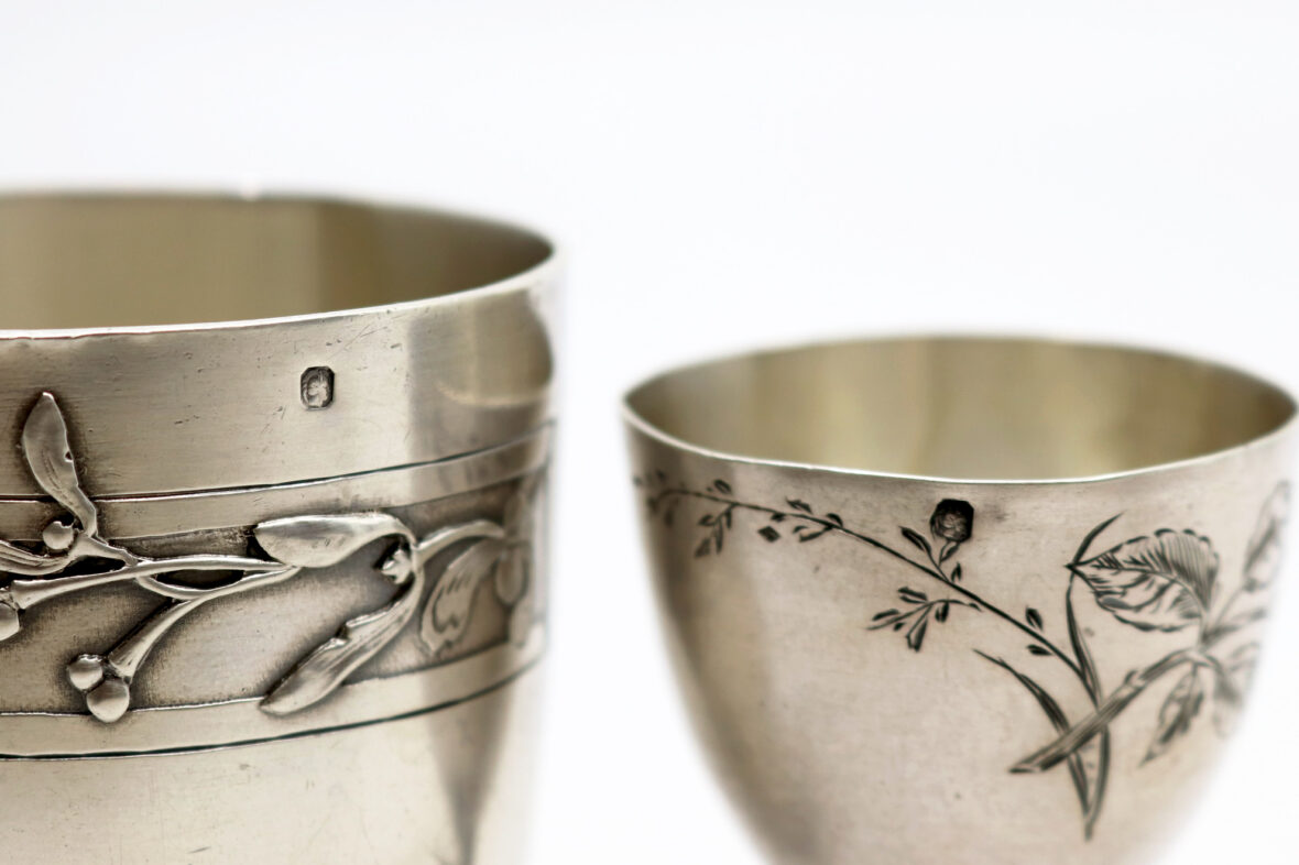 – une timbale à fond plat à frise de gui de style art nouveau. Marqué « Alice ». Poinçon Minerve. (Enfoncements).