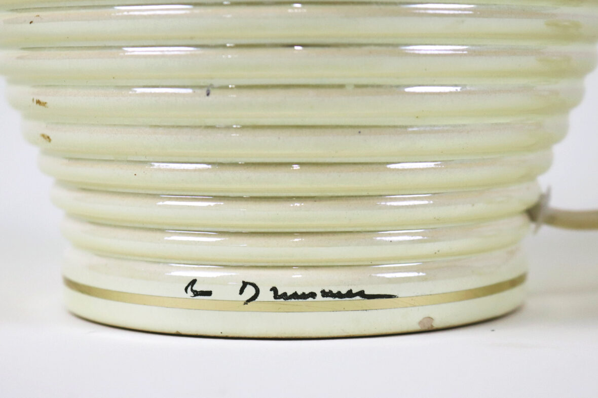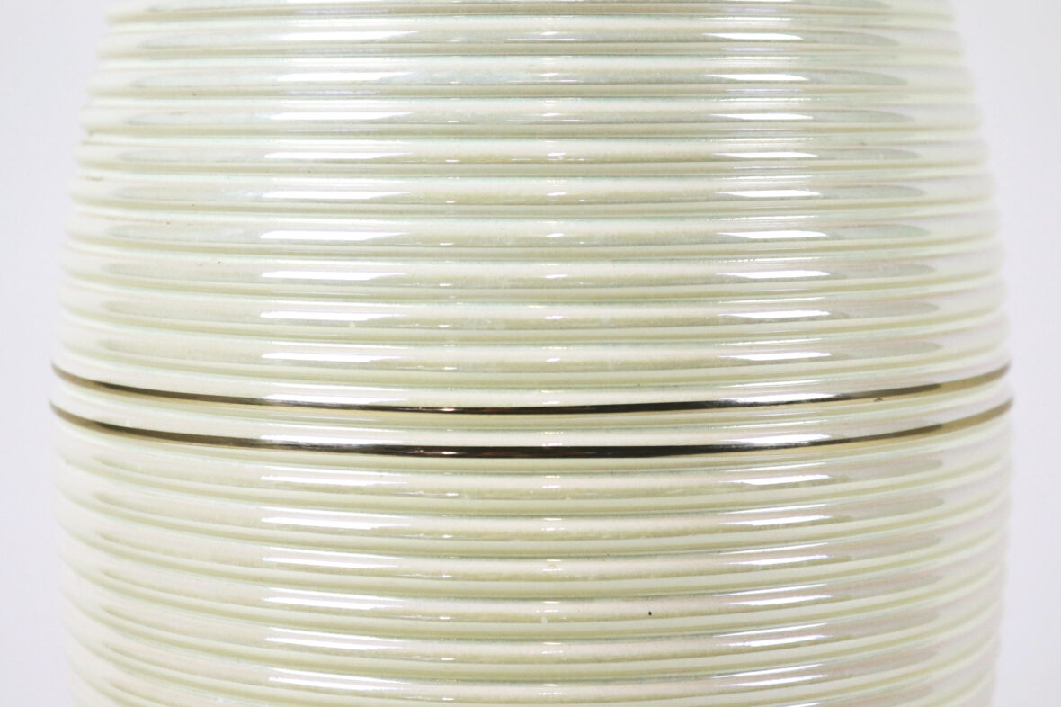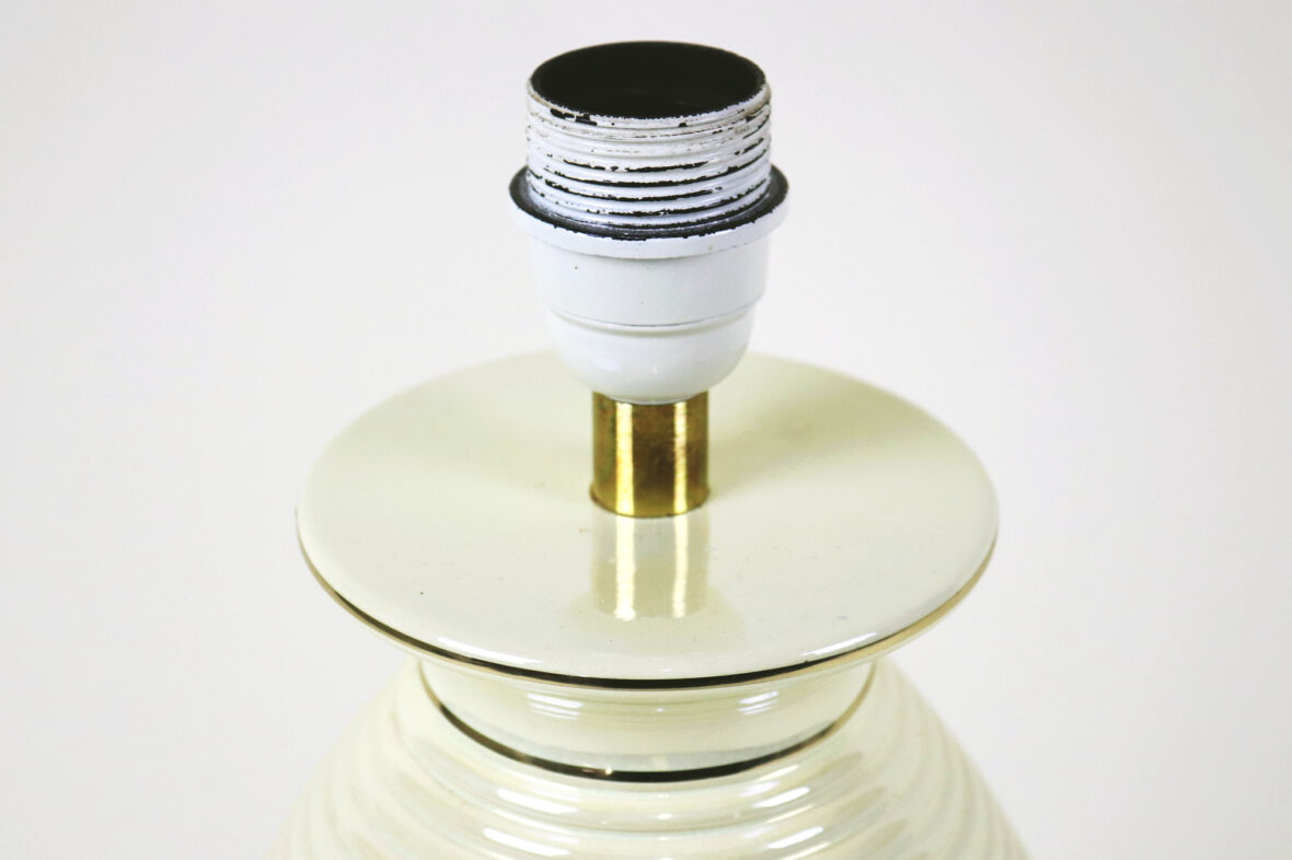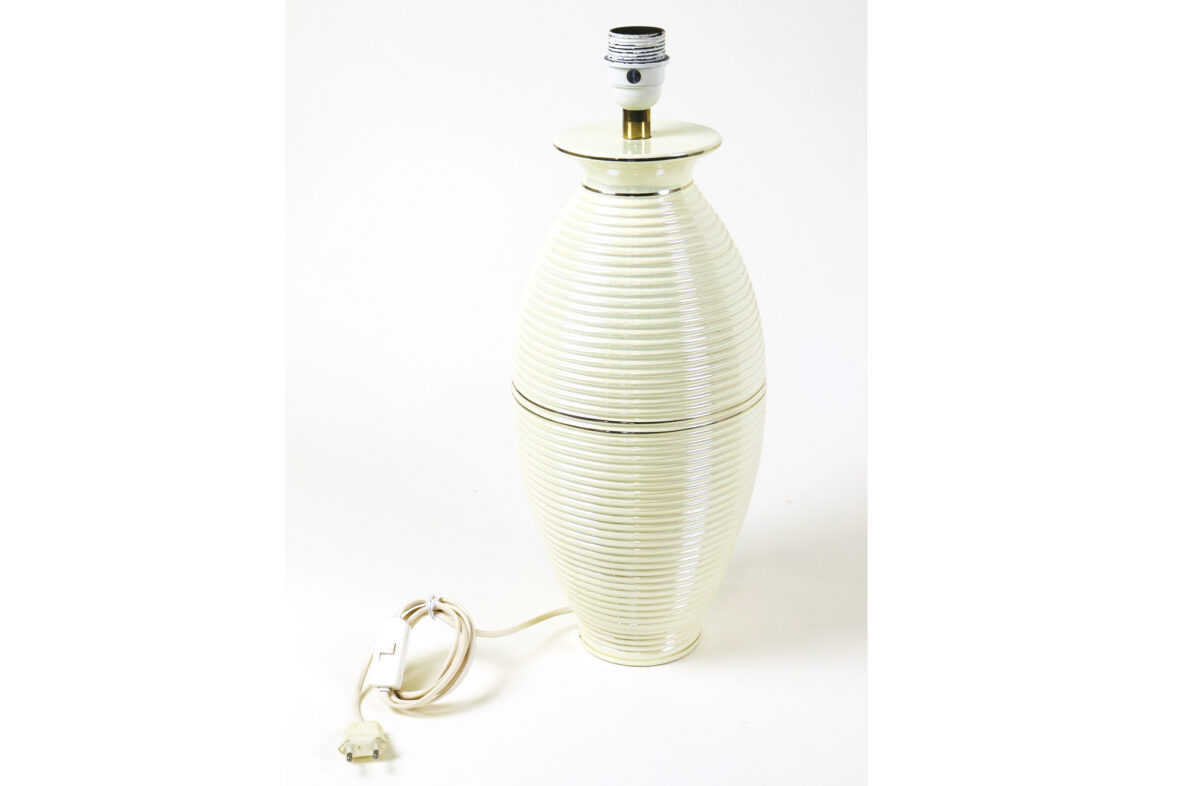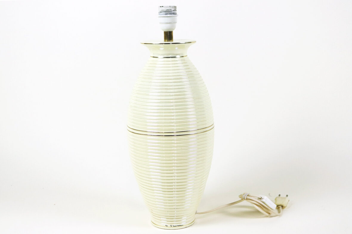 Pied de lampe en céramique émaillée à décor irisé, rehauts de filets dorés.