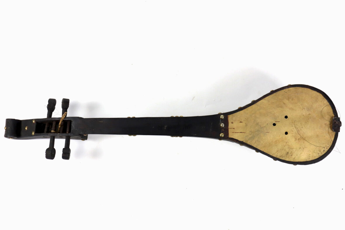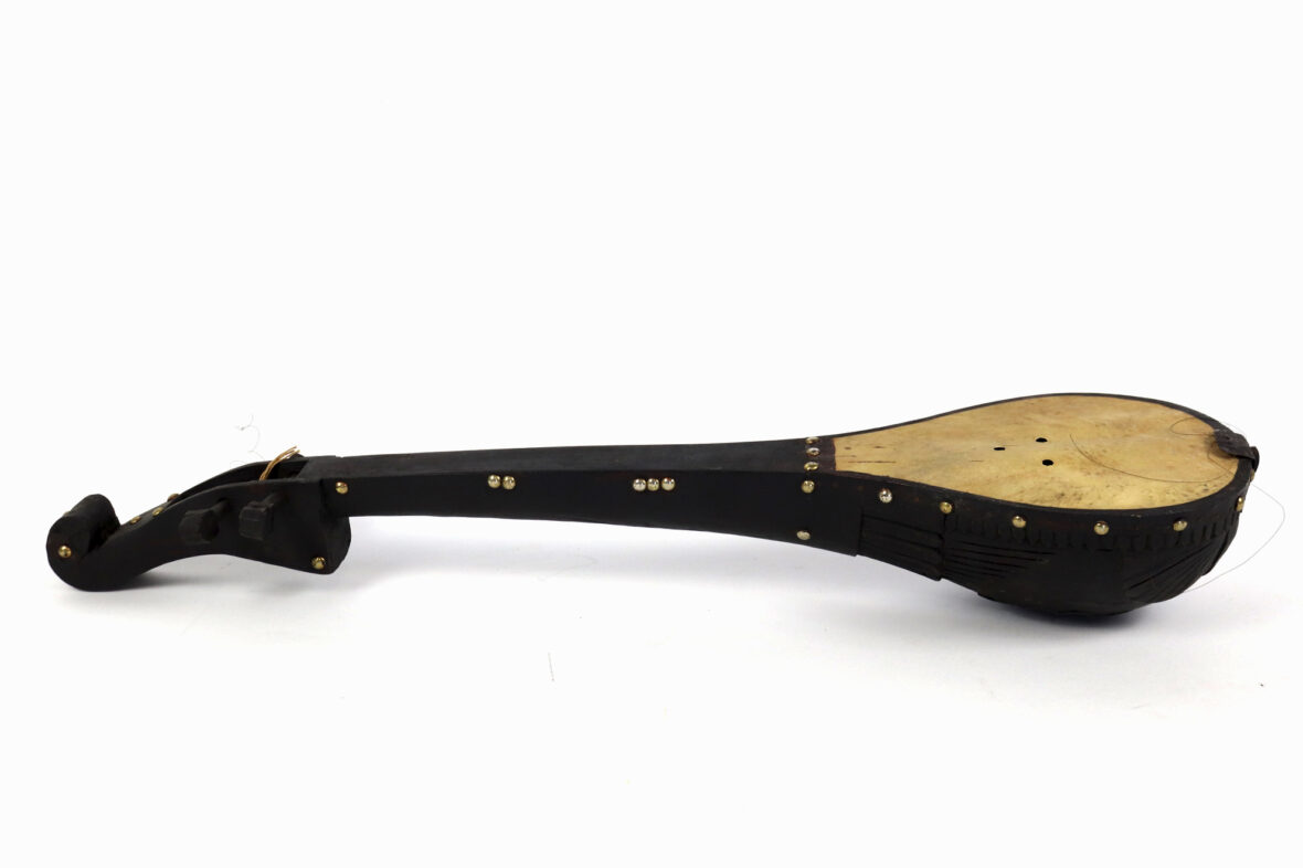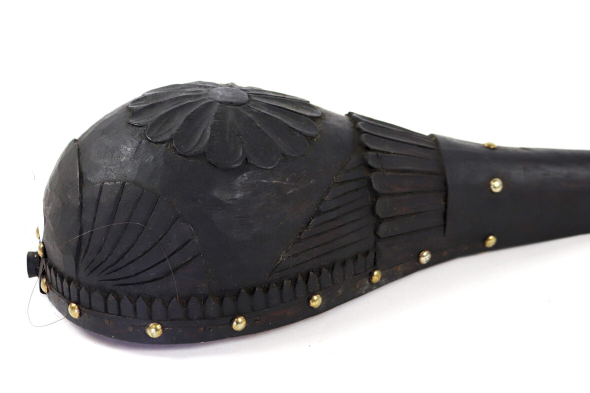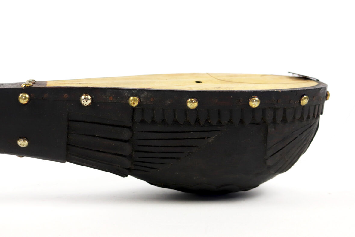Luth en bois noirci et sculpté à décor de fleur et feuillage stylisés, ornementation de clous dorés. La table tendue de peau.