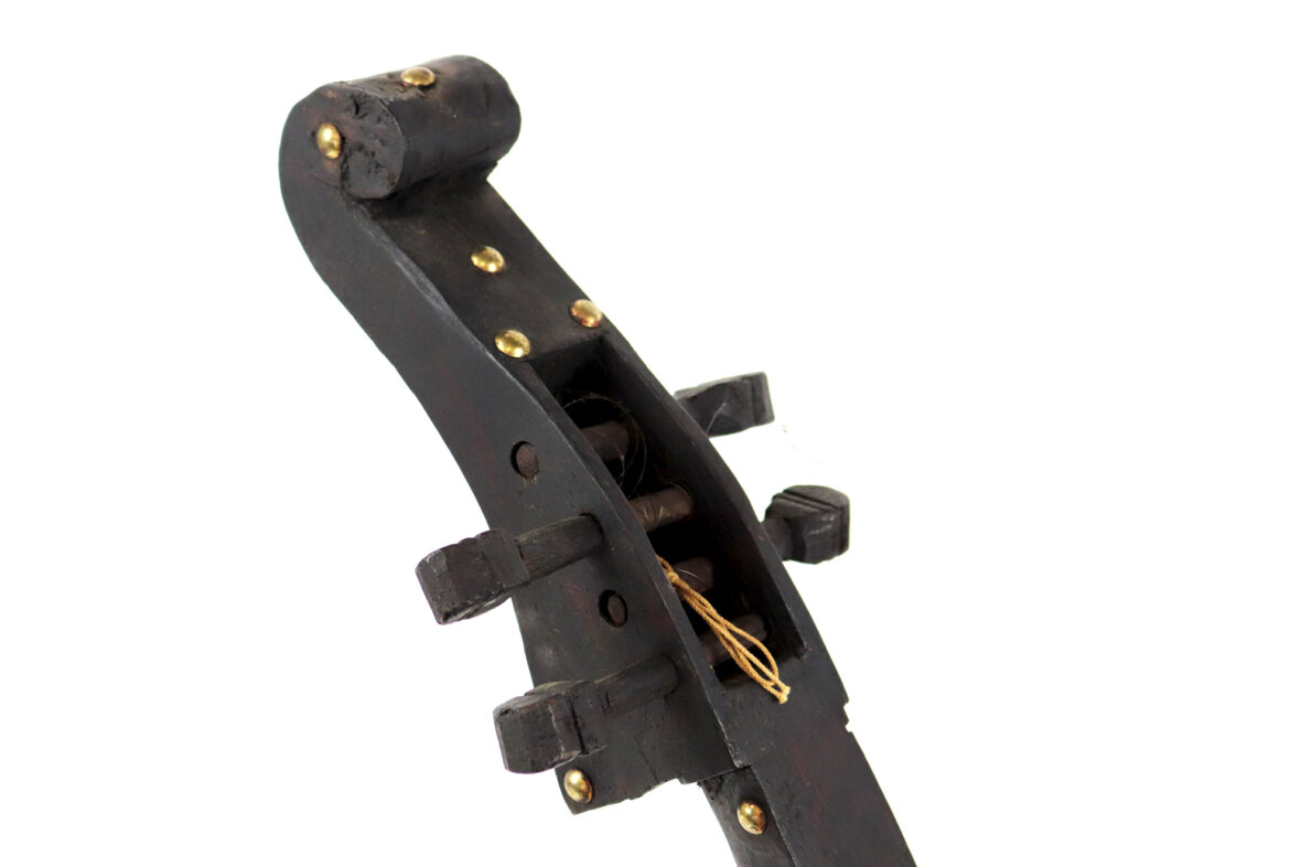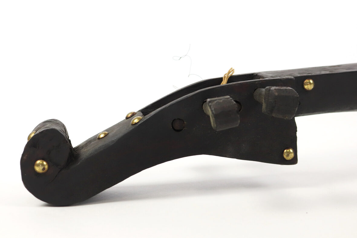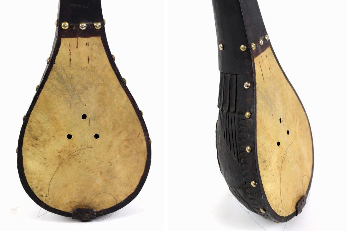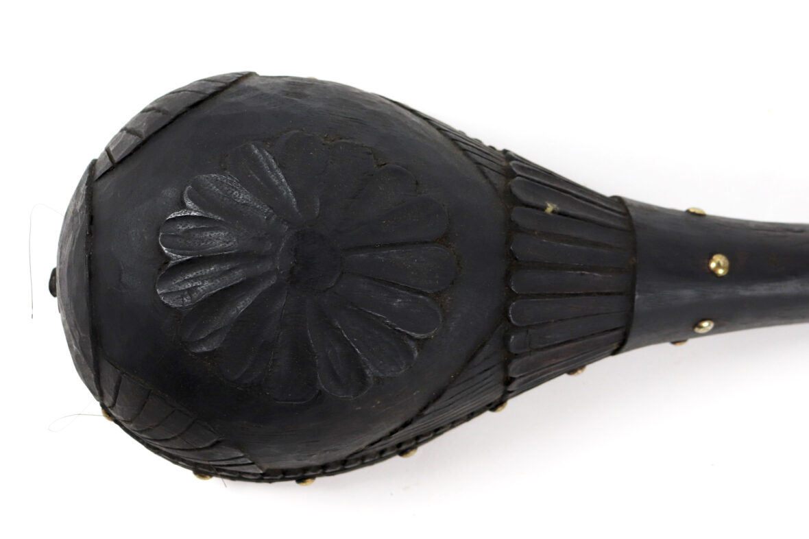 Luth en bois noirci et sculpté à décor de fleur et feuillage stylisés, ornementation de clous dorés. La table tendue de peau.