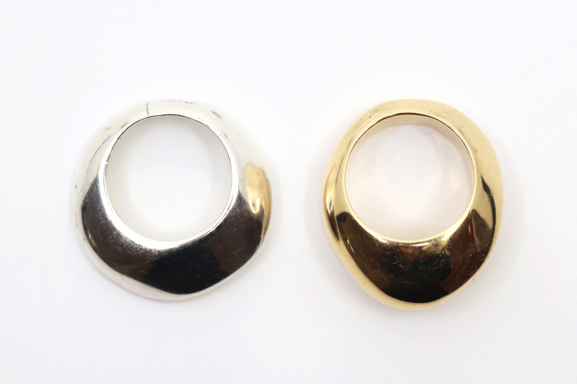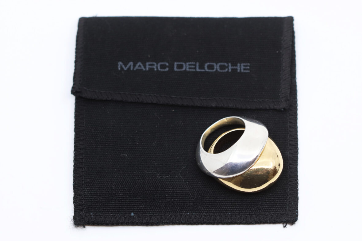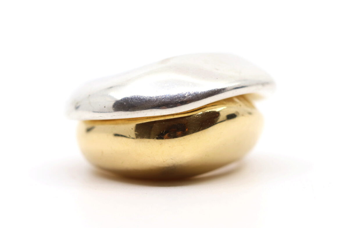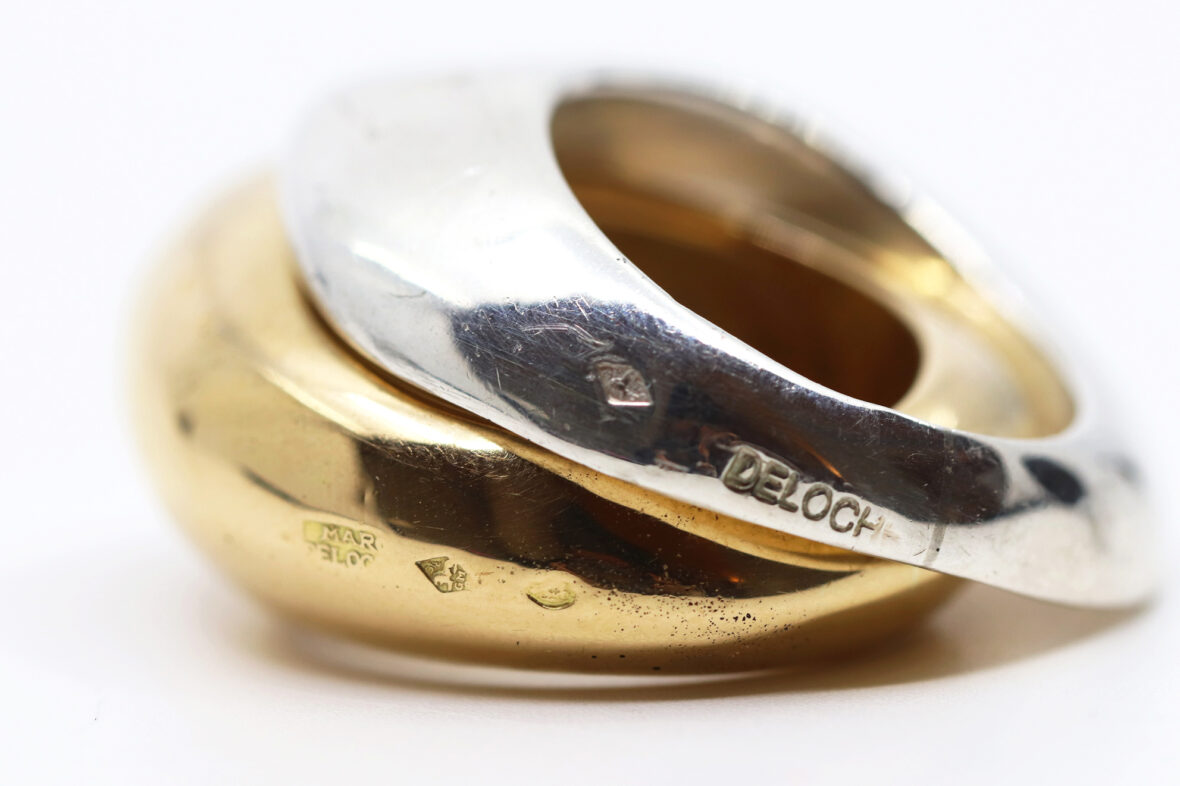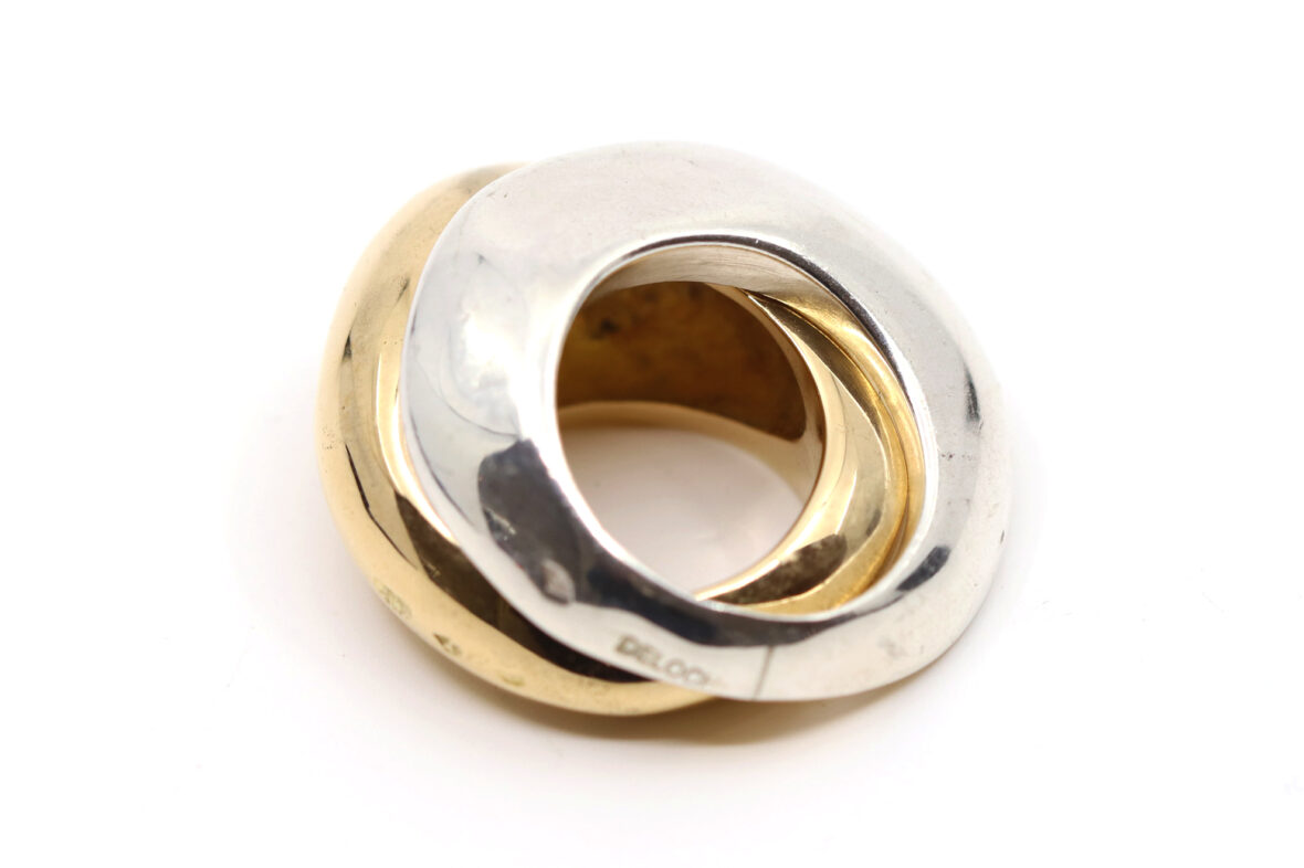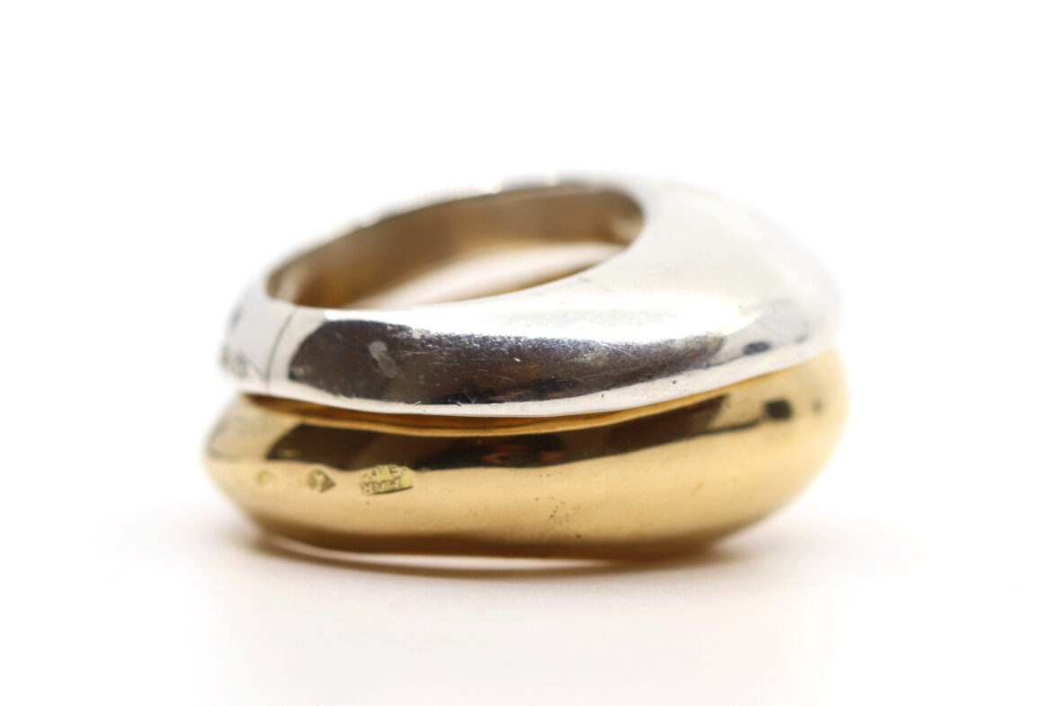 Bague à deux anneaux s’imbriquant l’un en argent, l’autre en or jaune.