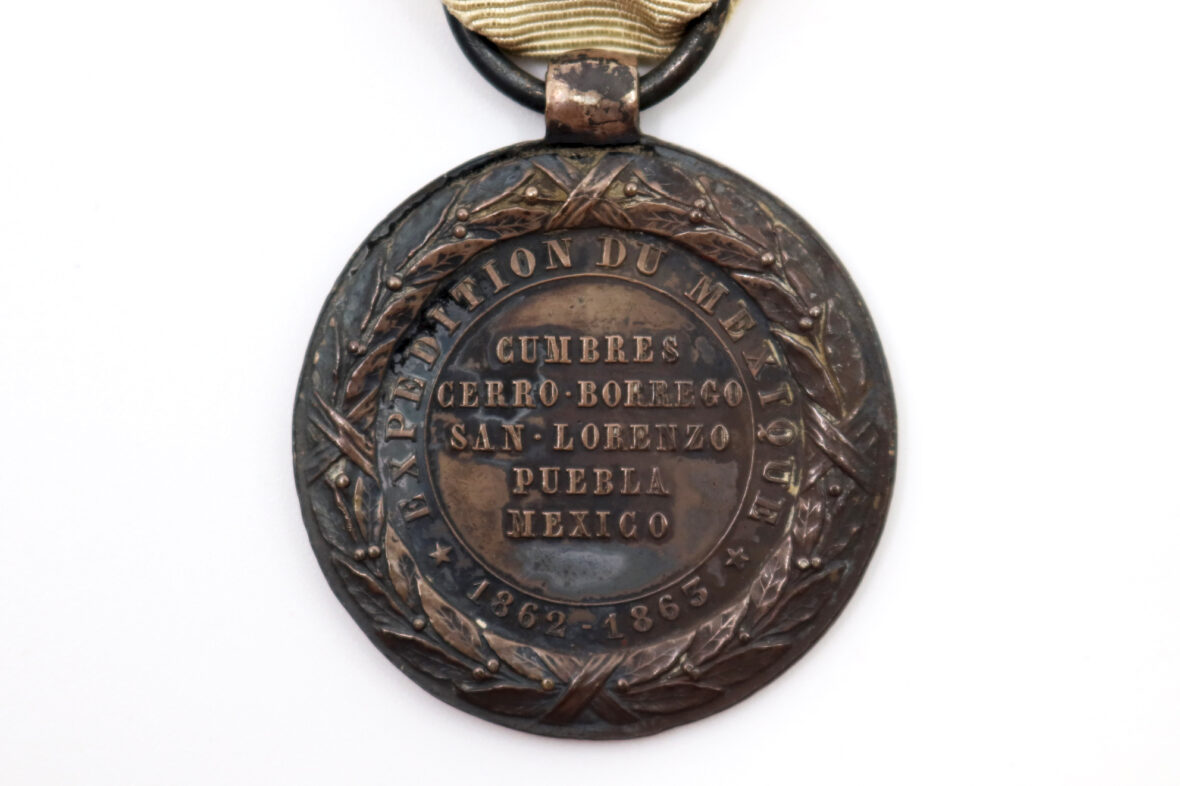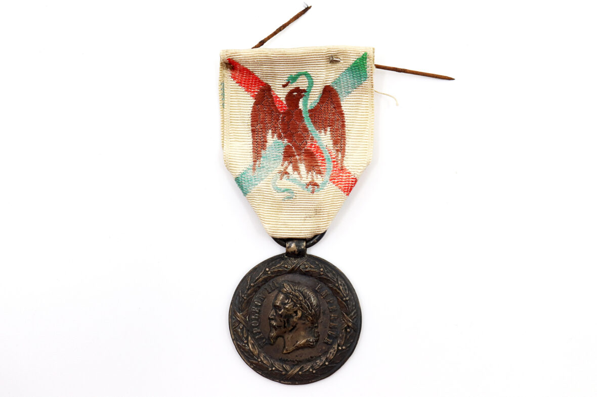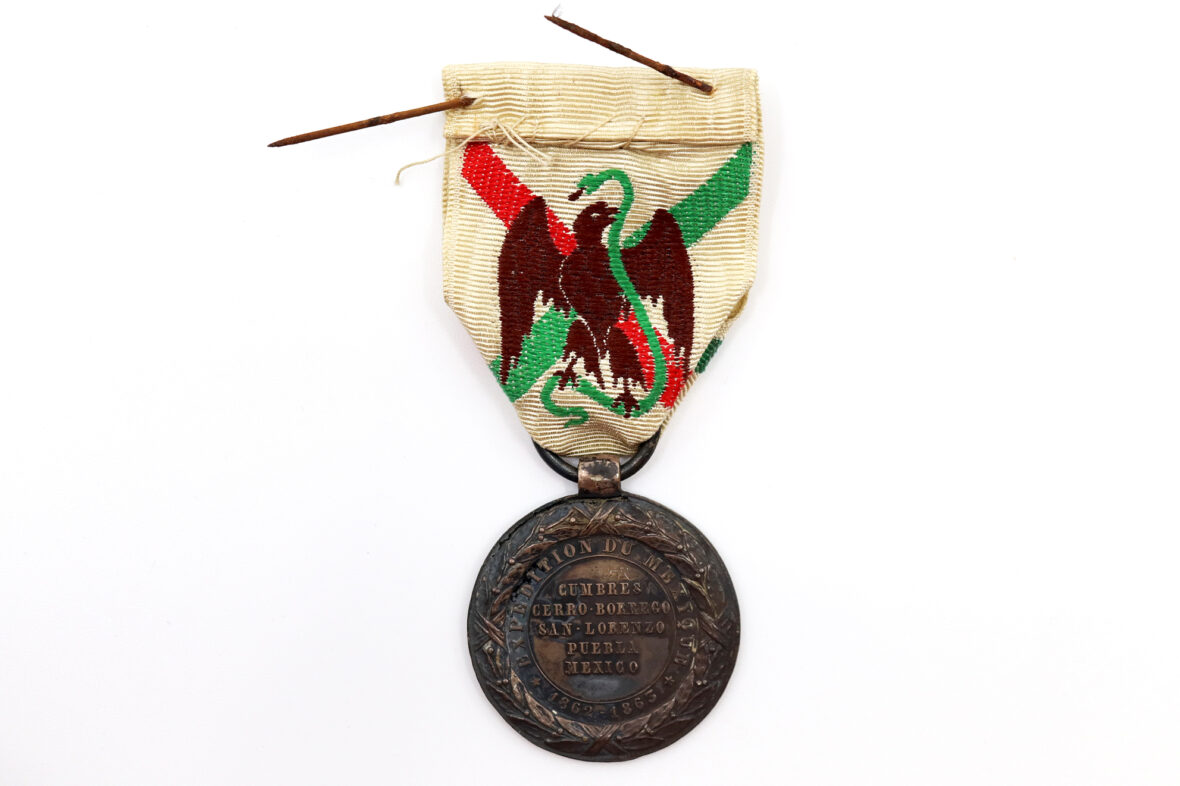 Médaille commémorative de la campagne du Mexique époque Napoléon III module rond biface en argent, rare variante gravée par « SACRISTAIN. F. ». Profil de l’empereur tête lauré sénestrogyre à l’avers et liste des batailles au revers « CUMBRES -CERRO BORREGO-SAN LORENZO-PUEBLA-MEXICO » entourées du texte « EXPEDITION DU MEXIQUE 1862-1863 ». Avec son ruban blanc insolé aux armes du Mexique (Aigle et serpent sur croix de st André rouge et verte).