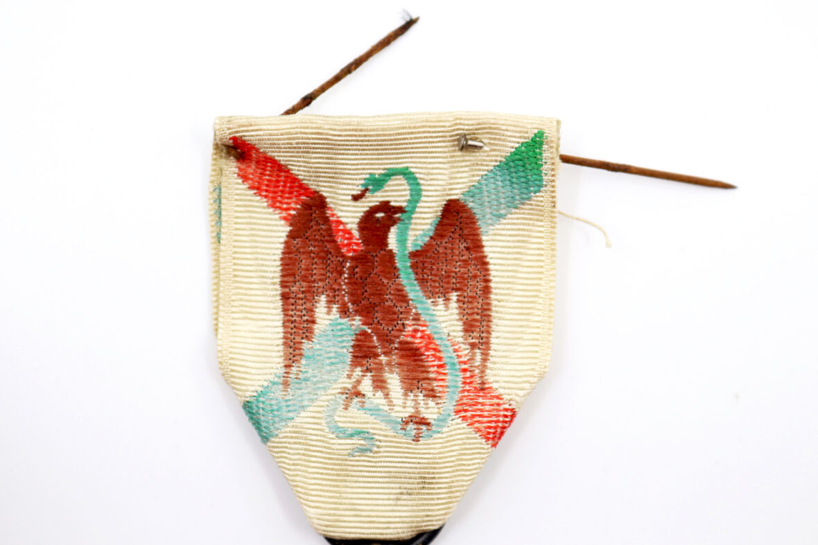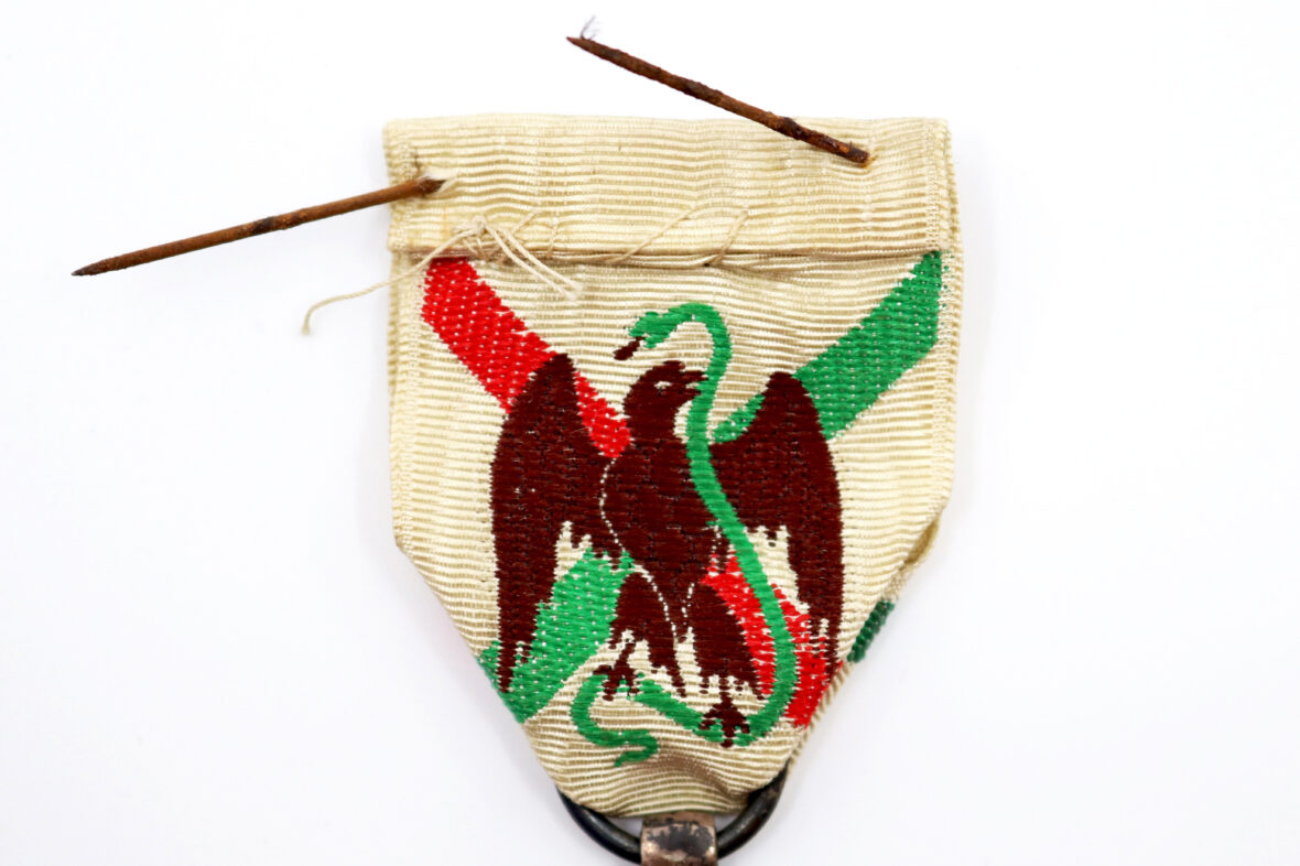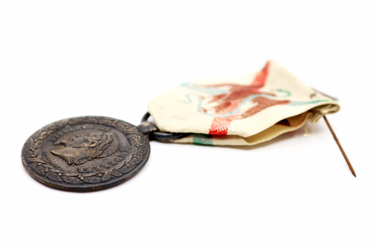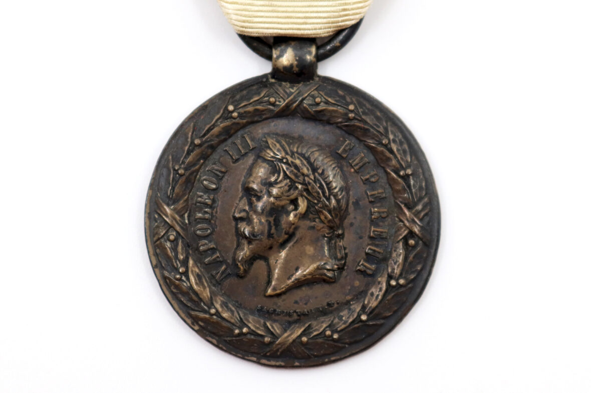 Médaille commémorative de la campagne du Mexique époque Napoléon III module rond biface en argent, rare variante gravée par « SACRISTAIN. F. ». Profil de l’empereur tête lauré sénestrogyre à l’avers et liste des batailles au revers « CUMBRES -CERRO BORREGO-SAN LORENZO-PUEBLA-MEXICO » entourées du texte « EXPEDITION DU MEXIQUE 1862-1863 ». Avec son ruban blanc insolé aux armes du Mexique (Aigle et serpent sur croix de st André rouge et verte).