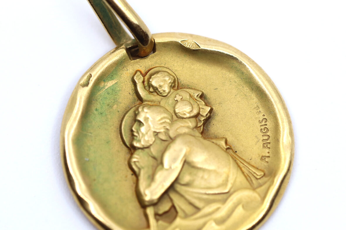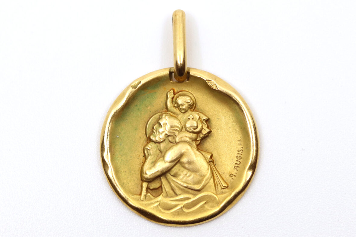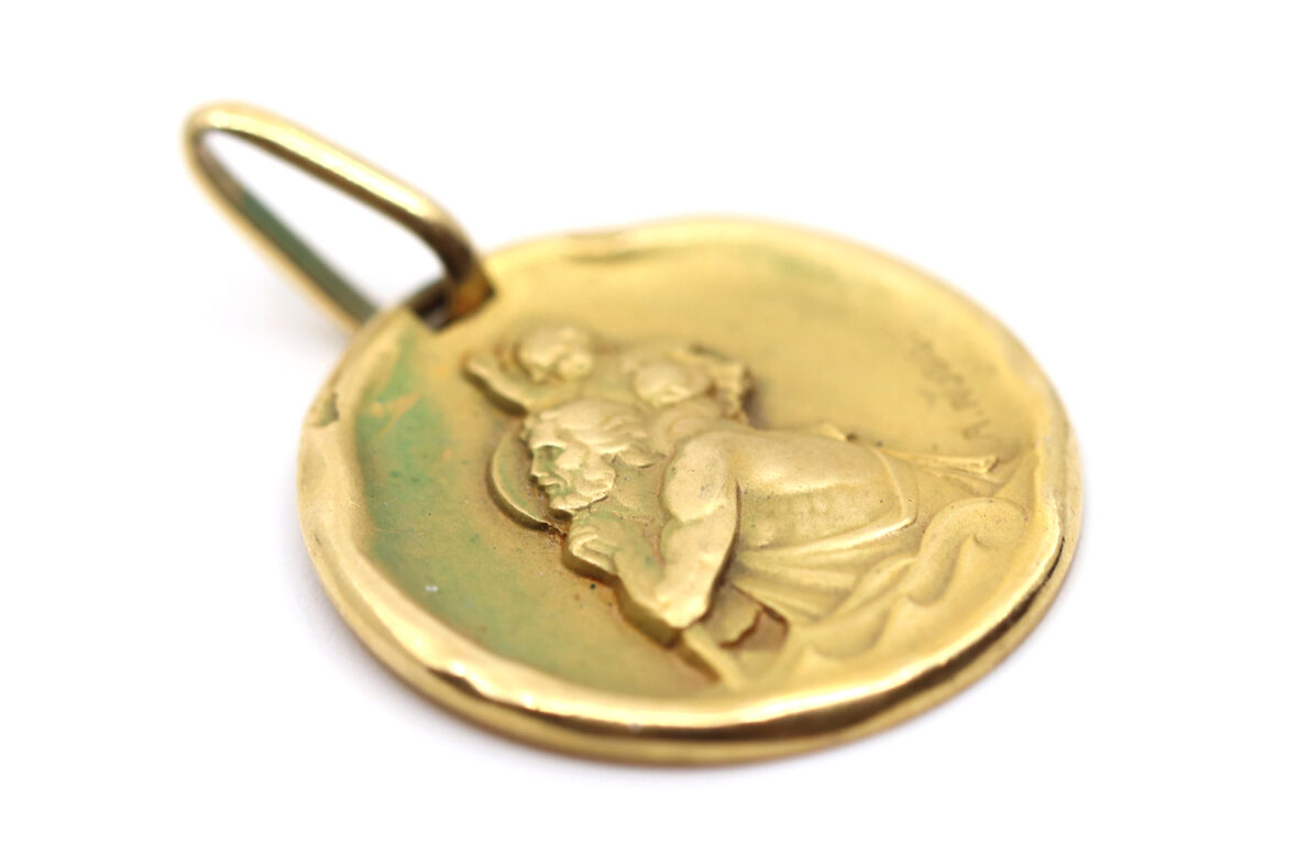 Médaille de baptême en or jaune à décor d’un Saint Christophe.