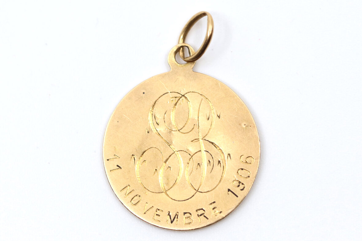 Médaille de baptême en or jaune à décor d’une Vierge à l’Enfant avec petites étoiles. Chiffrée et datée.