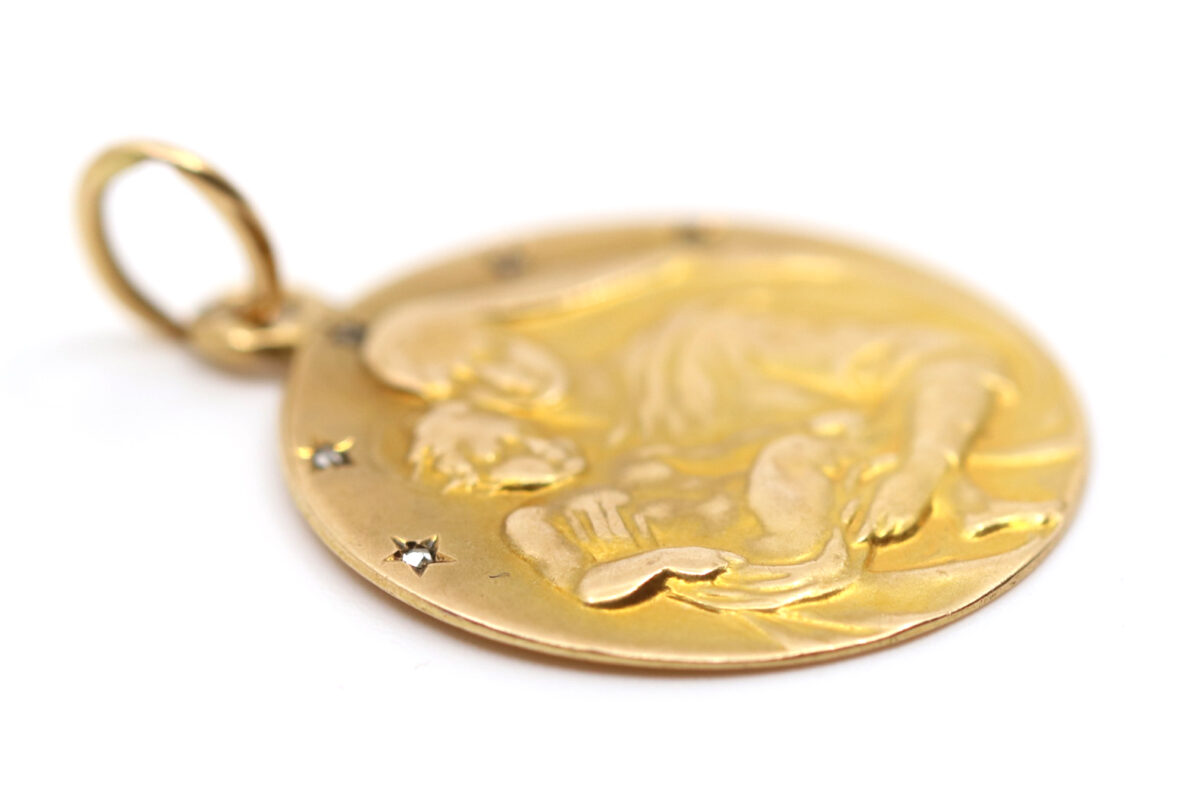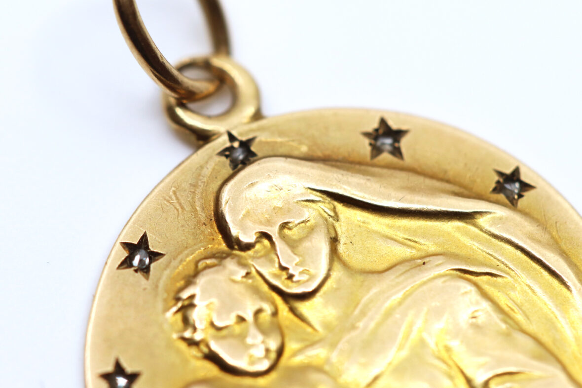 Médaille de baptême en or jaune à décor d’une Vierge à l’Enfant avec petites étoiles….