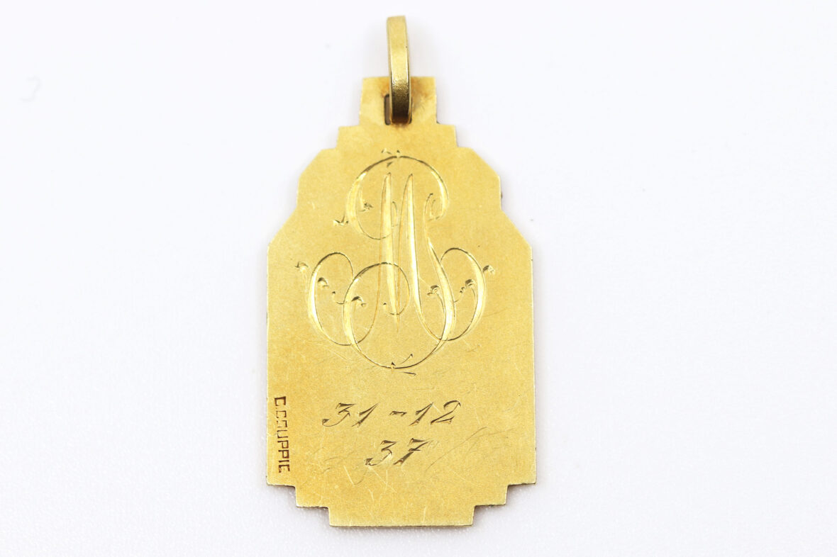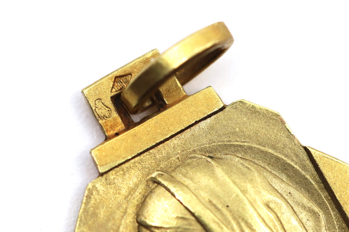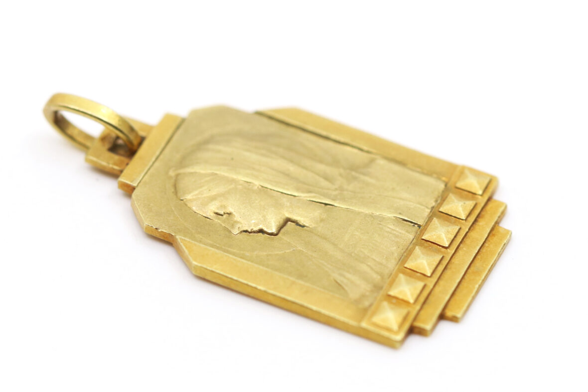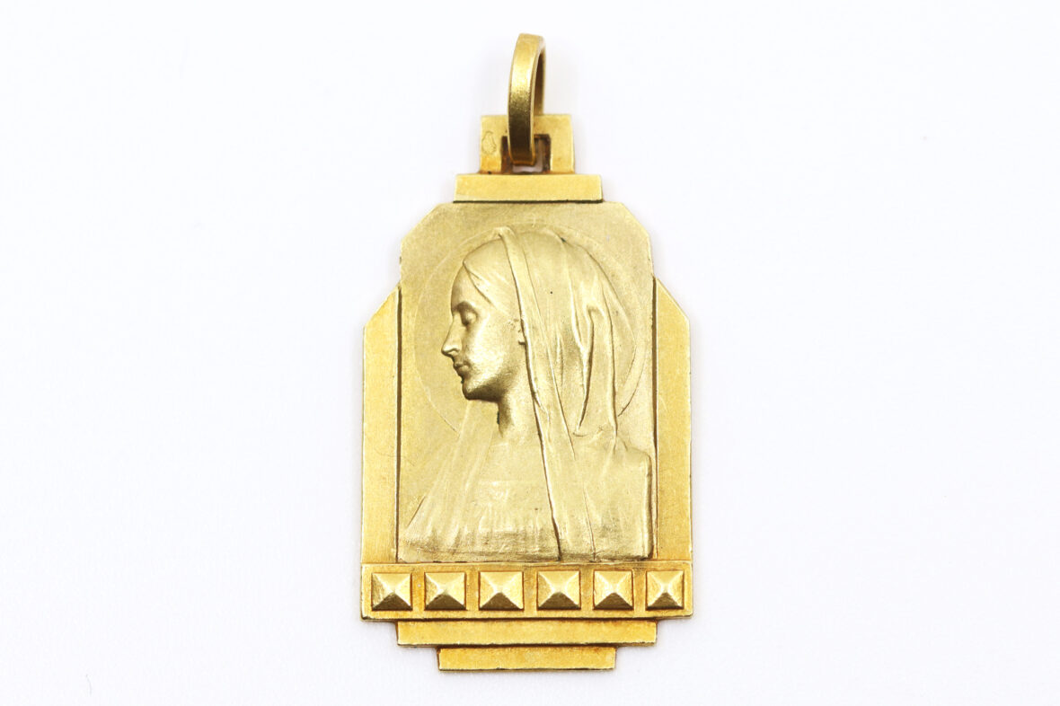 Médaille de baptême en or jaune de style art déco à décor du visage de la Vierge. Datée et chiffrée.