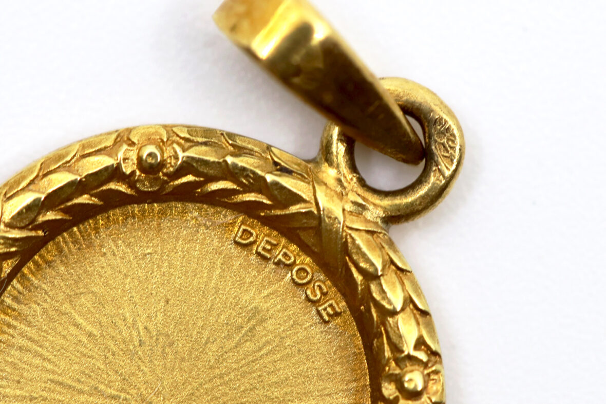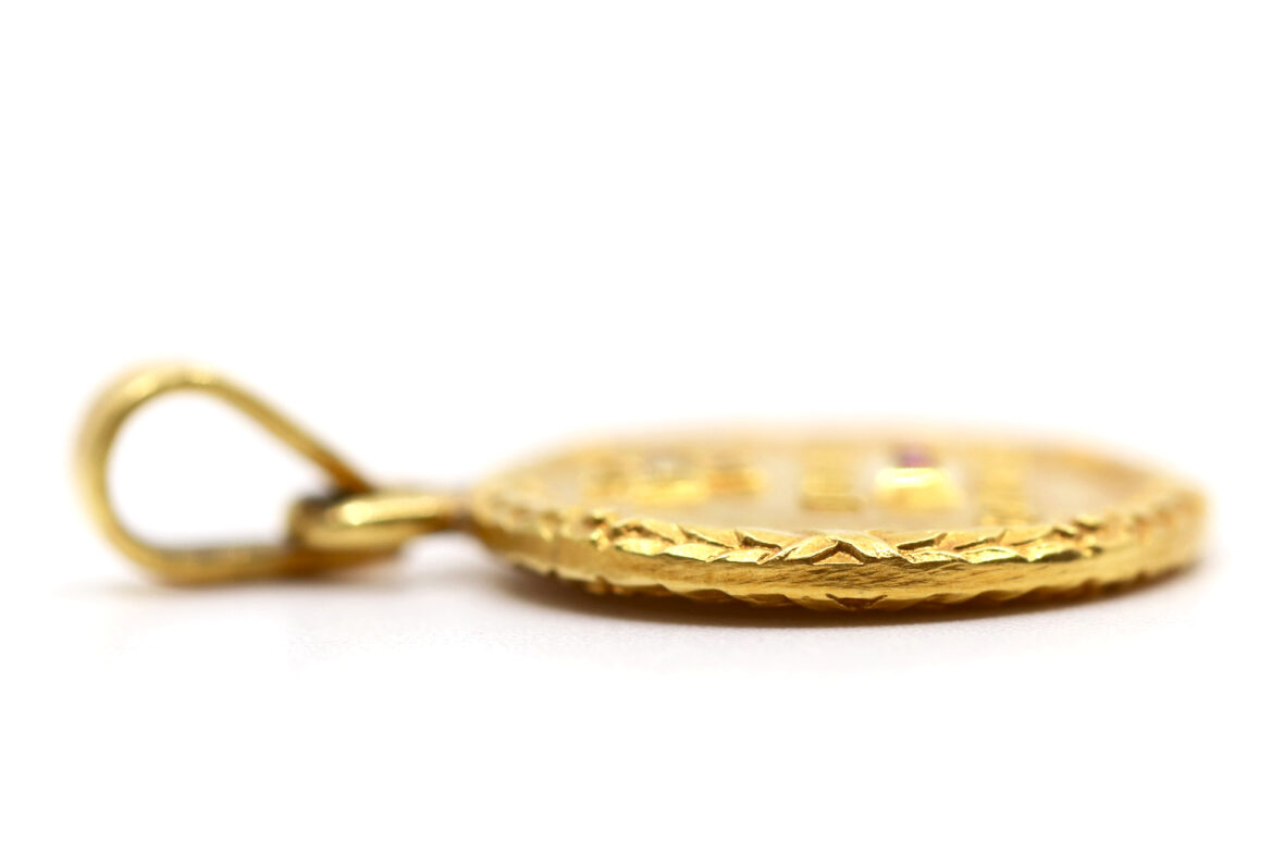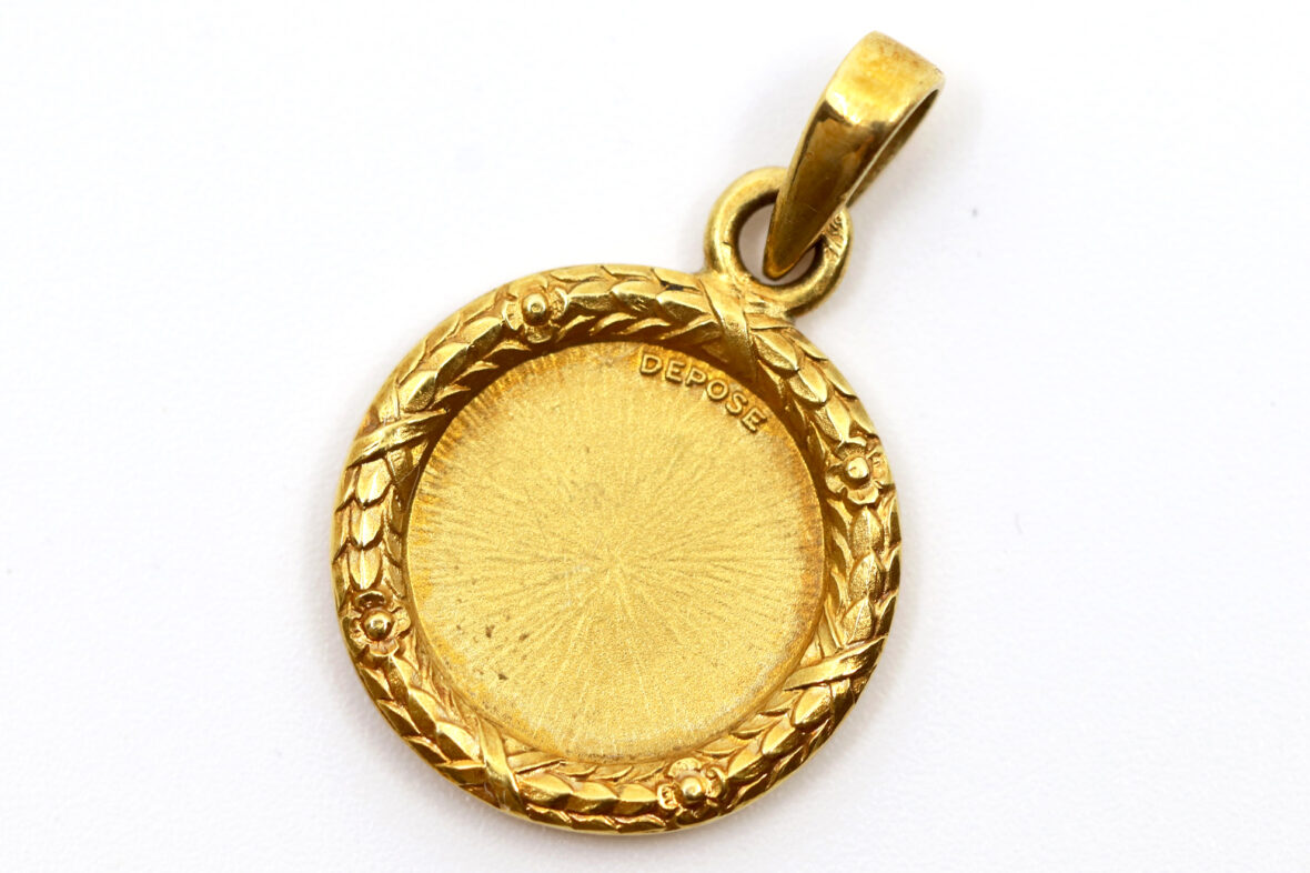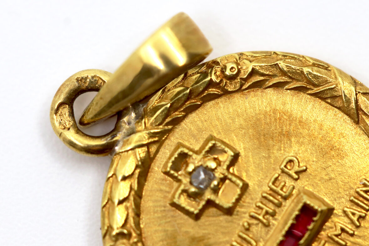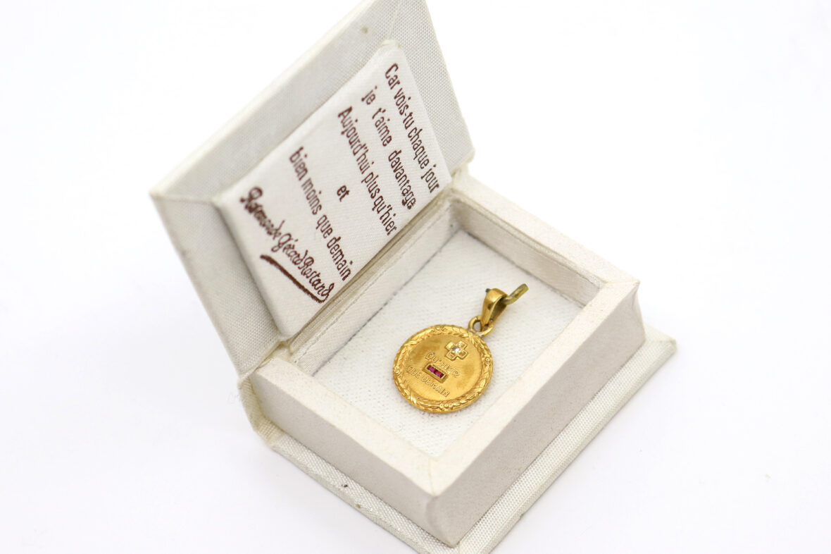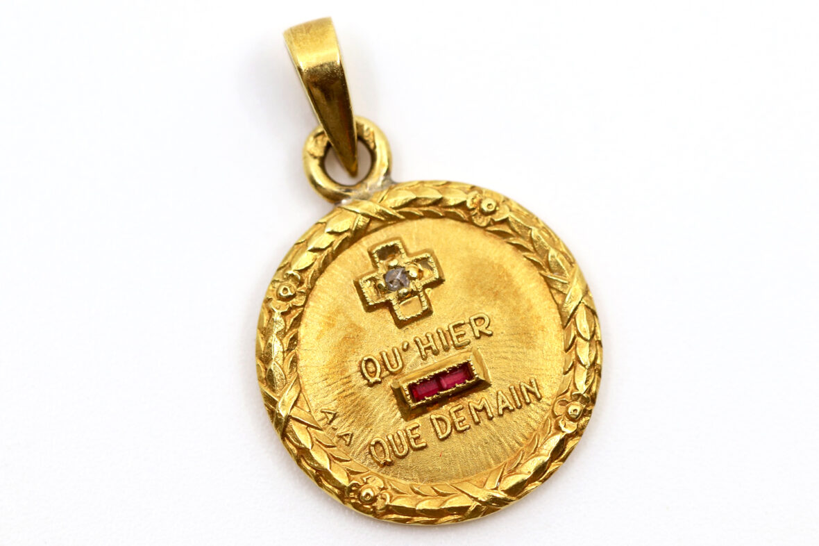 Médaille en or à décor d’une couronne de laurier et ornée d’une petite croix avec brillant « qu’hier, que demain ».