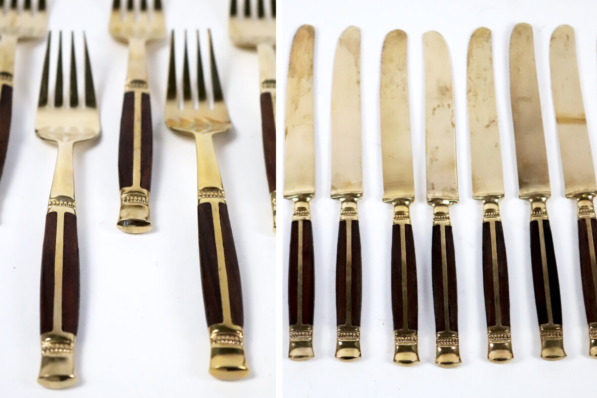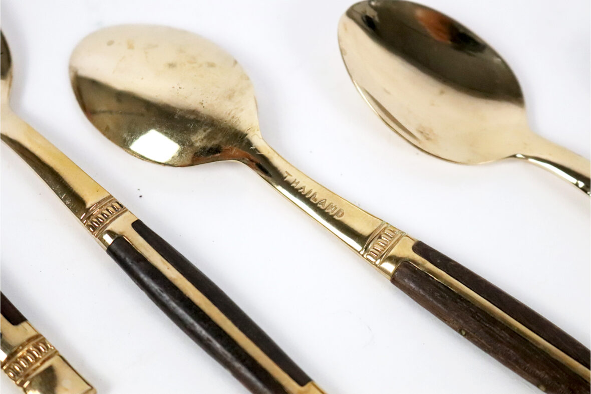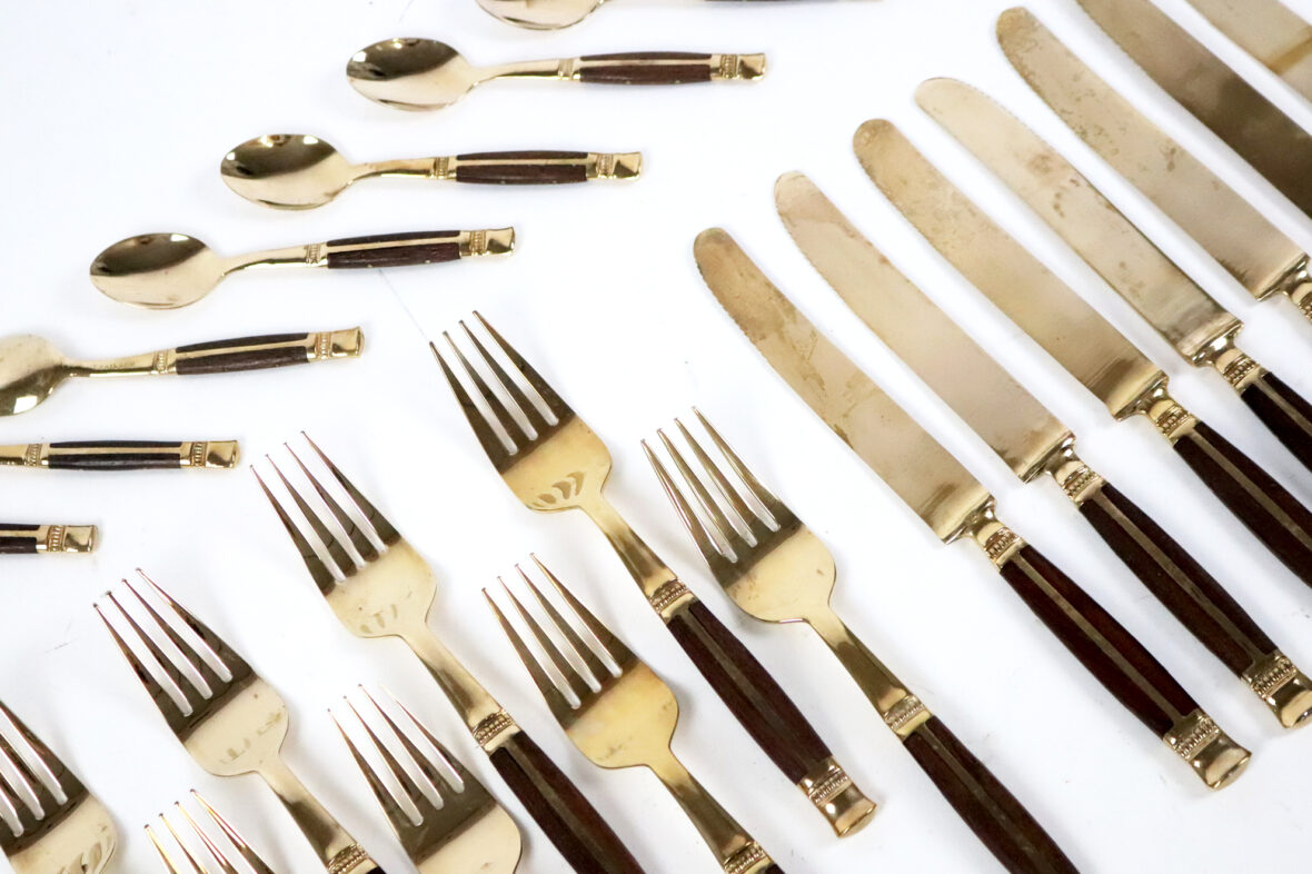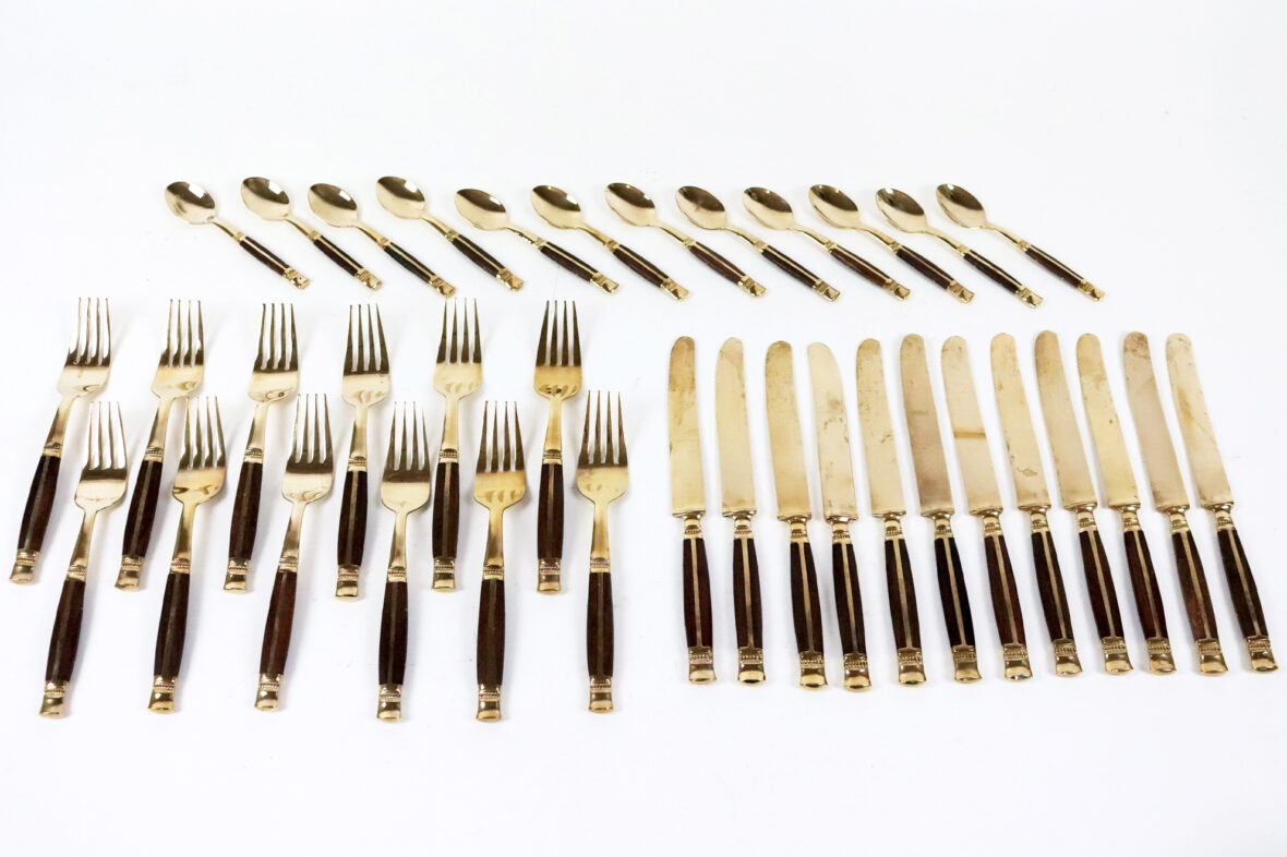 Ménagère en métal doré et manche partiellement en bois comprenant 12 couteaux, 12 fourchettes et 12 petites cuillères.