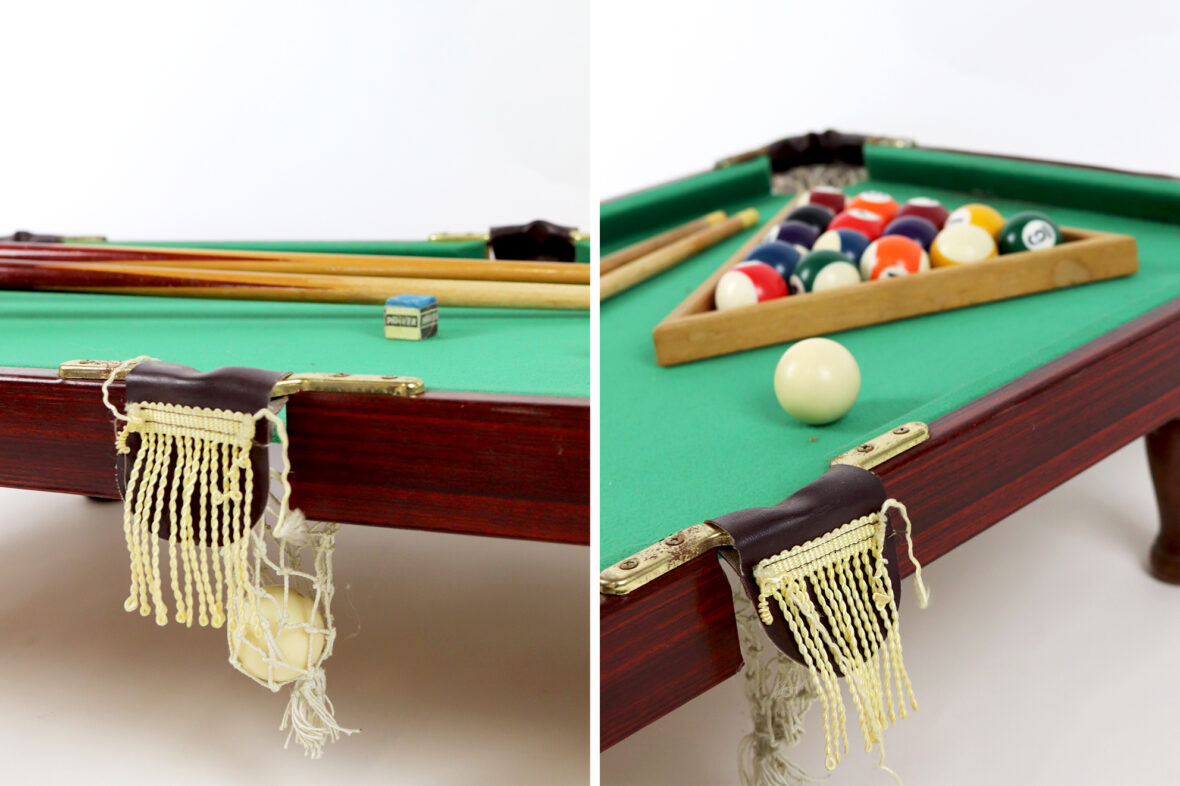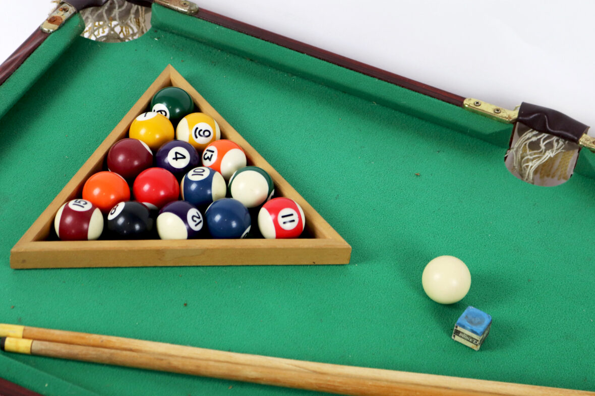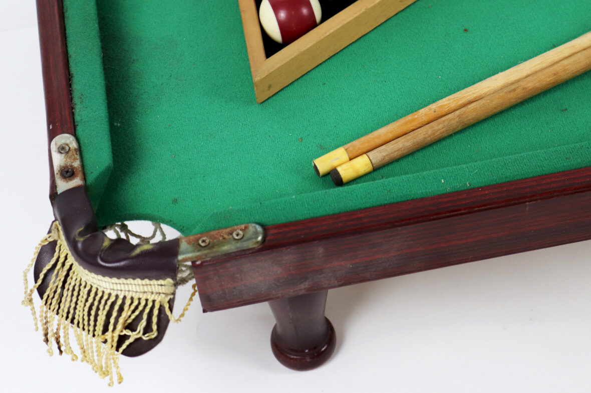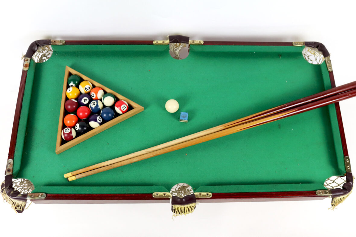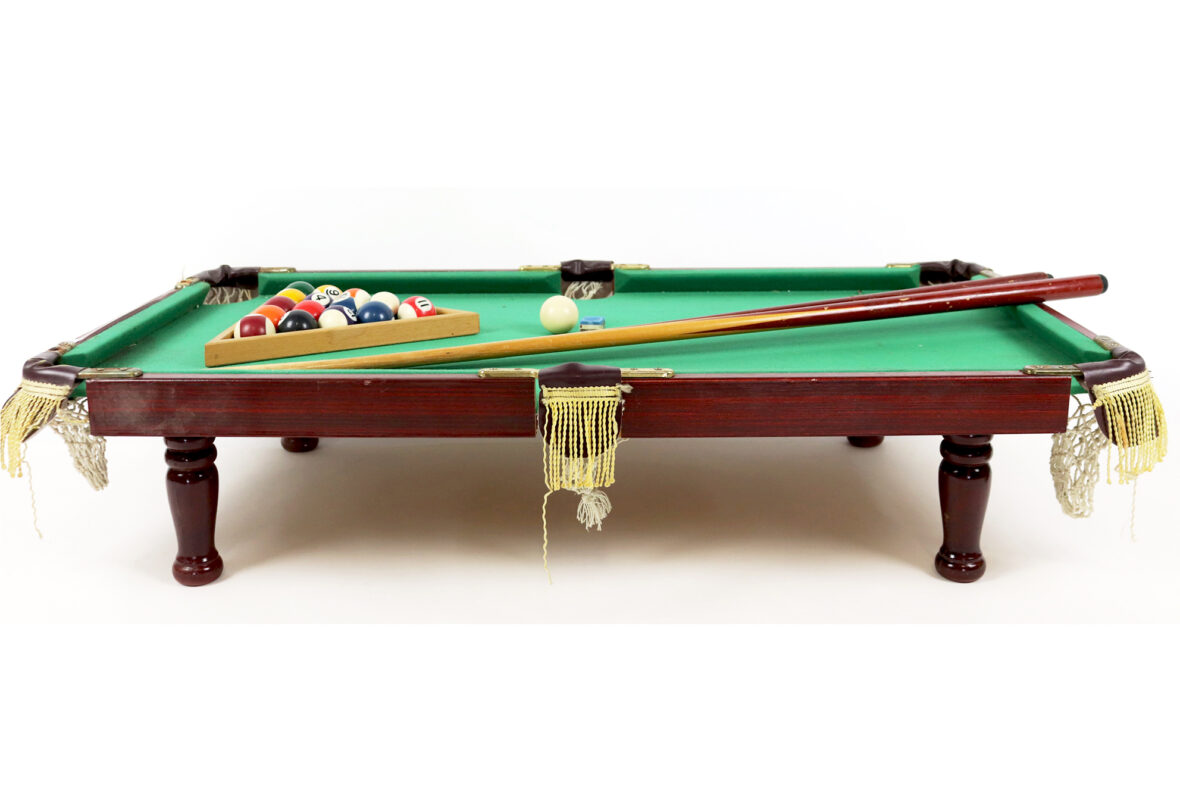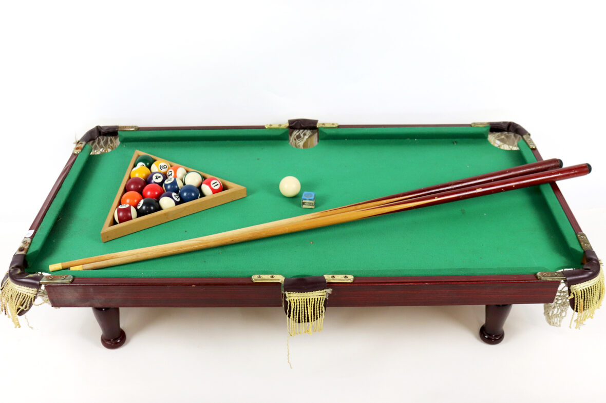 Mini-billard de table avec triangle, boules et deux queues.