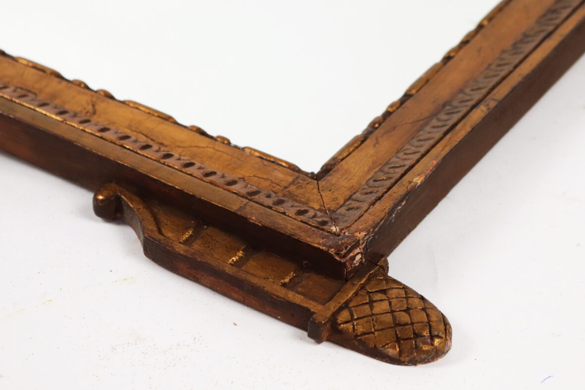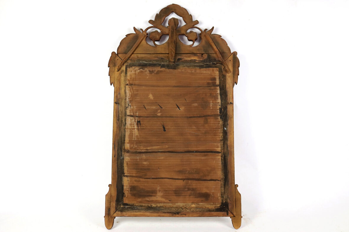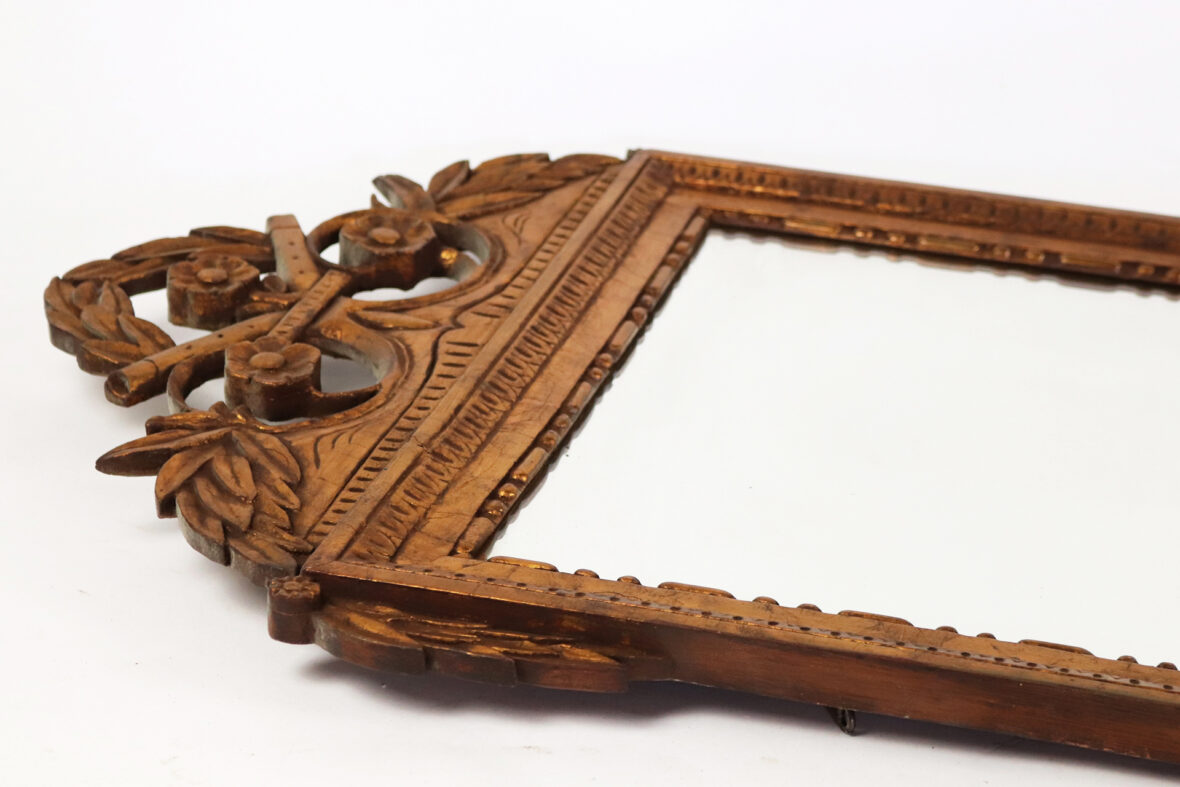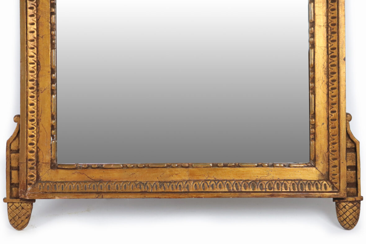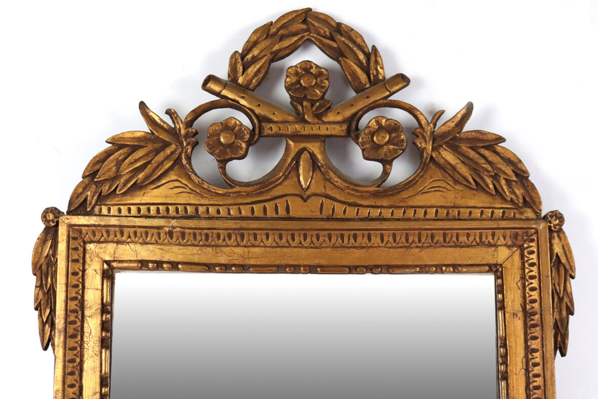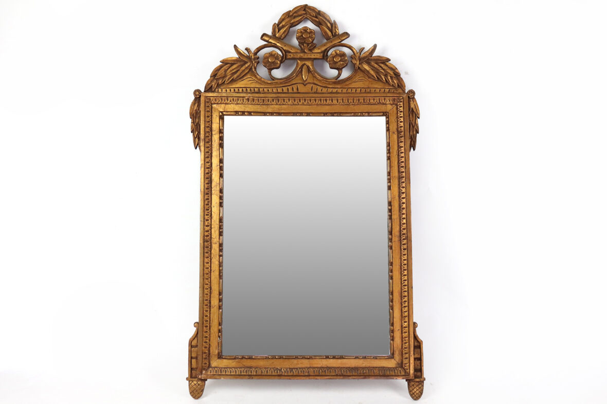Miroir de style Louis XVI en bois doré et sculpté à décor de frise rubané, le fronton à décor ajouré de laurier et fleurettes.