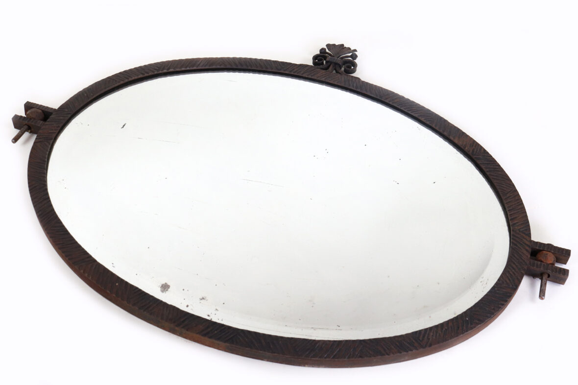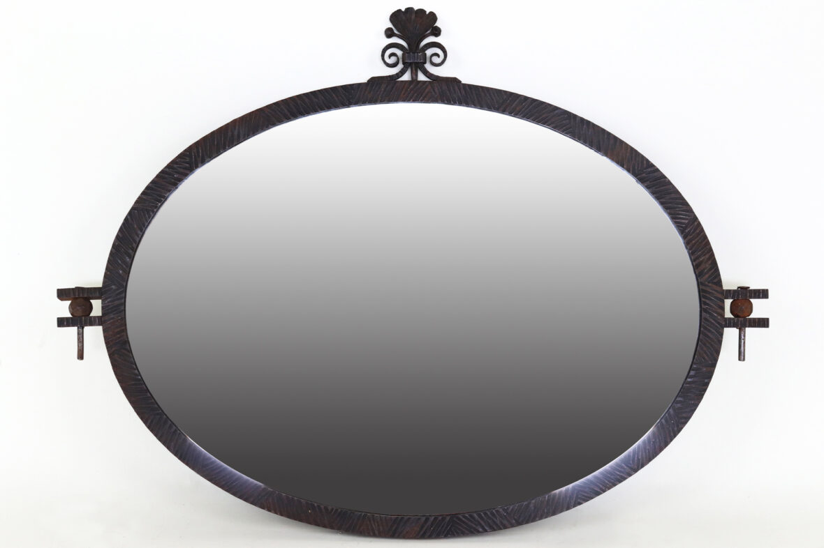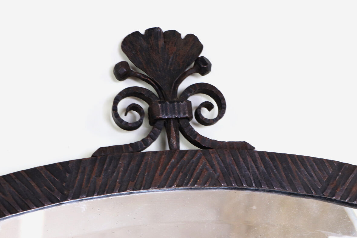 Miroir ovale en fer forgé sommé d’un bouquet stylisé. Epoque Art déco.